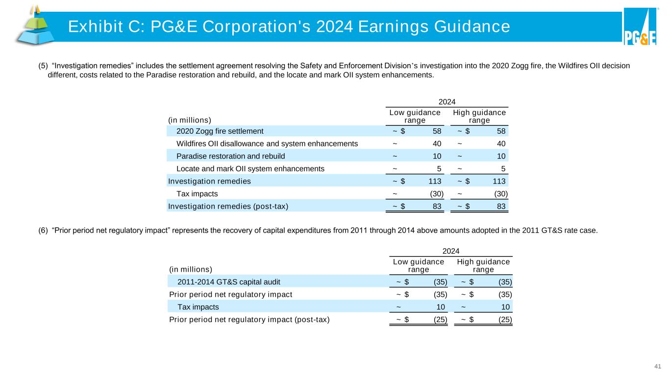 41 (6) “Prior period net regulatory impact” represents the recovery of capital expenditures from 2011 through 2014 above amounts adopted in the 2011 GT&S rate case. (5) “Investigation remedies” includes the settlement agreement resolving the Safety and Enforcement Division’s investigation into the 2020 Zogg fire, the Wildfires OII decision different, costs related to the Paradise restoration and rebuild, and the locate and mark OII system enhancements. 2024 (in millions) Low guidance range High guidance range 2020 Zogg fire settlement ~ $ 58 ~ $ 58 Wildfires OII disallowance and system enhancements ~ 40 ~ 40 Paradise restoration and rebuild ~ 10 ~ 10 Locate and mark OII system enhancements ~ 5 ~ 5 Investigation remedies ~ $ 113 ~ $ 113 Tax impacts ~ (30) ~ (30) Investigation remedies (post-tax) ~ $ 83 ~ $ 83 2024 (in millions) Low guidance range High guidance range 2011-2014 GT&S capital audit ~ $ (35) ~ $ (35) Prior period net regulatory impact ~ $ (35) ~ $ (35) Tax impacts ~ 10 ~ 10 Prior period net regulatory impact (post-tax) ~ $ (25) ~ $ (25) Exhibit C: PG&E Corporation's 2024 Earnings GuidanceExhibit C: PG&E Corpor tion's 20 4 Earnings Guidance