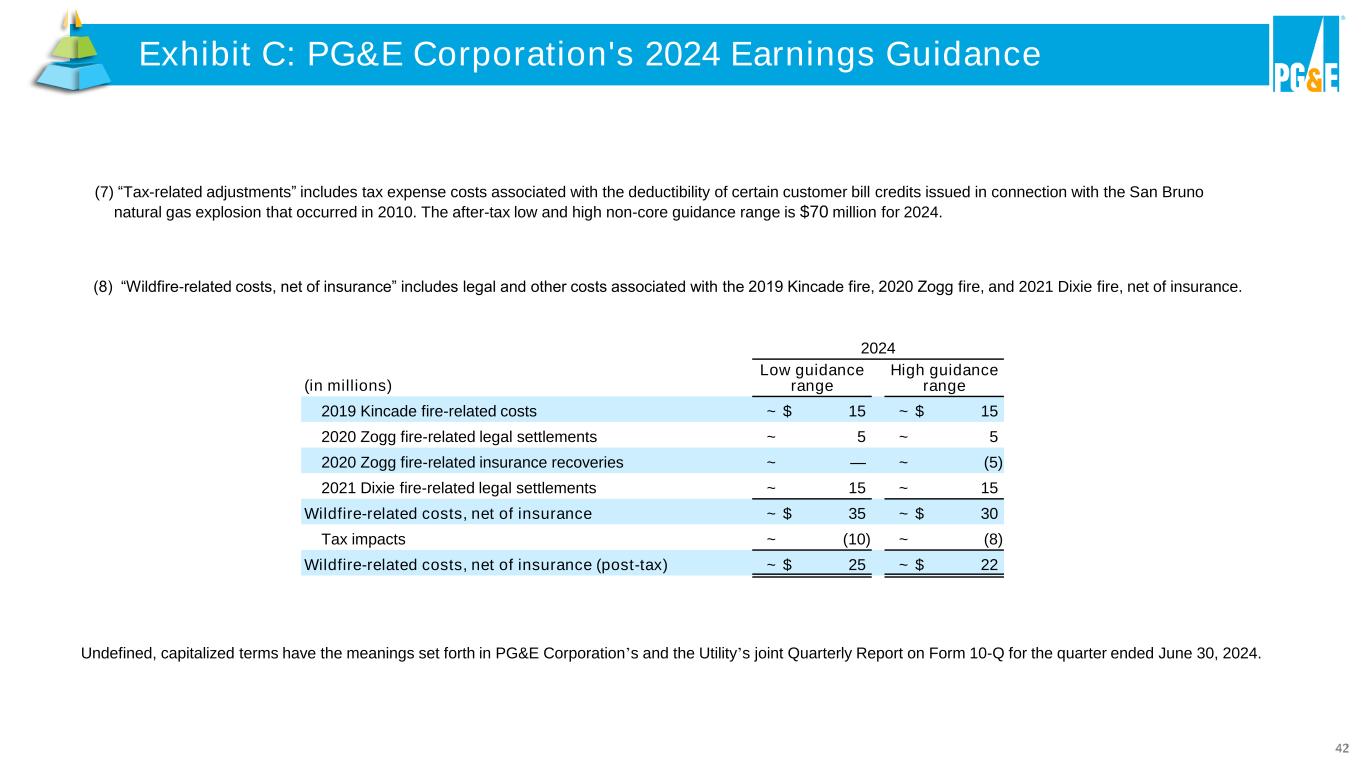 42 Undefined, capitalized terms have the meanings set forth in PG&E Corporation’s and the Utility’s joint Quarterly Report on Form 10-Q for the quarter ended June 30, 2024. (8) “Wildfire-related costs, net of insurance” includes legal and other costs associated with the 2019 Kincade fire, 2020 Zogg fire, and 2021 Dixie fire, net of insurance. 2024 (in millions) Low guidance range High guidance range 2019 Kincade fire-related costs ~ $ 15 ~ $ 15 2020 Zogg fire-related legal settlements ~ 5 ~ 5 2020 Zogg fire-related insurance recoveries ~ — ~ (5) 2021 Dixie fire-related legal settlements ~ 15 ~ 15 Wildfire-related costs, net of insurance ~ $ 35 ~ $ 30 Tax impacts ~ (10) ~ (8) Wildfire-related costs, net of insurance (post-tax) ~ $ 25 ~ $ 22 Exhibit C: PG&E Corporation's 2024 Earnings GuidanceExhibit C: PG&E Corpor tion's 20 4 Earnings Guidance (7) “Tax-related adjustments” includes tax expense costs associated with the deductibility of certain customer bill credits issued in connection with the San Bruno natural gas explosion that occurred in 2010. The after-tax low and high non-core guidance range is $70 million for 2024.