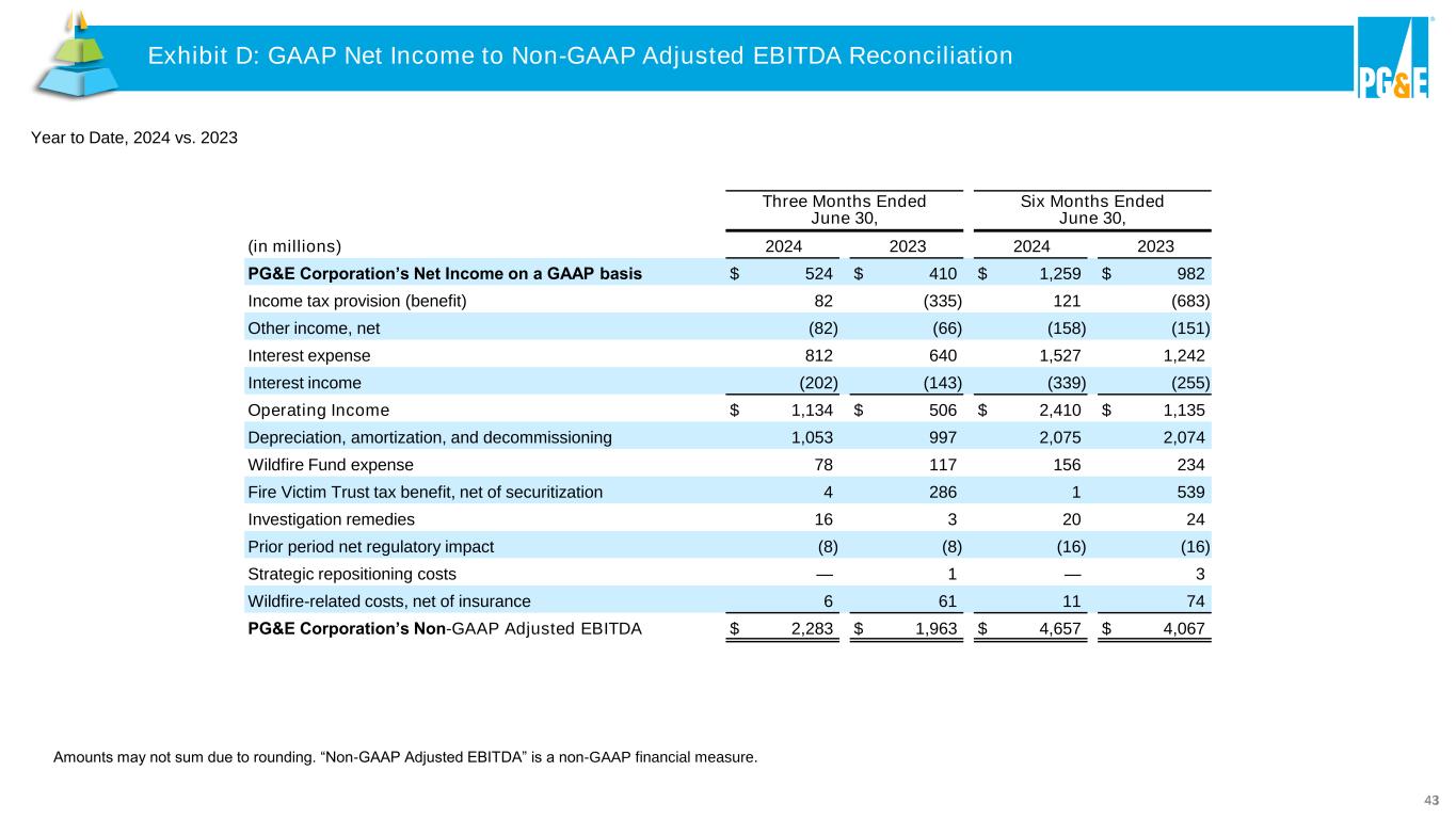 43 Three Months Ended June 30, Six Months Ended June 30, (in millions) 2024 2023 2024 2023 PG&E Corporation’s Net Income on a GAAP basis $ 524 $ 410 $ 1,259 $ 982 Income tax provision (benefit) 82 (335) 121 (683) Other income, net (82) (66) (158) (151) Interest expense 812 640 1,527 1,242 Interest income (202) (143) (339) (255) Operating Income $ 1,134 $ 506 $ 2,410 $ 1,135 Depreciation, amortization, and decommissioning 1,053 997 2,075 2,074 Wildfire Fund expense 78 117 156 234 Fire Victim Trust tax benefit, net of securitization 4 286 1 539 Investigation remedies 16 3 20 24 Prior period net regulatory impact (8) (8) (16) (16) Strategic repositioning costs — 1 — 3 Wildfire-related costs, net of insurance 6 61 11 74 PG&E Corporation’s Non-GAAP Adjusted EBITDA $ 2,283 $ 1,963 $ 4,657 $ 4,067 Year to Date, 2024 vs. 2023 Amounts may not sum due to rounding. “Non-GAAP Adjusted EBITDA” is a non-GAAP financial measure. Exhibit D: GAAP Net Income to Non-GAAP Adjusted EBITDA Reconciliation PG&E CorporationExhibit D: GAAP Net Income to Non-GAAP Adjusted EBITDA Reconciliation
