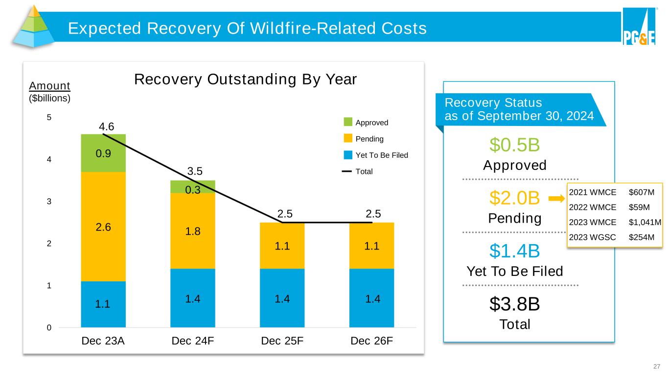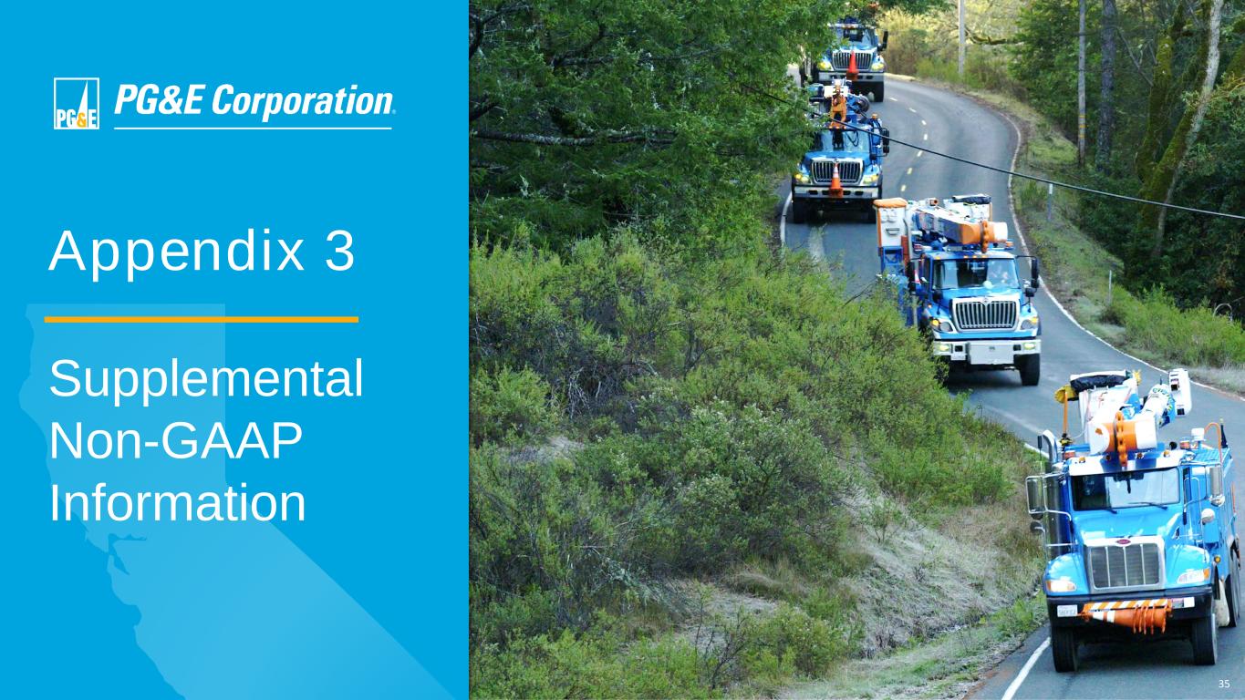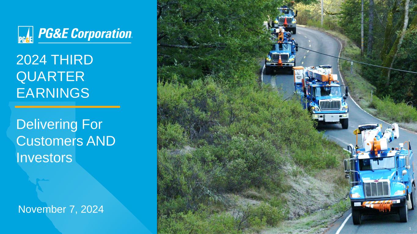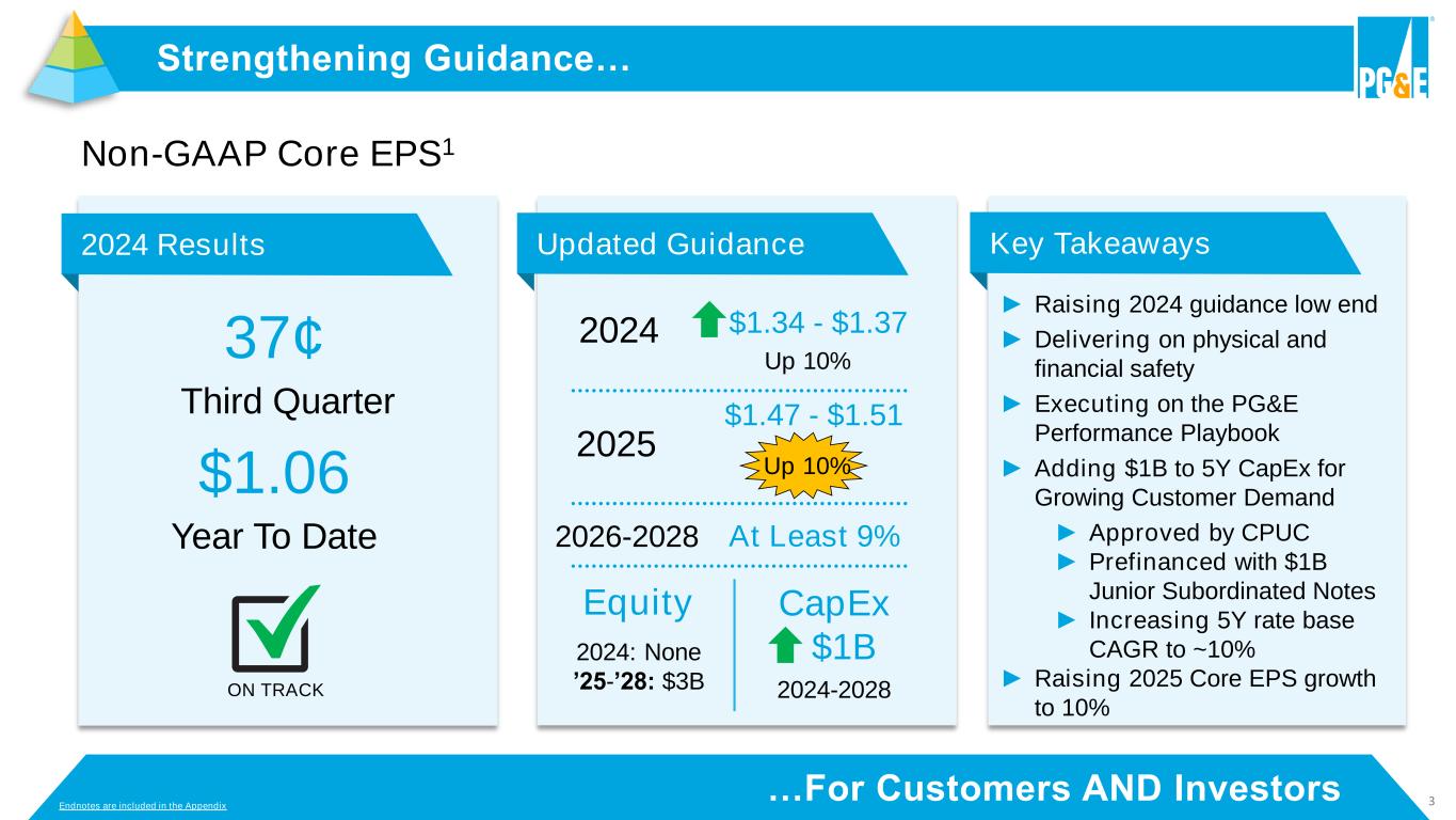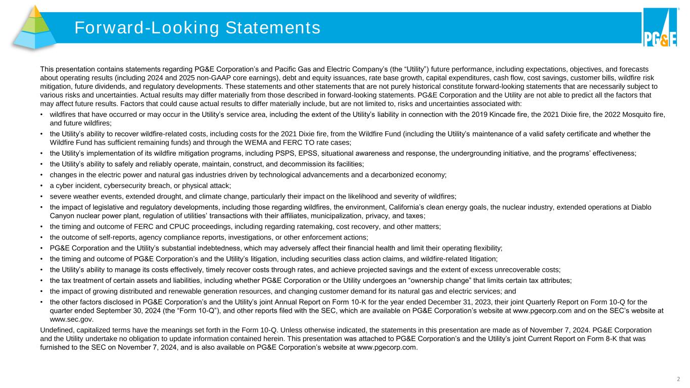 2 This presentation contains statements regarding PG&E Corporation’s and Pacific Gas and Electric Company’s (the “Utility”) future performance, including expectations, objectives, and forecasts about operating results (including 2024 and 2025 non-GAAP core earnings), debt and equity issuances, rate base growth, capital expenditures, cash flow, cost savings, customer bills, wildfire risk mitigation, future dividends, and regulatory developments. These statements and other statements that are not purely historical constitute forward-looking statements that are necessarily subject to various risks and uncertainties. Actual results may differ materially from those described in forward-looking statements. PG&E Corporation and the Utility are not able to predict all the factors that may affect future results. Factors that could cause actual results to differ materially include, but are not limited to, risks and uncertainties associated with: • wildfires that have occurred or may occur in the Utility’s service area, including the extent of the Utility’s liability in connection with the 2019 Kincade fire, the 2021 Dixie fire, the 2022 Mosquito fire, and future wildfires; • the Utility’s ability to recover wildfire-related costs, including costs for the 2021 Dixie fire, from the Wildfire Fund (including the Utility’s maintenance of a valid safety certificate and whether the Wildfire Fund has sufficient remaining funds) and through the WEMA and FERC TO rate cases; • the Utility’s implementation of its wildfire mitigation programs, including PSPS, EPSS, situational awareness and response, the undergrounding initiative, and the programs’ effectiveness; • the Utility’s ability to safely and reliably operate, maintain, construct, and decommission its facilities; • changes in the electric power and natural gas industries driven by technological advancements and a decarbonized economy; • a cyber incident, cybersecurity breach, or physical attack; • severe weather events, extended drought, and climate change, particularly their impact on the likelihood and severity of wildfires; • the impact of legislative and regulatory developments, including those regarding wildfires, the environment, California’s clean energy goals, the nuclear industry, extended operations at Diablo Canyon nuclear power plant, regulation of utilities’ transactions with their affiliates, municipalization, privacy, and taxes; • the timing and outcome of FERC and CPUC proceedings, including regarding ratemaking, cost recovery, and other matters; • the outcome of self-reports, agency compliance reports, investigations, or other enforcement actions; • PG&E Corporation and the Utility’s substantial indebtedness, which may adversely affect their financial health and limit their operating flexibility; • the timing and outcome of PG&E Corporation’s and the Utility’s litigation, including securities class action claims, and wildfire-related litigation; • the Utility’s ability to manage its costs effectively, timely recover costs through rates, and achieve projected savings and the extent of excess unrecoverable costs; • the tax treatment of certain assets and liabilities, including whether PG&E Corporation or the Utility undergoes an “ownership change” that limits certain tax attributes; • the impact of growing distributed and renewable generation resources, and changing customer demand for its natural gas and electric services; and • the other factors disclosed in PG&E Corporation’s and the Utility’s joint Annual Report on Form 10-K for the year ended December 31, 2023, their joint Quarterly Report on Form 10-Q for the quarter ended September 30, 2024 (the “Form 10-Q”), and other reports filed with the SEC, which are available on PG&E Corporation’s website at www.pgecorp.com and on the SEC’s website at www.sec.gov. Undefined, capitalized terms have the meanings set forth in the Form 10-Q. Unless otherwise indicated, the statements in this presentation are made as of November 7, 2024. PG&E Corporation and the Utility undertake no obligation to update information contained herein. This presentation was attached to PG&E Corporation’s and the Utility’s joint Current Report on Form 8-K that was furnished to the SEC on November 7, 2024, and is also available on PG&E Corporation’s website at www.pgecorp.com. Forward-Looking Statements
