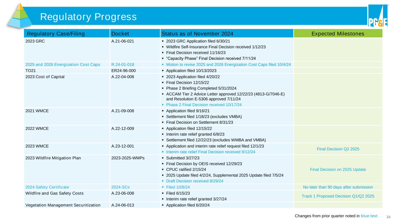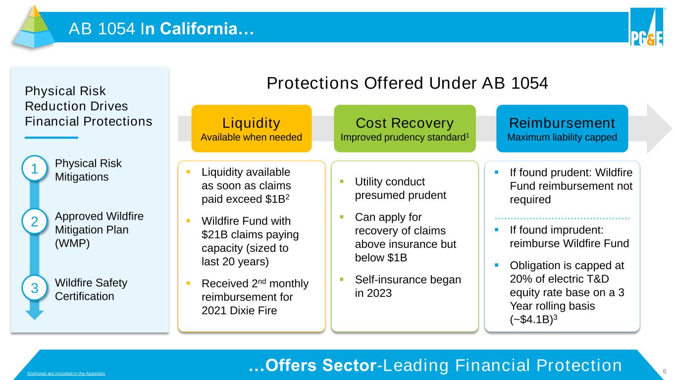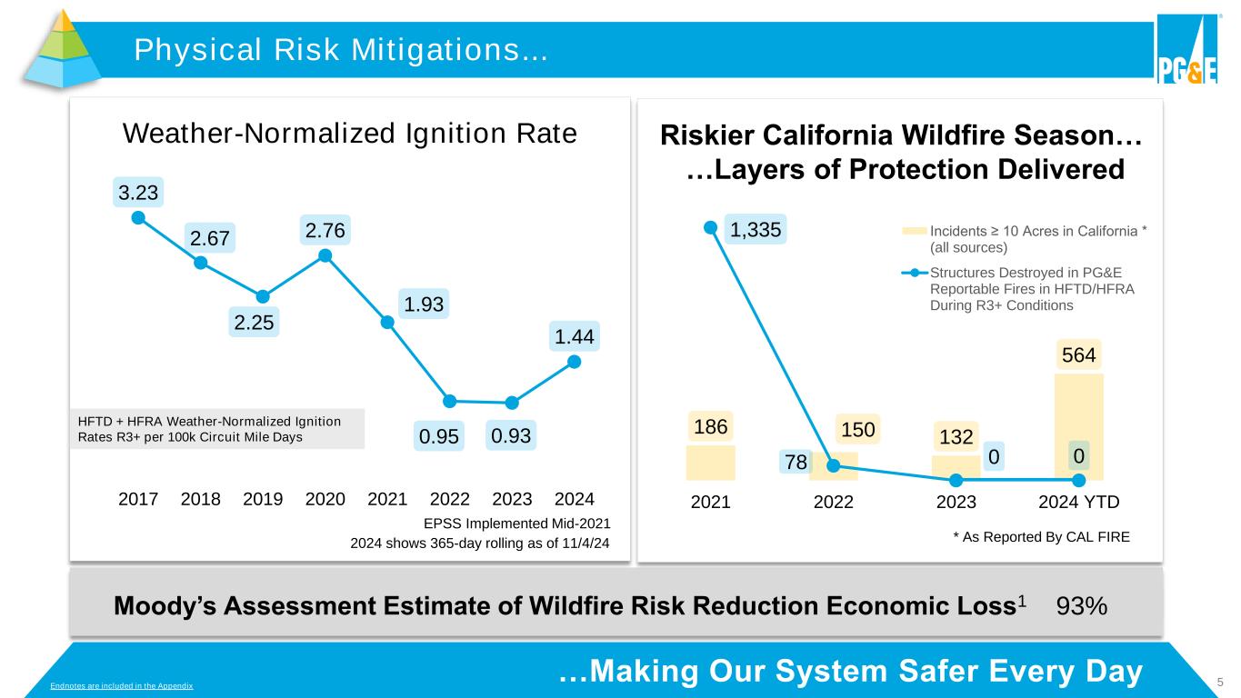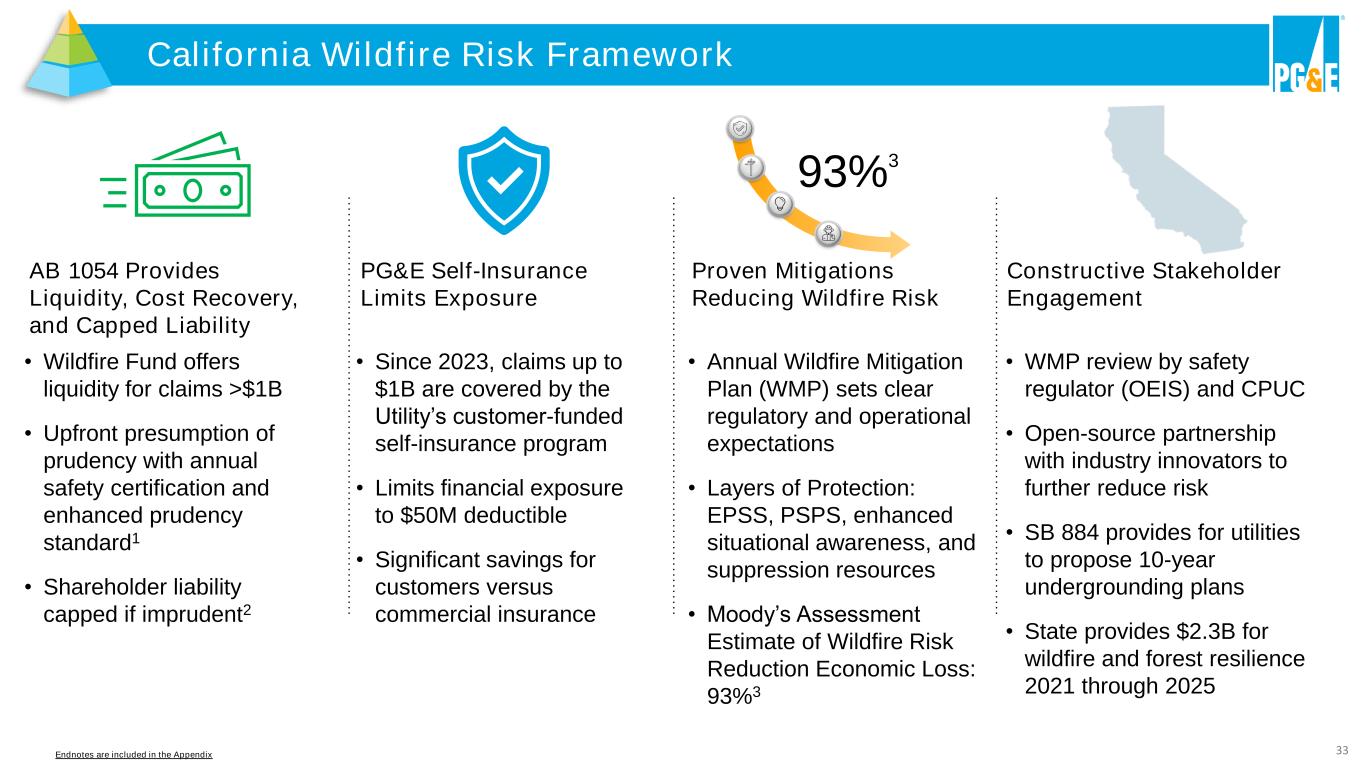 33 California Wildfire Risk Framework AB 1054 Provides Liquidity, Cost Recovery, and Capped Liability • Wildfire Fund offers liquidity for claims >$1B • Upfront presumption of prudency with annual safety certification and enhanced prudency standard1 • Shareholder liability capped if imprudent2 Constructive Stakeholder Engagement • WMP review by safety regulator (OEIS) and CPUC • Open-source partnership with industry innovators to further reduce risk • SB 884 provides for utilities to propose 10-year undergrounding plans • State provides $2.3B for wildfire and forest resilience 2021 through 2025 PG&E Self-Insurance Limits Exposure • Since 2023, claims up to $1B are covered by the Utility’s customer-funded self-insurance program • Limits financial exposure to $50M deductible • Significant savings for customers versus commercial insurance Proven Mitigations Reducing Wildfire Risk • Annual Wildfire Mitigation Plan (WMP) sets clear regulatory and operational expectations • Layers of Protection: EPSS, PSPS, enhanced situational awareness, and suppression resources • Moody’s Assessment Estimate of Wildfire Risk Reduction Economic Loss: 93%3 93%3 Endnotes are included in the Appendix