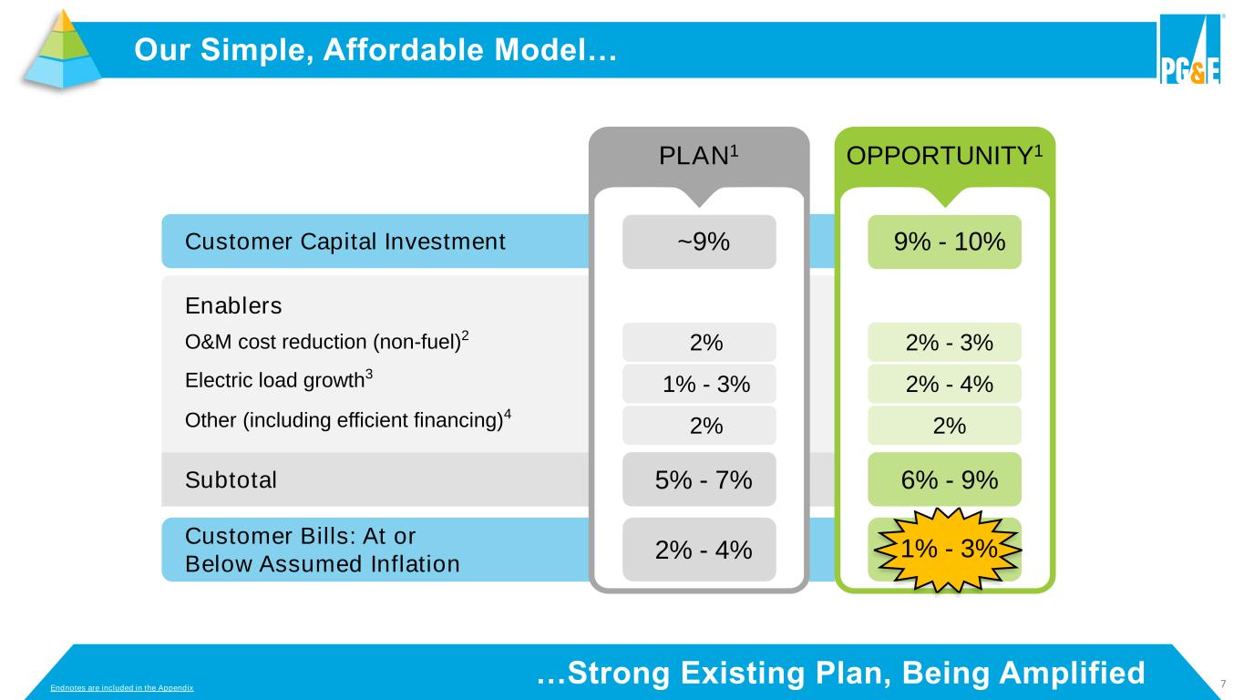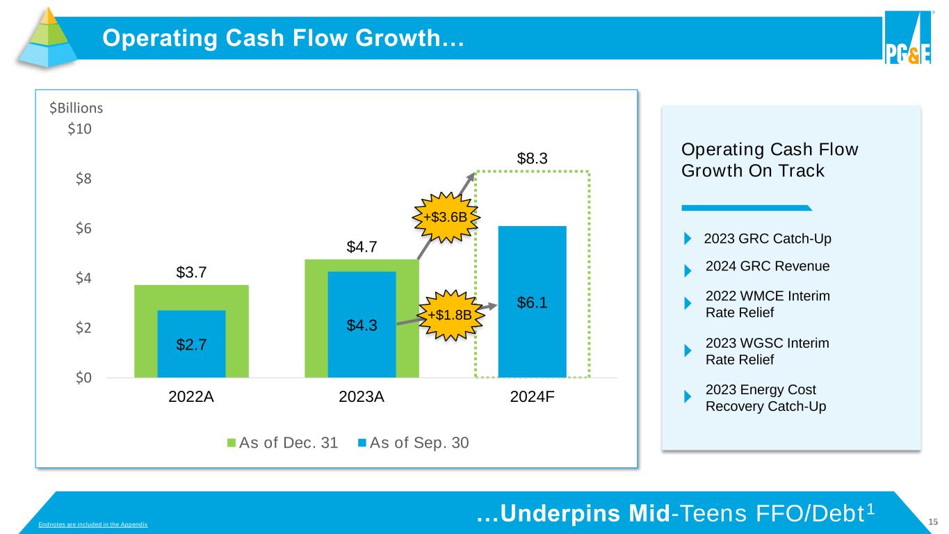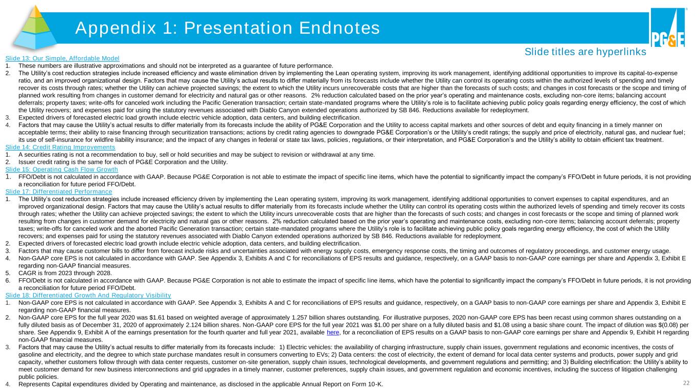22 Appendix 1: Presentation Endnotes Slide titles are hyperlinks Slide 13: Our Simple, Affordable Model 1. These numbers are illustrative approximations and should not be interpreted as a guarantee of future performance. 2. The Utility’s cost reduction strategies include increased efficiency and waste elimination driven by implementing the Lean operating system, improving its work management, identifying additional opportunities to improve its capital-to-expense ratio, and an improved organizational design. Factors that may cause the Utility’s actual results to differ materially from i ts forecasts include whether the Utility can control its operating costs within the authorized levels of spending and timely recover its costs through rates; whether the Utility can achieve projected savings; the extent to which the Utility incurs unrecoverable costs that are higher than the forecasts of such costs; and changes in cost forecasts or the scope and timing of planned work resulting from changes in customer demand for electricity and natural gas or other reasons. 2% reduction calculated based on the prior year’s operating and maintenance costs, excluding non-core items; balancing account deferrals; property taxes; write-offs for canceled work including the Pacific Generation transaction; certain state-mandated programs where the Utility’s role is to facilitate achieving public policy goals regarding energy efficiency, the cost of which the Utility recovers; and expenses paid for using the statutory revenues associated with Diablo Canyon extended operations authorized by SB 846. Reductions available for redeployment. 3. Expected drivers of forecasted electric load growth include electric vehicle adoption, data centers, and building electrification. 4. Factors that may cause the Utility’s actual results to differ materially from its forecasts include the ability of PG&E Corporation and the Utility to access capital markets and other sources of debt and equity financing in a timely manner on acceptable terms; their ability to raise financing through securitization transactions; actions by credit rating agencies to downgrade PG&E Corporation’s or the Utility’s credit ratings; the supply and price of electricity, natural gas, and nuclear fuel ; its use of self-insurance for wildfire liability insurance; and the impact of any changes in federal or state tax laws, policies , regulations, or their interpretation, and PG&E Corporation’s and the Utility’s ability to obtain efficient tax treatment. Slide 14: Credit Rating Improvements 1. A securities rating is not a recommendation to buy, sell or hold securities and may be subject to revision or withdrawal at any time. 2. Issuer credit rating is the same for each of PG&E Corporation and the Utility. Slide 15: Operating Cash Flow Growth 1. FFO/Debt is not calculated in accordance with GAAP. Because PG&E Corporation is not able to estimate the impact of specific l ine items, which have the potential to significantly impact the company’s FFO/Debt in future periods, it is not providing a reconciliation for future period FFO/Debt. Slide 17: Differentiated Performance 1. The Utility’s cost reduction strategies include increased efficiency driven by implementing the Lean operating system, improving its work management, identifying additional opportunities to convert expenses to capital expenditures, and an improved organizational design. Factors that may cause the Utility’s actual results to differ materially from its forecasts include whether the Utility can control its operating costs within the authorized levels of spending and timely recover its costs through rates; whether the Utility can achieve projected savings; the extent to which the Utility incurs unrecoverable costs that are higher than the forecasts of such costs; and changes in cost forecasts or the scope and timing of planned work resulting from changes in customer demand for electricity and natural gas or other reasons. 2% reduction calculated based on the prior year’s operating and maintenance costs, excluding non-core items; balancing account deferrals; property taxes; write-offs for canceled work and the aborted Pacific Generation transaction; certain state-mandated programs where the Utility’s role is to facilitate achieving public policy goals regarding energy efficiency, the cost of which the Utility recovers; and expenses paid for using the statutory revenues associated with Diablo Canyon extended operations authorized by SB 846. Reductions available for redeployment. 2. Expected drivers of forecasted electric load growth include electric vehicle adoption, data centers, and building electrification. 3. Factors that may cause customer bills to differ from forecast include risks and uncertainties associated with energy supply costs, emergency response costs, the timing and outcomes of regulatory proceedings, and customer energy usage. 4. Non-GAAP core EPS is not calculated in accordance with GAAP. See Appendix 3, Exhibits A and C for reconciliations of EPS results and guidance, respectively, on a GAAP basis to non-GAAP core earnings per share and Appendix 3, Exhibit E regarding non-GAAP financial measures. 5. CAGR is from 2023 through 2028. 6. FFO/Debt is not calculated in accordance with GAAP. Because PG&E Corporation is not able to estimate the impact of specific l ine items, which have the potential to significantly impact the company’s FFO/Debt in future periods, it is not providing a reconciliation for future period FFO/Debt. Slide 18: Differentiated Growth And Regulatory Visibility 1. Non-GAAP core EPS is not calculated in accordance with GAAP. See Appendix 3, Exhibits A and C for reconciliations of EPS results and guidance, respectively, on a GAAP basis to non-GAAP core earnings per share and Appendix 3, Exhibit E regarding non-GAAP financial measures. 2. Non-GAAP core EPS for the full year 2020 was $1.61 based on weighted average of approximately 1.257 b