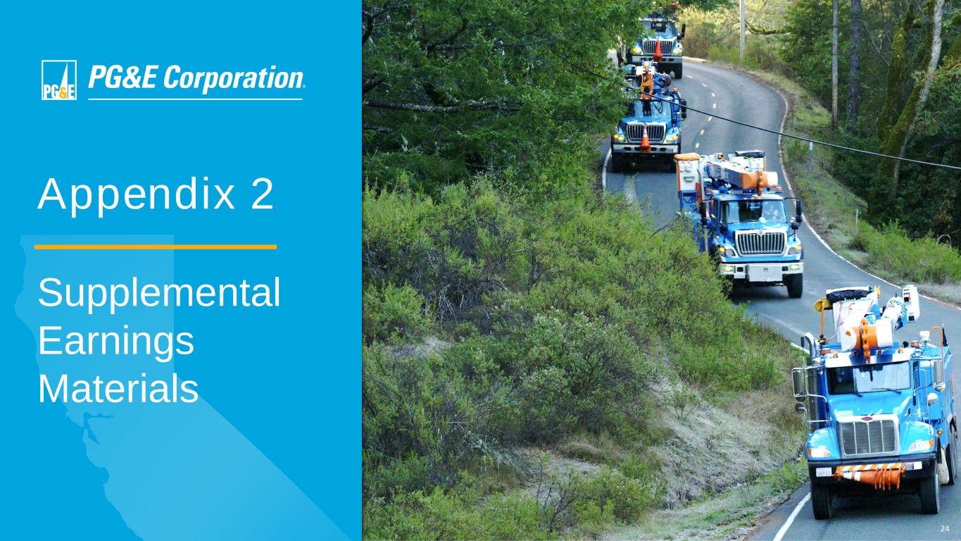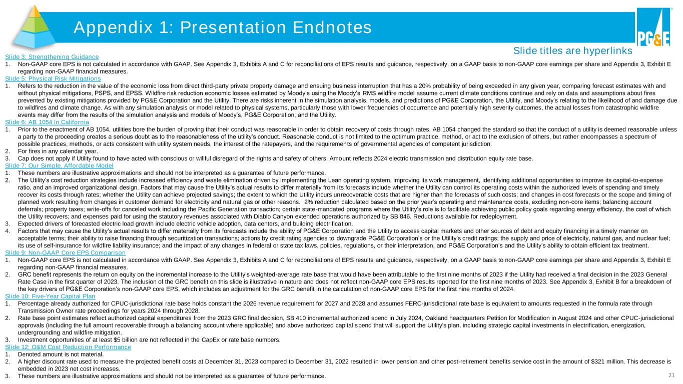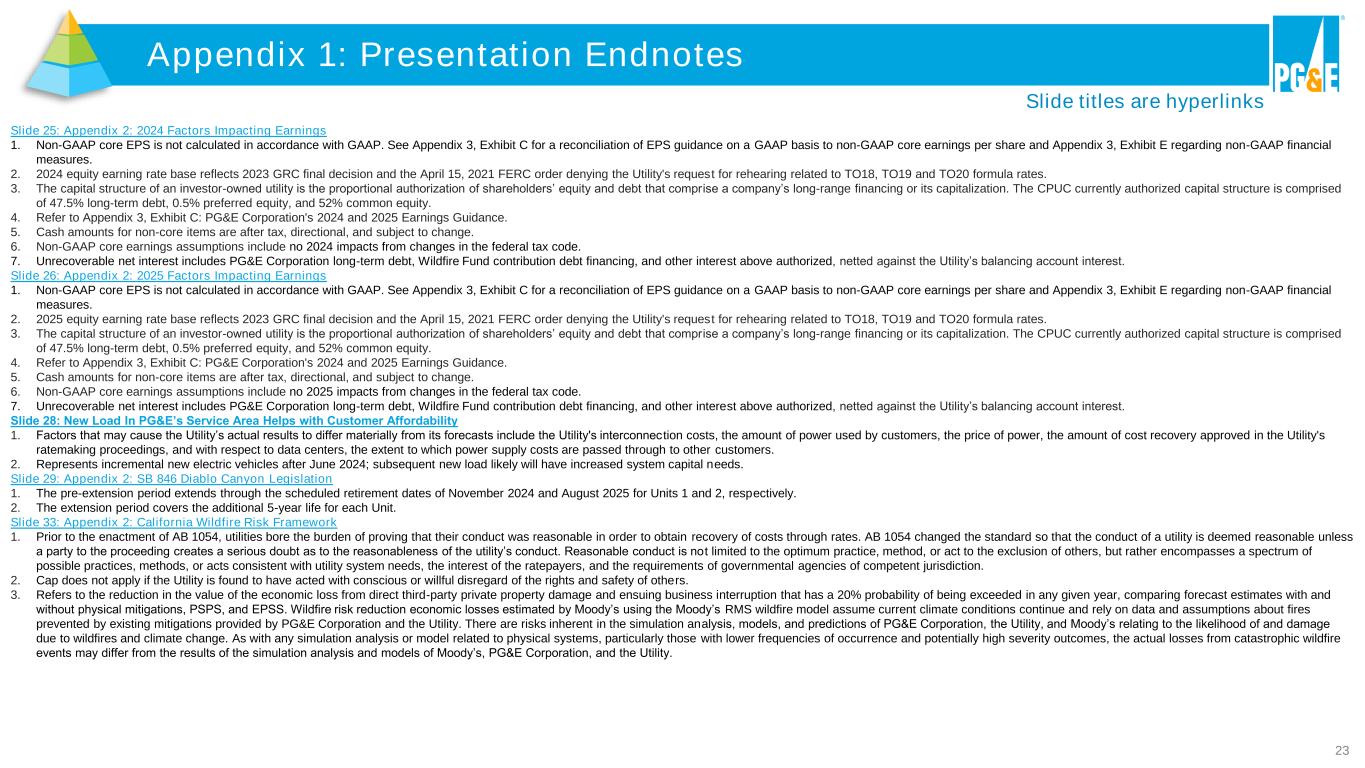 23 Appendix 1: Presentation Endnotes Slide titles are hyperlinks Slide 25: Appendix 2: 2024 Factors Impacting Earnings 1. Non-GAAP core EPS is not calculated in accordance with GAAP. See Appendix 3, Exhibit C for a reconciliation of EPS guidance on a GAAP basis to non-GAAP core earnings per share and Appendix 3, Exhibit E regarding non-GAAP financial measures. 2. 2024 equity earning rate base reflects 2023 GRC final decision and the April 15, 2021 FERC order denying the Utility's request for rehearing related to TO18, TO19 and TO20 formula rates. 3. The capital structure of an investor-owned utility is the proportional authorization of shareholders’ equity and debt that comprise a company’s long-range financing or its capitalization. The CPUC currently authorized capital structure is comprised of 47.5% long-term debt, 0.5% preferred equity, and 52% common equity. 4. Refer to Appendix 3, Exhibit C: PG&E Corporation's 2024 and 2025 Earnings Guidance. 5. Cash amounts for non-core items are after tax, directional, and subject to change. 6. Non-GAAP core earnings assumptions include no 2024 impacts from changes in the federal tax code. 7. Unrecoverable net interest includes PG&E Corporation long-term debt, Wildfire Fund contribution debt financing, and other interest above authorized, netted against the Utility’s balancing account interest. Slide 26: Appendix 2: 2025 Factors Impacting Earnings 1. Non-GAAP core EPS is not calculated in accordance with GAAP. See Appendix 3, Exhibit C for a reconciliation of EPS guidance on a GAAP basis to non-GAAP core earnings per share and Appendix 3, Exhibit E regarding non-GAAP financial measures. 2. 2025 equity earning rate base reflects 2023 GRC final decision and the April 15, 2021 FERC order denying the Utility's request for rehearing related to TO18, TO19 and TO20 formula rates. 3. The capital structure of an investor-owned utility is the proportional authorization of shareholders’ equity and debt that comprise a company’s long-range financing or its capitalization. The CPUC currently authorized capital structure is comprised of 47.5% long-term debt, 0.5% preferred equity, and 52% common equity. 4. Refer to Appendix 3, Exhibit C: PG&E Corporation's 2024 and 2025 Earnings Guidance. 5. Cash amounts for non-core items are after tax, directional, and subject to change. 6. Non-GAAP core earnings assumptions include no 2025 impacts from changes in the federal tax code. 7. Unrecoverable net interest includes PG&E Corporation long-term debt, Wildfire Fund contribution debt financing, and other interest above authorized, netted against the Utility’s balancing account interest. Slide 28: New Load In PG&E’s Service Area Helps with Customer Affordability 1. Factors that may cause the Utility’s actual results to differ materially from its forecasts include the Utility's interconnec tion costs, the amount of power used by customers, the price of power, the amount of cost recovery approved in the Utility's ratemaking proceedings, and with respect to data centers, the extent to which power supply costs are passed through to other customers. 2. Represents incremental new electric vehicles after June 2024; subsequent new load likely will have increased system capital needs. Slide 29: Appendix 2: SB 846 Diablo Canyon Legislation 1. The pre-extension period extends through the scheduled retirement dates of November 2024 and August 2025 for Units 1 and 2, respectively. 2. The extension period covers the additional 5-year life for each Unit. Slide 33: Appendix 2: California Wildfire Risk Framework 1. Prior to the enactment of AB 1054, utilities bore the burden of proving that their conduct was reasonable in order to obtain recovery of costs through rates. AB 1054 changed the standard so that the conduct of a utility is deemed reasonable unless a party to the proceeding creates a serious doubt as to the reasonableness of the utility’s conduct. Reasonable conduct is not limited to the optimum practice, method, or act to the exclusion of others, but rather encompasses a spectrum of possible practices, methods, or acts consistent with utility system needs, the interest of the ratepayers, and the requirements of governmental agencies of competent jurisdiction. 2. Cap does not apply if the Utility is found to have acted with conscious or willful disregard of the rights and safety of others. 3. Refers to the reduction in the value of the economic loss from direct third-party private property damage and ensuing business interruption that has a 20% probability of being exceeded in any given year, comparing forecast estimates with and without physical mitigations, PSPS, and EPSS. Wildfire risk reduction economic losses estimated by Moody’s using the Moody’s RMS wildfire model assume current climate conditions continue and rely on data and assumptions about fires prevented by existing mitigations provided by PG&E Corporation and the Utility. There are risks inherent in the simulation analysis, models, and predictions of PG&E Corporation, the Utility, and Moody’s relating to the likelihood of and damage due to wildfires and climate change. As with any simulation analysis or model related to physical systems, particularly those with lower frequencies of occurrence and potentially high severity outcomes, the actual losses from catastrophic wildfire events may differ from the results of the simulation analysis and models of Moody’s, PG&E Corporation, and the Utility.