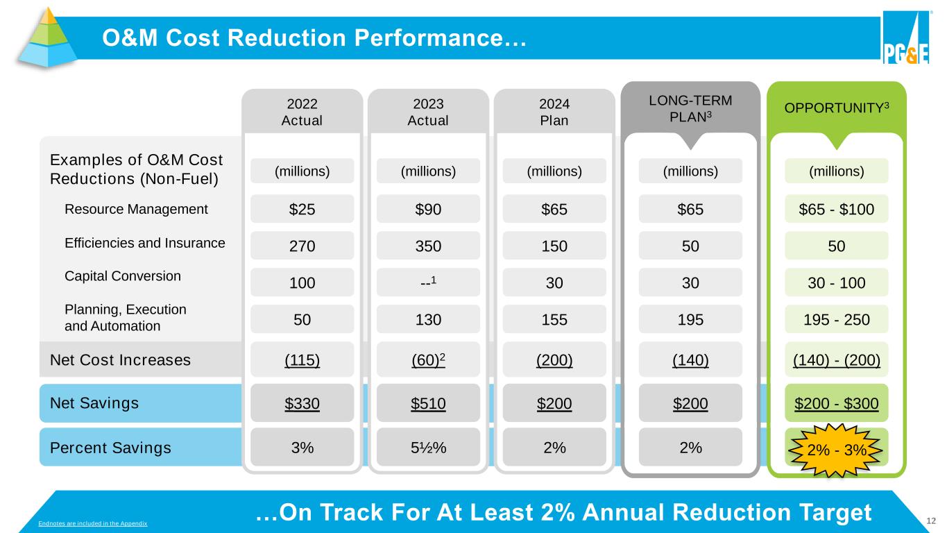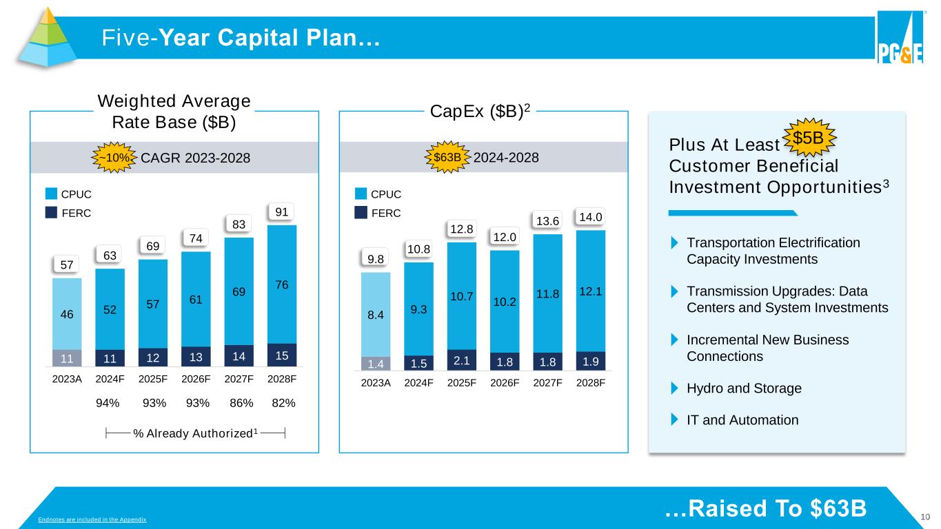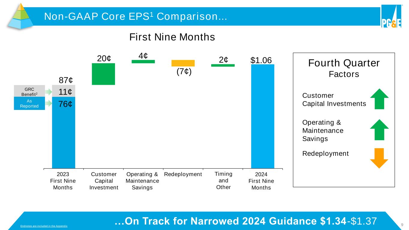 23 Appendix 1: Presentation Endnotes Slide titles are hyperlinks Slide 25: Appendix 2: 2024 Factors Impacting Earnings 1. Non-GAAP core EPS is not calculated in accordance with GAAP. See Appendix 3, Exhibit C for a reconciliation of EPS guidance on a GAAP basis to non-GAAP core earnings per share and Appendix 3, Exhibit E regarding non-GAAP financial measures. 2. 2024 equity earning rate base reflects 2023 GRC final decision and the April 15, 2021 FERC order denying the Utility's request for rehearing related to TO18, TO19 and TO20 formula rates. 3. The capital structure of an investor-owned utility is the proportional authorization of shareholders’ equity and debt that comprise a company’s long-range financing or its capitalization. The CPUC currently authorized capital structure is comprised of 47.5% long-term debt, 0.5% preferred equity, and 52% common equity. 4. Refer to Appendix 3, Exhibit C: PG&E Corporation's 2024 and 2025 Earnings Guidance. 5. Cash amounts for non-core items are after tax, directional, and subject to change. 6. Non-GAAP core earnings assumptions include no 2024 impacts from changes in the federal tax code. 7. Unrecoverable net interest includes PG&E Corporation long-term debt, Wildfire Fund contribution debt financing, and other interest above authorized, netted against the Utility’s balancing account interest. Slide 26: Appendix 2: 2025 Factors Impacting Earnings 1. Non-GAAP core EPS is not calculated in accordance with GAAP. See Appendix 3, Exhibit C for a reconciliation of EPS guidance on a GAAP basis to non-GAAP core earnings per share and Appendix 3, Exhibit E regarding non-GAAP financial measures. 2. 2025 equity earning rate base reflects 2023 GRC final decision and the April 15, 2021 FERC order denying the Utility's request for rehearing related to TO18, TO19 and TO20 formula rates. 3. The capital structure of an investor-owned utility is the proportional authorization of shareholders’ equity and debt that comprise a company’s long-range financing or its capitalization. The CPUC currently authorized capital structure is comprised of 47.5% long-term debt, 0.5% preferred equity, and 52% common equity. 4. Refer to Appendix 3, Exhibit C: PG&E Corporation's 2024 and 2025 Earnings Guidance. 5. Cash amounts for non-core items are after tax, directional, and subject to change. 6. Non-GAAP core earnings assumptions include no 2025 impacts from changes in the federal tax code. 7. Unrecoverable net interest includes PG&E Corporation long-term debt, Wildfire Fund contribution debt financing, and other interest above authorized, netted against the Utility’s balancing account interest. Slide 28: New Load In PG&E’s Service Area Helps with Customer Affordability 1. Factors that may cause the Utility’s actual results to differ materially from its forecasts include the Utility's interconnec tion costs, the amount of power used by customers, the price of power, the amount of cost recovery approved in the Utility's ratemaking proceedings, and with respect to data centers, the extent to which power supply costs are passed through to other customers. 2. Represents incremental new electric vehicles after June 2024; subsequent new load likely will have increased system capital needs. Slide 29: Appendix 2: SB 846 Diablo Canyon Legislation 1. The pre-extension period extends through the scheduled retirement dates of November 2024 and August 2025 for Units 1 and 2, respectively. 2. The extension period covers the additional 5-year life for each Unit. Slide 33: Appendix 2: California Wildfire Risk Framework 1. Prior to the enactment of AB 1054, utilities bore the burden of proving that their conduct was reasonable in order to obtain recovery of costs through rates. AB 1054 changed the standard so that the conduct of a utility is deemed reasonable unless a party to the proceeding creates a serious doubt as to the reasonableness of the utility’s conduct. Reasonable conduct is not limited to the optimum practice, method, or act to the exclusion of others, but rather encompasses a spectrum of possible practices, methods, or acts consistent with utility system needs, the interest of the ratepayers, and the requirements of governmental agencies of competent jurisdiction. 2. Cap does not apply if the Utility is found to have acted with conscious or willful disregard of the rights and safety of others. 3. Refers to the reduction in the value of the economic loss from direct third-party private property damage and ensuing business interruption that has a 20% probability of being exceeded in any given year, comparing forecast estimates with and without physical mitigations, PSPS, and EPSS. Wildfire risk reduction economic losses estimated by Moody’s using the Moody’s RMS wildfire model assume current climate conditions continue and rely on data and assumptions about fires prevented by existing mitigations provided by PG&E Corporation and the Utility. There are risks inherent in the simulation analysis, models, and predictions of PG&E Corporation, the Utility, and Moody’s relating to the likelihood of and damage due to wildfires and climate change. As with any simulation analysis or model related to physical systems, particularly those with lower frequencies of occurrence and potentially high severity outcomes, the actual losses from catastrophic wildfire events may differ from the results of the simulation analysis and models of Moody’s, PG&E Corporation, and the Utility.