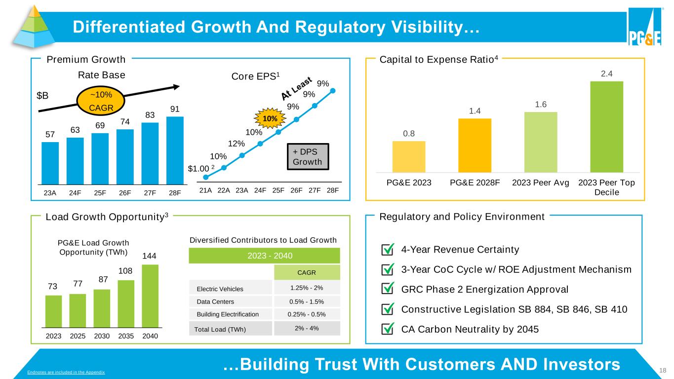 17…Benefits Customers AND Investors Differentiated Performance… Endnotes are included in the Appendix 2022A 2023A 2024F Future Customer Investment Rate Base Growth 5.5% 14.5% 10.5% CA Regulatory Ranking (RRA) Average/2 Average/1 Above Average Affordable Model Non-Fuel O&M Reduction1 3% 2% Load Growth2 Bills3 Credit Ratings BB-/Ba2 BB- /Ba2 BB/Ba1 Consistent Performance Non-GAAP Core EPS Growth4 10% 12% 10% Operating Cashflow $3.7B $4.7B $8.3B $10B+ Risk Reduction Safety Certification Valid through 1/22/25 Financial S&P 500 / Rate Neutral Securitization Common Dividend / Fire Victim Trust Exit 1% - 3% 2% - 4% Investment Grade & Mid-teens FFO/Debt6 Premium Multiple 5½% 2% ~10%5 At Least 10% 2025 At Least 9% 2026 - 2028