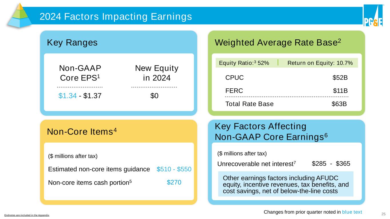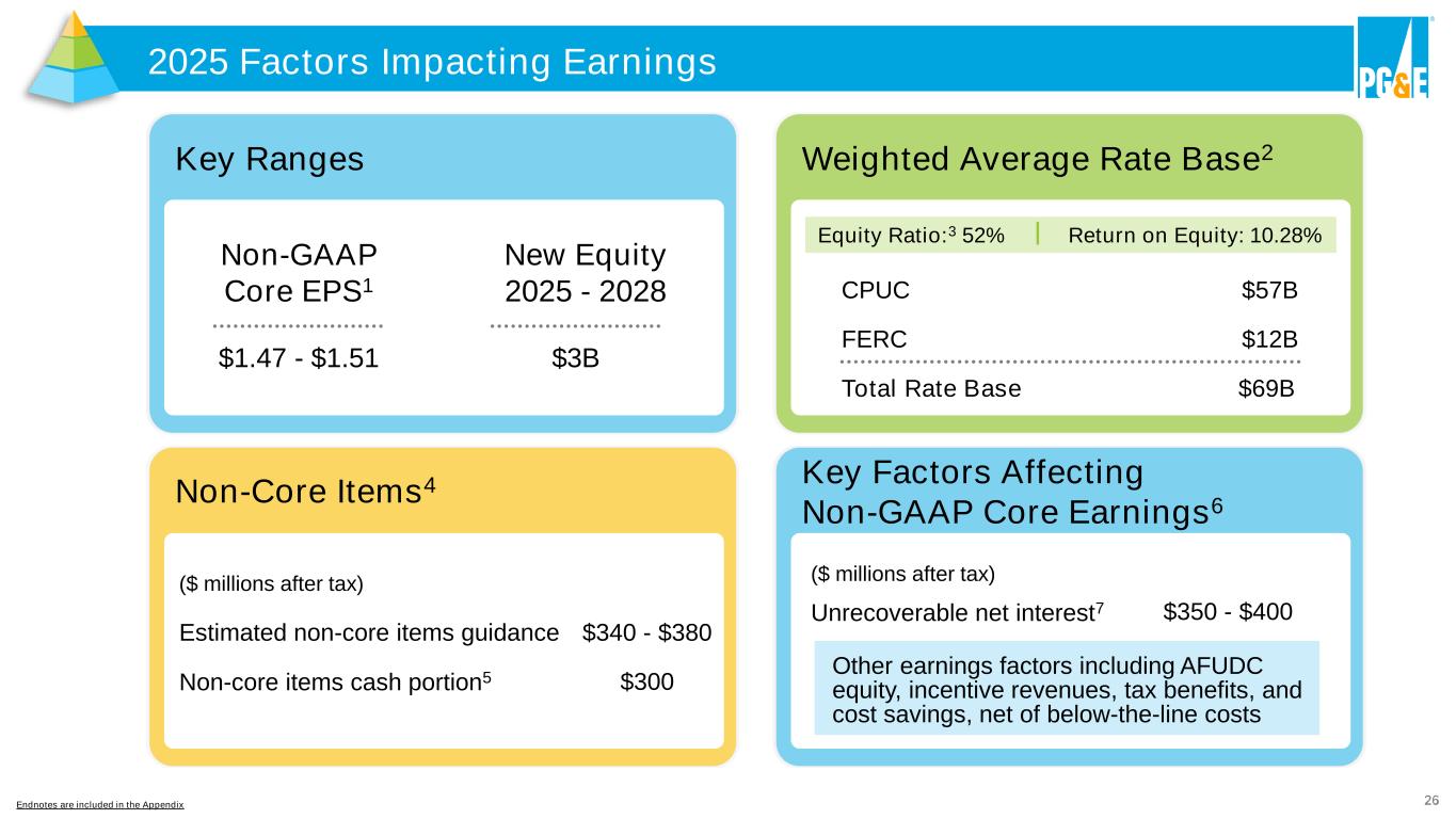 25 2024 Factors Impacting Earnings Endnotes are included in the Appendix Changes from prior quarter noted in blue text $1.34 - $1.37 Non-GAAP Core EPS1 New Equity in 2024 $0 Key Ranges Weighted Average Rate Base2 CPUC $52B FERC $11B Total Rate Base $63B Equity Ratio:3 52% Return on Equity: 10.7% Non-Core Items4 Key Factors Affecting Non-GAAP Core Earnings6 ($ millions after tax) Estimated non-core items guidance $510 - $550 Non-core items cash portion5 $270 ($ millions after tax) Unrecoverable net interest7 $285 - $365 Other earnings factors including AFUDC equity, incentive revenues, tax benefits, and cost savings, net of below-the-line costs