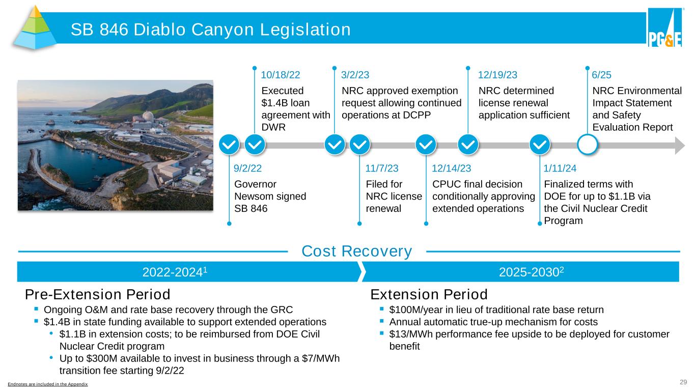 29 SB 846 Diablo Canyon Legislation Cost Recovery 2022-20241 2025-20302 ▪ Ongoing O&M and rate base recovery through the GRC ▪ $1.4B in state funding available to support extended operations • $1.1B in extension costs; to be reimbursed from DOE Civil Nuclear Credit program • Up to $300M available to invest in business through a $7/MWh transition fee starting 9/2/22 ▪ $100M/year in lieu of traditional rate base return ▪ Annual automatic true-up mechanism for costs ▪ $13/MWh performance fee upside to be deployed for customer benefit Pre-Extension Period Extension Period 9/2/22 Governor Newsom signed SB 846 1/11/24 Finalized terms with DOE for up to $1.1B via the Civil Nuclear Credit Program 10/18/22 Executed $1.4B loan agreement with DWR 3/2/23 NRC approved exemption request allowing continued operations at DCPP 11/7/23 Filed for NRC license renewal 12/14/23 CPUC final decision conditionally approving extended operations 12/19/23 NRC determined license renewal application sufficient 6/25 NRC Environmental Impact Statement and Safety Evaluation Report Endnotes are included in the Appendix