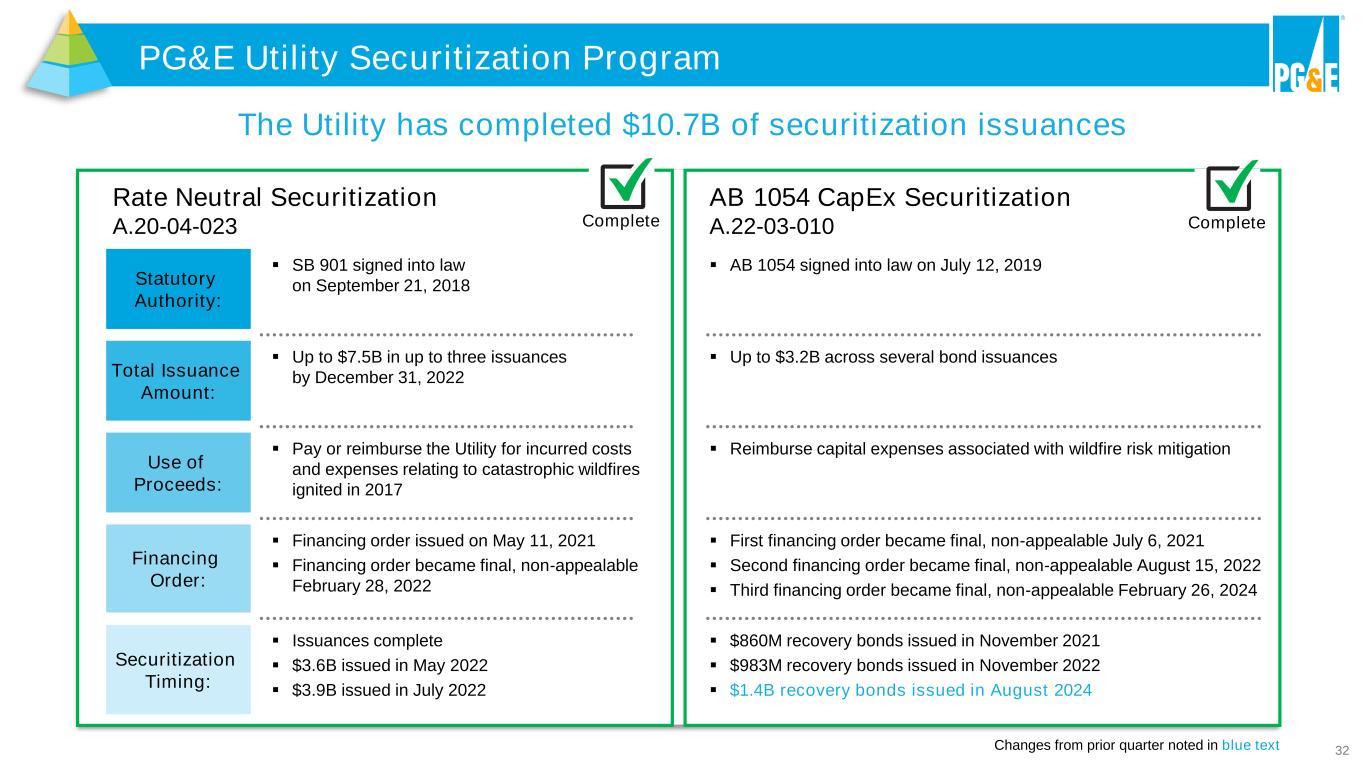 32 PG&E Utility Securitization Program Changes from prior quarter noted in blue text The Utility has completed $10.7B of securitization issuances Rate Neutral Securitization A.20-04-023 ▪ SB 901 signed into law on September 21, 2018Statutory Authority: ▪ AB 1054 signed into law on July 12, 2019 ▪ Up to $7.5B in up to three issuances by December 31, 2022Total Issuance Amount: ▪ Up to $3.2B across several bond issuances ▪ Pay or reimburse the Utility for incurred costs and expenses relating to catastrophic wildfires ignited in 2017 Use of Proceeds: ▪ Reimburse capital expenses associated with wildfire risk mitigation ▪ Financing order issued on May 11, 2021 ▪ Financing order became final, non-appealable February 28, 2022 Financing Order: ▪ First financing order became final, non-appealable July 6, 2021 ▪ Second financing order became final, non-appealable August 15, 2022 ▪ Third financing order became final, non-appealable February 26, 2024 ▪ Issuances complete ▪ $3.6B issued in May 2022 ▪ $3.9B issued in July 2022 Securitization Timing: ▪ $860M recovery bonds issued in November 2021 ▪ $983M recovery bonds issued in November 2022 ▪ $1.4B recovery bonds issued in August 2024 AB 1054 CapEx Securitization A.22-03-010Complete Complete