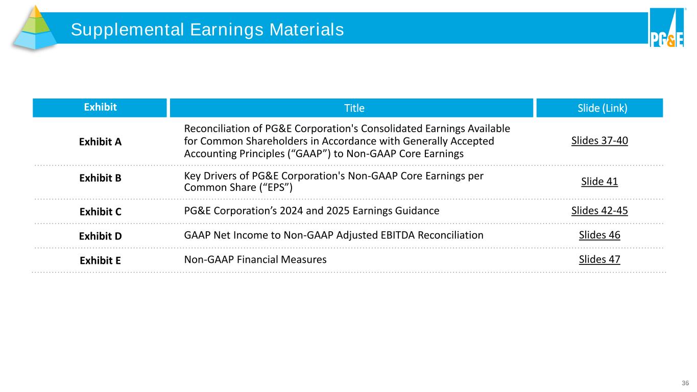 36 Supplemental Earnings Materials Exhibit Title Slide (Link) Exhibit A Reconciliation of PG&E Corporation's Consolidated Earnings Available for Common Shareholders in Accordance with Generally Accepted Accounting Principles (“GAAP”) to Non-GAAP Core Earnings Slides 37-40 Exhibit B Key Drivers of PG&E Corporation's Non-GAAP Core Earnings per Common Share (“EPS”) Slide 41 Exhibit C PG&E Corporation’s 2024 and 2025 Earnings Guidance Slides 42-45 Exhibit D GAAP Net Income to Non-GAAP Adjusted EBITDA Reconciliation Slides 46 Exhibit E Non-GAAP Financial Measures Slides 47