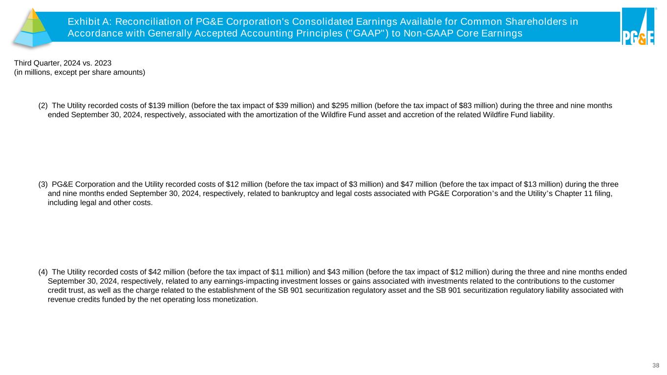 37 Three Months Ended September 30, Nine Months Ended September 30, Earnings Earnings per Common Share Earnings Earnings per Common Share (in millions, except per share amounts) 2024 2023 2024 2023 2024 2023 2024 2023 PG&E Corporation’s earnings/EPS on a GAAP basis $ 576 $ 348 $ 0.27 $ 0.16 $ 1,828 $ 1,323 $ 0.85 $ 0.62 Non-core items: (1) Amortization of Wildfire Fund contribution (2) 100 157 0.05 0.07 212 326 0.10 0.15 Bankruptcy and legal costs (3) 9 47 — 0.02 34 81 0.02 0.04 Fire Victim Trust tax benefit net of securitization (4) 31 (46) 0.01 (0.02) 31 (185) 0.01 (0.09) Investigation remedies (5) 21 3 0.01 — 41 20 0.02 0.01 Prior period net regulatory impact (6) (6) (6) — — (17) (17) (0.01) (0.01) Strategic repositioning costs (7) — 1 — — — 3 — — Tax-related adjustments (8) — — — — 70 — 0.03 — Wildfire-related costs, net of recoveries (9) 60 9 0.03 — 66 73 0.03 0.03 PG&E Corporation’s non-GAAP core earnings/EPS (10) $ 791 $ 513 $ 0.37 $ 0.24 $ 2,265 $ 1,624 $ 1.06 $ 0.76 All amounts presented in the table above and footnotes below are tax adjusted at PG&E Corporation’s statutory tax rate of 27.98% for 2024 and 2023, except for certain costs that are not tax deductible. Amounts may not sum due to rounding. Third Quarter, 2024 vs. 2023 (in millions, except per share amounts) (1) “Non-core items” include items that management does not consider representative of ongoing earnings and affect comparability of financial results between periods, consisting of the items listed in the table above. See Exhibit E: Non-GAAP Financial Measures. Exhibit A: Reconciliation of PG&E Corporation's Consolidated Earnings Available for Common Shareholders in Accordance with Generally Accepted Accounting Principles ("GAAP") to Non-GAAP Core Earnings