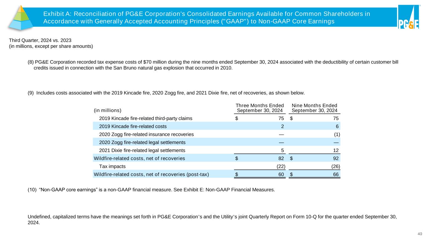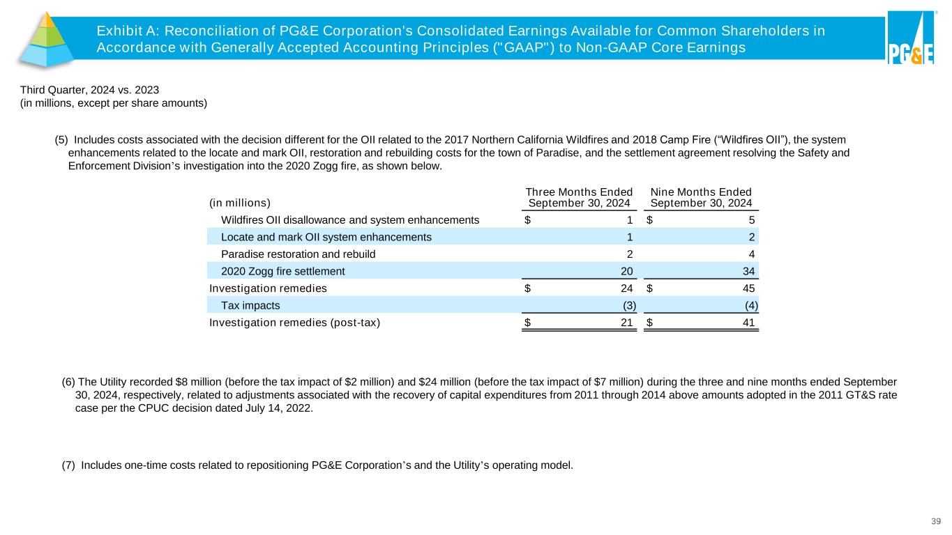 38 Third Quarter, 2024 vs. 2023 (in millions, except per share amounts) (3) PG&E Corporation and the Utility recorded costs of $12 million (before the tax impact of $3 million) and $47 million (before the tax impact of $13 million) during the three and nine months ended September 30, 2024, respectively, related to bankruptcy and legal costs associated with PG&E Corporation’s and the Utility’s Chapter 11 filing, including legal and other costs. (2) The Utility recorded costs of $139 million (before the tax impact of $39 million) and $295 million (before the tax impact of $83 million) during the three and nine months ended September 30, 2024, respectively, associated with the amortization of the Wildfire Fund asset and accretion of the related Wildfire Fund liability. Exhibit A: Reconciliation of PG&E Corporation's Consolidated Earnings Available for Common Shareholders in Accordance with Generally Accepted Accounting Principles ("GAAP") to Non-GAAP Core Earnings (4) The Utility recorded costs of $42 million (before the tax impact of $11 million) and $43 million (before the tax impact of $12 million) during the three and nine months ended September 30, 2024, respectively, related to any earnings-impacting investment losses or gains associated with investments related to the contributions to the customer credit trust, as well as the charge related to the establishment of the SB 901 securitization regulatory asset and the SB 901 securitization regulatory liability associated with revenue credits funded by the net operating loss monetization. Exhibit A: Reconciliation of PG&E Corporation's Consolidated Earnings Available for Common Shareholders in Accordance with Generally Accepted Accounting Principles ("GAAP") to Non-GAAP Core Earnings
