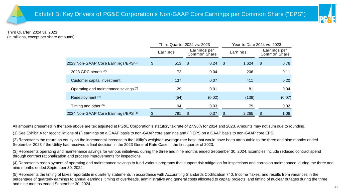 41 All amounts presented in the table above are tax adjusted at PG&E Corporation’s statutory tax rate of 27.98% for 2024 and 2023. Amounts may not sum due to rounding. (1) See Exhibit A for reconciliations of (i) earnings on a GAAP basis to non-GAAP core earnings and (ii) EPS on a GAAP basis to non-GAAP core EPS. (2) Represents the return on equity on the incremental increase to the Utility’s weighted-average rate base that would have been attributable to the three and nine months ended September 2023 if the Utility had received a final decision in the 2023 General Rate Case in the first quarter of 2023. (3) Represents operating and maintenance savings for various initiatives, during the three and nine months ended September 30, 2024. Examples include reduced contract spend through contract rationalization and process improvements for inspections. (4) Represents redeployment of operating and maintenance savings to fund various programs that support risk mitigation for inspections and corrosion maintenance, during the three and nine months ended September 30, 2024. (5) Represents the timing of taxes reportable in quarterly statements in accordance with Accounting Standards Codification 740, Income Taxes, and results from variances in the percentage of quarterly earnings to annual earnings, timing of overheads, administrative and general costs allocated to capital projects, and timing of nuclear outages during the three and nine months ended September 30, 2024. Third Quarter 2024 vs. 2023 Year to Date 2024 vs. 2023 Earnings Earnings per Common Share Earnings Earnings per Common Share 2023 Non-GAAP Core Earnings/EPS (1) $ 513 $ 0.24 $ 1,624 $ 0.76 2023 GRC benefit (2) 72 0.04 206 0.11 Customer capital investment 137 0.07 411 0.20 Operating and maintenance savings (3) 29 0.01 81 0.04 Redeployment (4) (54) (0.02) (136) (0.07) Timing and other (5) 94 0.03 79 0.02 2024 Non-GAAP Core Earnings/EPS (1) $ 791 $ 0.37 $ 2,265 $ 1.06 Third Quarter, 2024 vs. 2023 (in millions, except per share amounts) Exhibit B: Key Drivers of PG&E Corporation's Non-GAAP Core Earnings per Common Share ("EPS") Exhibit B: Key Drivers of PG&E Corporation's Non-GAAP Core Earnings per Common Share ("EPS")