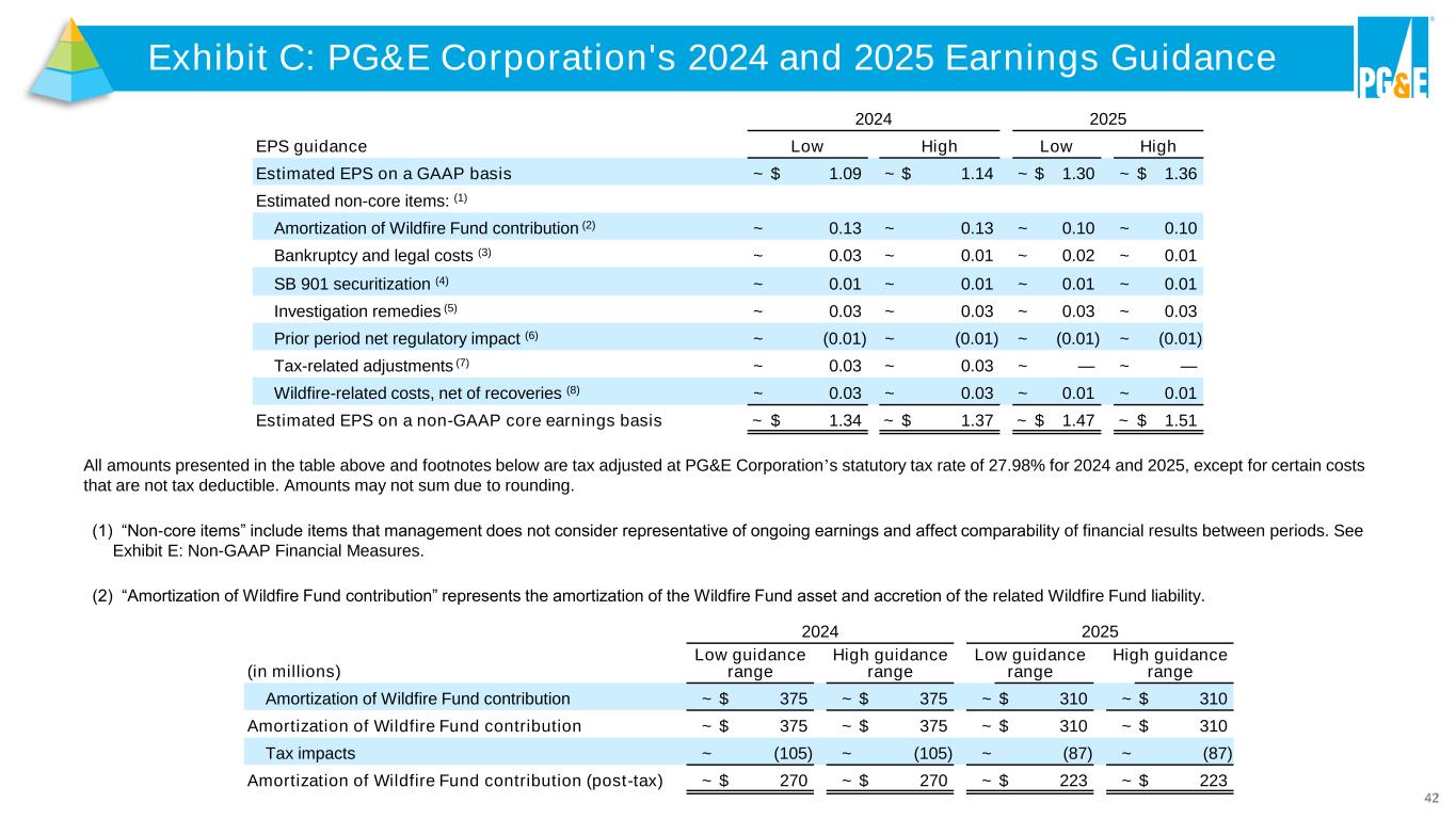 42 2024 2025 EPS guidance Low High Low High Estimated EPS on a GAAP basis ~ $ 1.09 ~ $ 1.14 ~ $ 1.30 ~ $ 1.36 Estimated non-core items: (1) Amortization of Wildfire Fund contribution (2) ~ 0.13 ~ 0.13 ~ 0.10 ~ 0.10 Bankruptcy and legal costs (3) ~ 0.03 ~ 0.01 ~ 0.02 ~ 0.01 SB 901 securitization (4) ~ 0.01 ~ 0.01 ~ 0.01 ~ 0.01 Investigation remedies (5) ~ 0.03 ~ 0.03 ~ 0.03 ~ 0.03 Prior period net regulatory impact (6) ~ (0.01) ~ (0.01) ~ (0.01) ~ (0.01) Tax-related adjustments (7) ~ 0.03 ~ 0.03 ~ — ~ — Wildfire-related costs, net of recoveries (8) ~ 0.03 ~ 0.03 ~ 0.01 ~ 0.01 Estimated EPS on a non-GAAP core earnings basis ~ $ 1.34 ~ $ 1.37 ~ $ 1.47 ~ $ 1.51 All amounts presented in the table above and footnotes below are tax adjusted at PG&E Corporation’s statutory tax rate of 27.98% for 2024 and 2025, except for certain costs that are not tax deductible. Amounts may not sum due to rounding. (1) “Non-core items” include items that management does not consider representative of ongoing earnings and affect comparability of financial results between periods. See Exhibit E: Non-GAAP Financial Measures. 2024 2025 (in millions) Low guidance range High guidance range Low guidance range High guidance range Amortization of Wildfire Fund contribution ~ $ 375 ~ $ 375 ~ $ 310 ~ $ 310 Amortization of Wildfire Fund contribution ~ $ 375 ~ $ 375 ~ $ 310 ~ $ 310 Tax impacts ~ (105) ~ (105) ~ (87) ~ (87) Amortization of Wildfire Fund contribution (post-tax) ~ $ 270 ~ $ 270 ~ $ 223 ~ $ 223 (2) “Amortization of Wildfire Fund contribution” represents the amortization of the Wildfire Fund asset and accretion of the related Wildfire Fund liability. Exhibit C: PG&E Corporation's 2024 Earnings GuidanceExhibit C: PG&E Corpor tion's 20 4 and 2025 Earnings Guidance