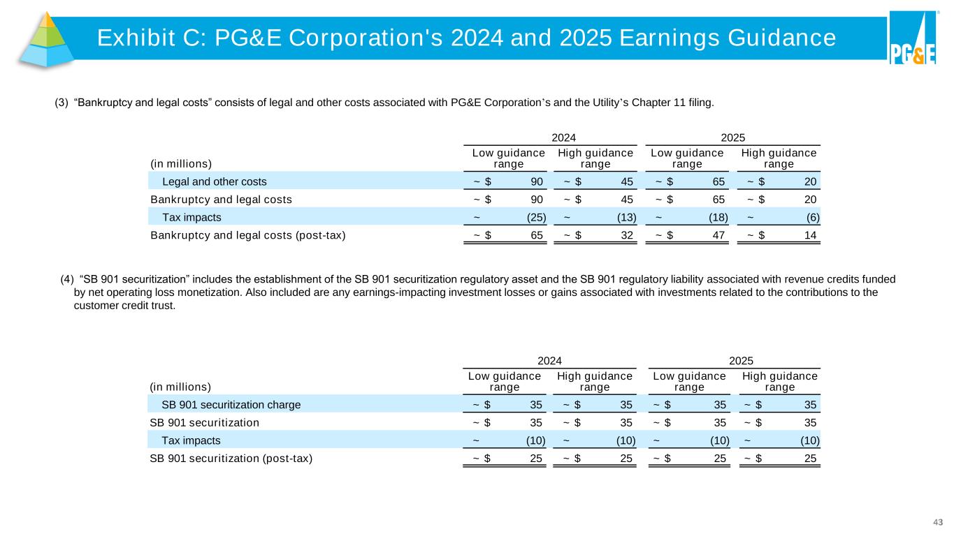 43 Exhibit E: PG&E Corporation's 2020 and 2021 Earnings Guidance (4) “SB 901 securitization” includes the establishment of the SB 901 securitization regulatory asset and the SB 901 regulatory liability associated with revenue credits funded by net operating loss monetization. Also included are any earnings-impacting investment losses or gains associated with investments related to the contributions to the customer credit trust. (3) “Bankruptcy and legal costs” consists of legal and other costs associated with PG&E Corporation’s and the Utility’s Chapter 11 filing. 2024 2025 (in millions) Low guidance range High guidance range Low guidance range High guidance range Legal and other costs ~ $ 90 ~ $ 45 ~ $ 65 ~ $ 20 Bankruptcy and legal costs ~ $ 90 ~ $ 45 ~ $ 65 ~ $ 20 Tax impacts ~ (25) ~ (13) ~ (18) ~ (6) Bankruptcy and legal costs (post-tax) ~ $ 65 ~ $ 32 ~ $ 47 ~ $ 14 2024 2025 (in millions) Low guidance range High guidance range Low guidance range High guidance range SB 901 securitization charge ~ $ 35 ~ $ 35 ~ $ 35 ~ $ 35 SB 901 securitization ~ $ 35 ~ $ 35 ~ $ 35 ~ $ 35 Tax impacts ~ (10) ~ (10) ~ (10) ~ (10) SB 901 securitization (post-tax) ~ $ 25 ~ $ 25 ~ $ 25 ~ $ 25 Exhibit C: PG&E Corporation's 2024 Earnings GuidanceExhibit C: PG&E Corpor tion's 20 4 and 2025 Earnings Guidance