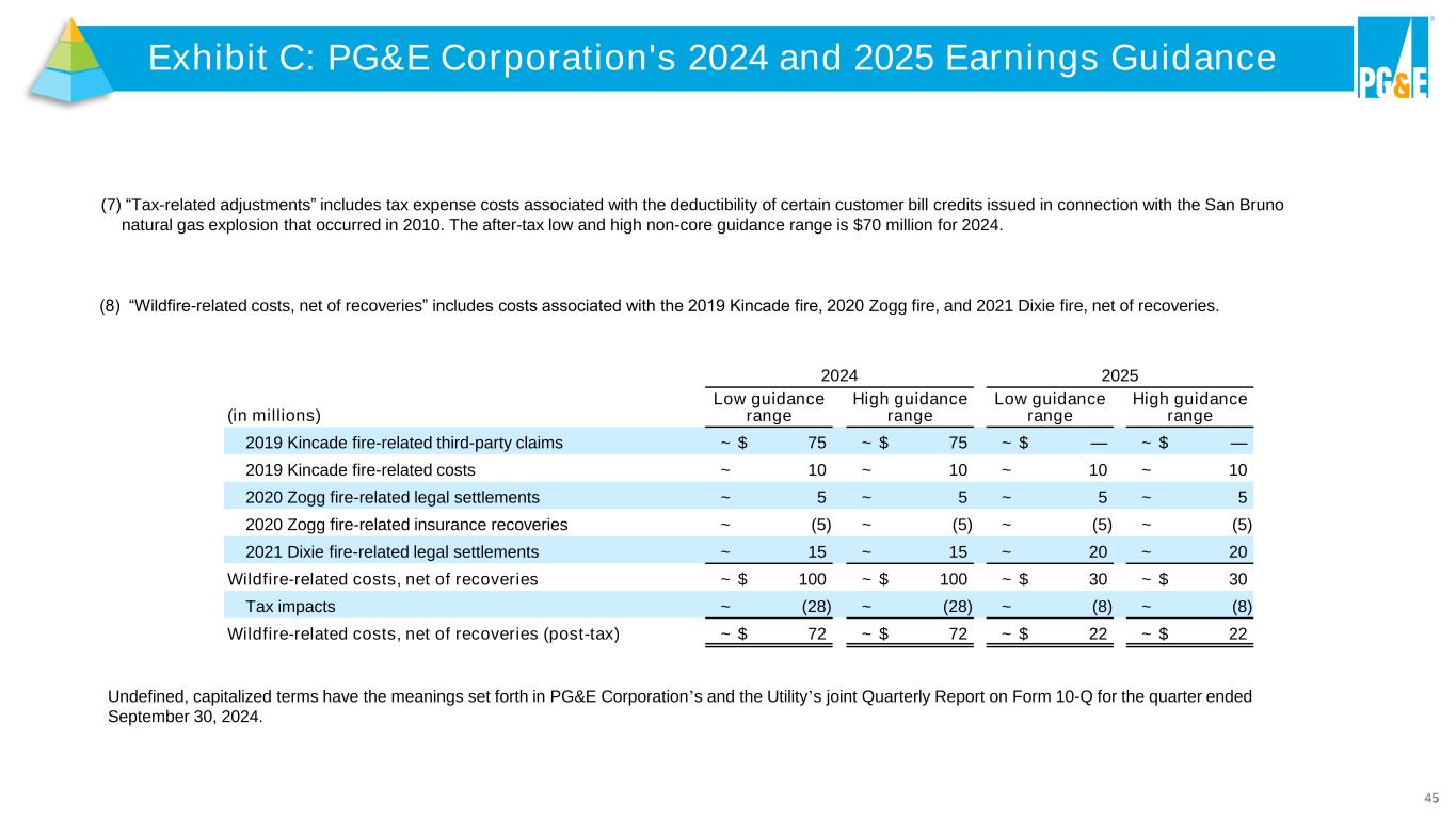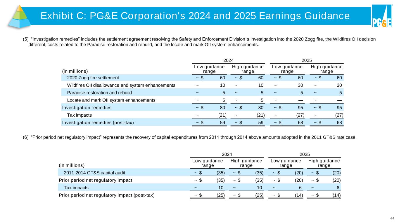 44 (6) “Prior period net regulatory impact” represents the recovery of capital expenditures from 2011 through 2014 above amounts adopted in the 2011 GT&S rate case. (5) “Investigation remedies” includes the settlement agreement resolving the Safety and Enforcement Division’s investigation into the 2020 Zogg fire, the Wildfires OII decision different, costs related to the Paradise restoration and rebuild, and the locate and mark OII system enhancements. 2024 2025 (in millions) Low guidance range High guidance range Low guidance range High guidance range 2020 Zogg fire settlement ~ $ 60 ~ $ 60 ~ $ 60 ~ $ 60 Wildfires OII disallowance and system enhancements ~ 10 ~ 10 ~ 30 ~ 30 Paradise restoration and rebuild ~ 5 ~ 5 ~ 5 ~ 5 Locate and mark OII system enhancements ~ 5 ~ 5 ~ — ~ — Investigation remedies ~ $ 80 ~ $ 80 ~ $ 95 ~ $ 95 Tax impacts ~ (21) ~ (21) ~ (27) ~ (27) Investigation remedies (post-tax) ~ $ 59 ~ $ 59 ~ $ 68 ~ $ 68 2024 2025 (in millions) Low guidance range High guidance range Low guidance range High guidance range 2011-2014 GT&S capital audit ~ $ (35) ~ $ (35) ~ $ (20) ~ $ (20) Prior period net regulatory impact ~ $ (35) ~ $ (35) ~ $ (20) ~ $ (20) Tax impacts ~ 10 ~ 10 ~ 6 ~ 6 Prior period net regulatory impact (post-tax) ~ $ (25) ~ $ (25) ~ $ (14) ~ $ (14) Exhibit C: PG&E Corporation's 2024 Earnings GuidanceExhibit C: PG&E Corpor tion's 20 4 and 2025 Earnings Guidance