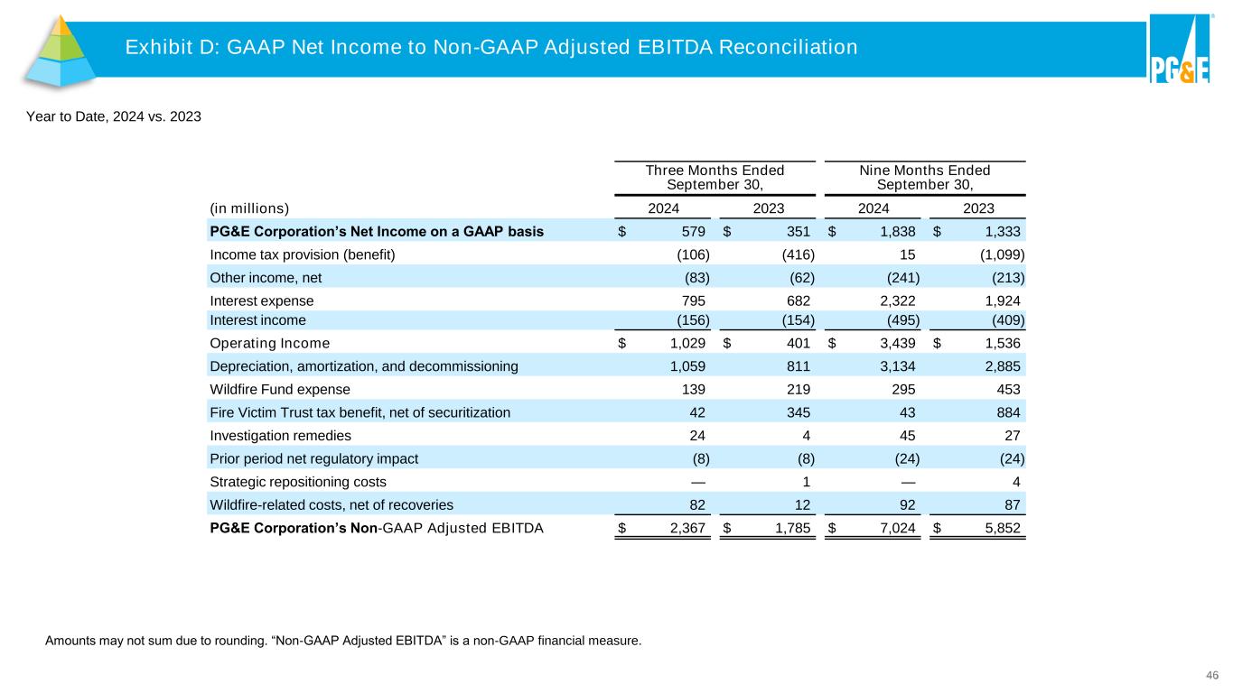 46 Three Months Ended September 30, Nine Months Ended September 30, (in millions) 2024 2023 2024 2023 PG&E Corporation’s Net Income on a GAAP basis $ 579 $ 351 $ 1,838 $ 1,333 Income tax provision (benefit) (106) (416) 15 (1,099) Other income, net (83) (62) (241) (213) Interest expense 795 682 2,322 1,924 Interest income (156) (154) (495) (409) Operating Income $ 1,029 $ 401 $ 3,439 $ 1,536 Depreciation, amortization, and decommissioning 1,059 811 3,134 2,885 Wildfire Fund expense 139 219 295 453 Fire Victim Trust tax benefit, net of securitization 42 345 43 884 Investigation remedies 24 4 45 27 Prior period net regulatory impact (8) (8) (24) (24) Strategic repositioning costs — 1 — 4 Wildfire-related costs, net of recoveries 82 12 92 87 PG&E Corporation’s Non-GAAP Adjusted EBITDA $ 2,367 $ 1,785 $ 7,024 $ 5,852 Year to Date, 2024 vs. 2023 Amounts may not sum due to rounding. “Non-GAAP Adjusted EBITDA” is a non-GAAP financial measure. Exhibit D: GAAP Net Income to Non-GAAP Adjusted EBITDA Reconciliation PG&E CorporationExhibit D: GAAP Net Income to Non-GAAP Adjusted EBITDA Reconciliation