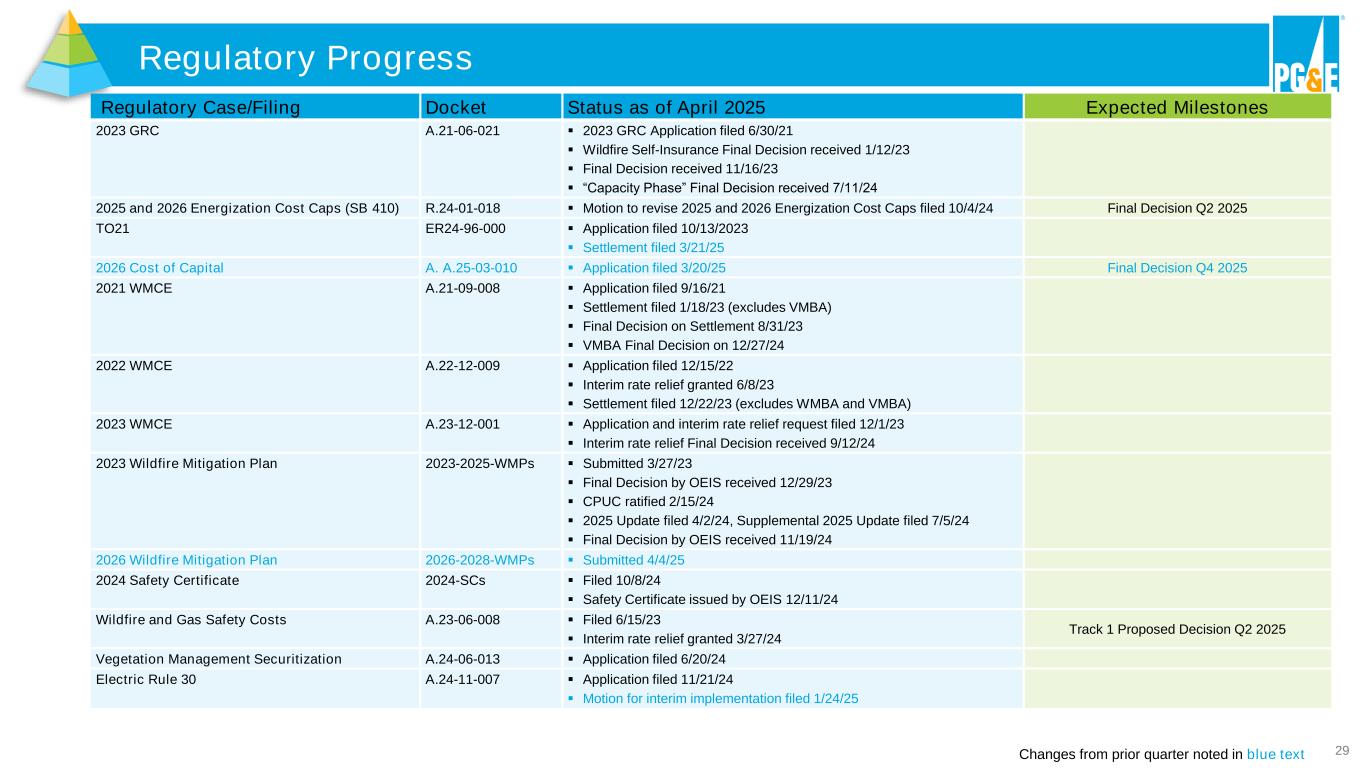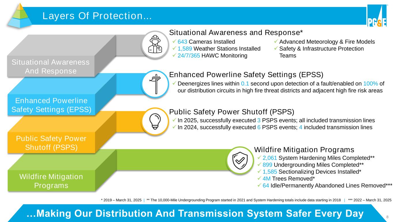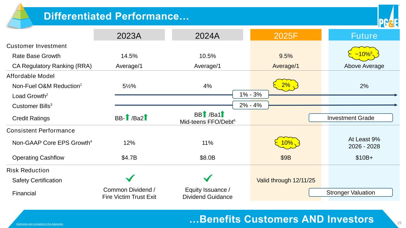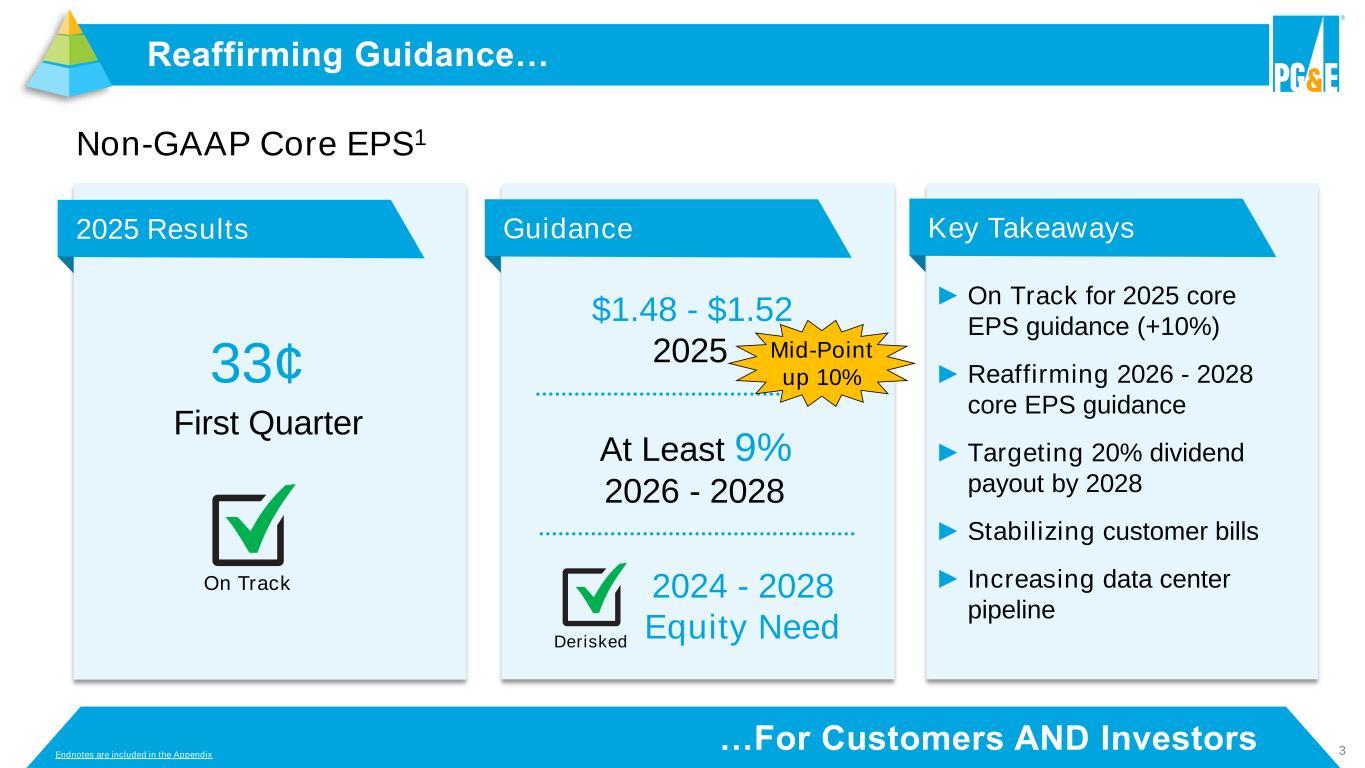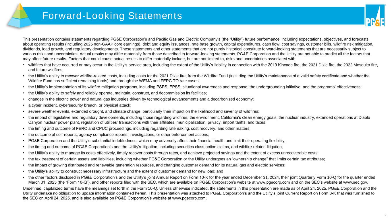 2 This presentation contains statements regarding PG&E Corporation’s and Pacific Gas and Electric Company’s (the “Utility”) future performance, including expectations, objectives, and forecasts about operating results (including 2025 non-GAAP core earnings), debt and equity issuances, rate base growth, capital expenditures, cash flow, cost savings, customer bills, wildfire risk mitigation, dividends, load growth, and regulatory developments. These statements and other statements that are not purely historical constitute forward-looking statements that are necessarily subject to various risks and uncertainties. Actual results may differ materially from those described in forward-looking statements. PG&E Corporation and the Utility are not able to predict all the factors that may affect future results. Factors that could cause actual results to differ materially include, but are not limited to, risks and uncertainties associated with: • wildfires that have occurred or may occur in the Utility’s service area, including the extent of the Utility’s liability in connection with the 2019 Kincade fire, the 2021 Dixie fire, the 2022 Mosquito fire, and future wildfires; • the Utility’s ability to recover wildfire-related costs, including costs for the 2021 Dixie fire, from the Wildfire Fund (including the Utility’s maintenance of a valid safety certificate and whether the Wildfire Fund has sufficient remaining funds) and through the WEMA and FERC TO rate cases; • the Utility’s implementation of its wildfire mitigation programs, including PSPS, EPSS, situational awareness and response, the undergrounding initiative, and the programs’ effectiveness; • the Utility’s ability to safely and reliably operate, maintain, construct, and decommission its facilities; • changes in the electric power and natural gas industries driven by technological advancements and a decarbonized economy; • a cyber incident, cybersecurity breach, or physical attack; • severe weather events, extended drought, and climate change, particularly their impact on the likelihood and severity of wildfires; • the impact of legislative and regulatory developments, including those regarding wildfires, the environment, California’s clean energy goals, the nuclear industry, extended operations at Diablo Canyon nuclear power plant, regulation of utilities’ transactions with their affiliates, municipalization, privacy, import tariffs, and taxes; • the timing and outcome of FERC and CPUC proceedings, including regarding ratemaking, cost recovery, and other matters; • the outcome of self-reports, agency compliance reports, investigations, or other enforcement actions; • PG&E Corporation and the Utility’s substantial indebtedness, which may adversely affect their financial health and limit their operating flexibility; • the timing and outcome of PG&E Corporation’s and the Utility’s litigation, including securities class action claims, and wildfire-related litigation; • the Utility’s ability to manage its costs effectively, timely recover costs through rates, and achieve projected savings and the extent of excess unrecoverable costs; • the tax treatment of certain assets and liabilities, including whether PG&E Corporation or the Utility undergoes an “ownership change” that limits certain tax attributes; • the impact of growing distributed and renewable generation resources, and changing customer demand for its natural gas and electric services; • the Utility’s ability to construct necessary infrastructure and the extent of customer demand for new load; and • the other factors disclosed in PG&E Corporation’s and the Utility’s joint Annual Report on Form 10-K for the year ended December 31, 2024, their joint Quarterly Form 10-Q for the quarter ended March 31, 2025 (the “Form 10-Q”), and other reports filed with the SEC, which are available on PG&E Corporation’s website at www.pgecorp.com and on the SEC’s website at www.sec.gov. Undefined, capitalized terms have the meanings set forth in the Form 10-Q. Unless otherwise indicated, the statements in this presentation are made as of April 24, 2025. PG&E Corporation and the Utility undertake no obligation to update information contained herein. This presentation was attached to PG&E Corporation’s and the Utility’s joint Current Report on Form 8-K that was furnished to the SEC on April 24, 2025, and is also available on PG&E Corporation’s website at www.pgecorp.com. Forward-Looking Statements
