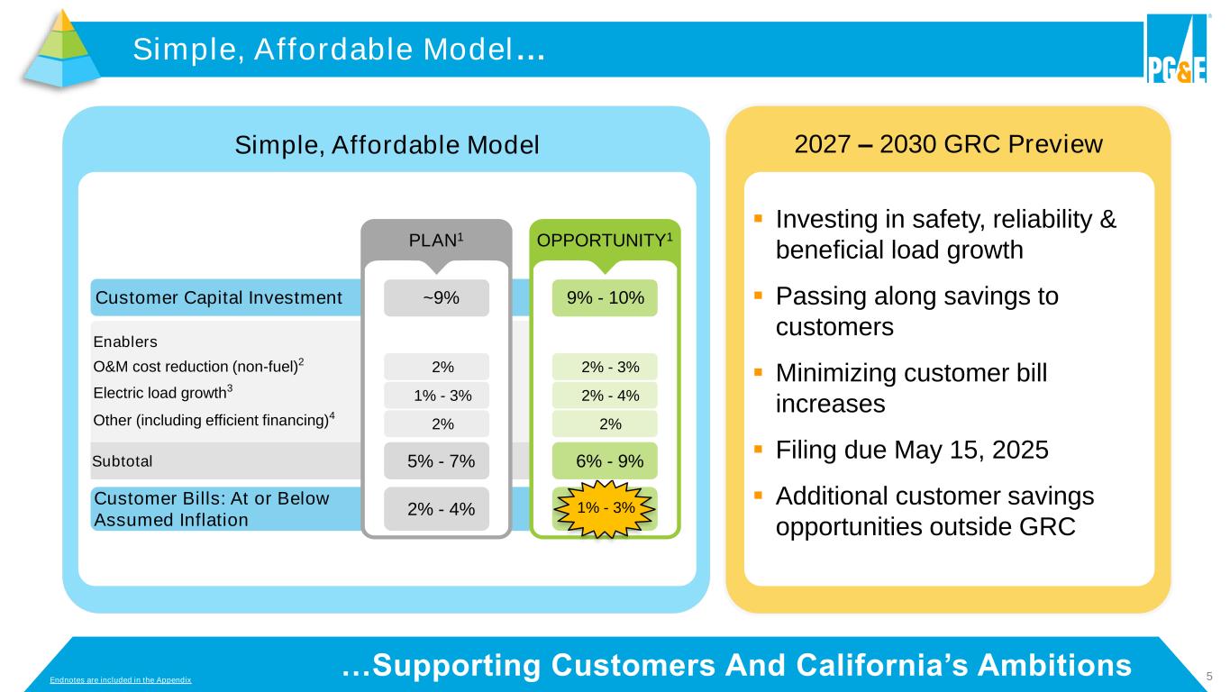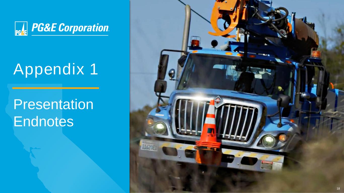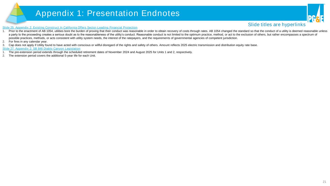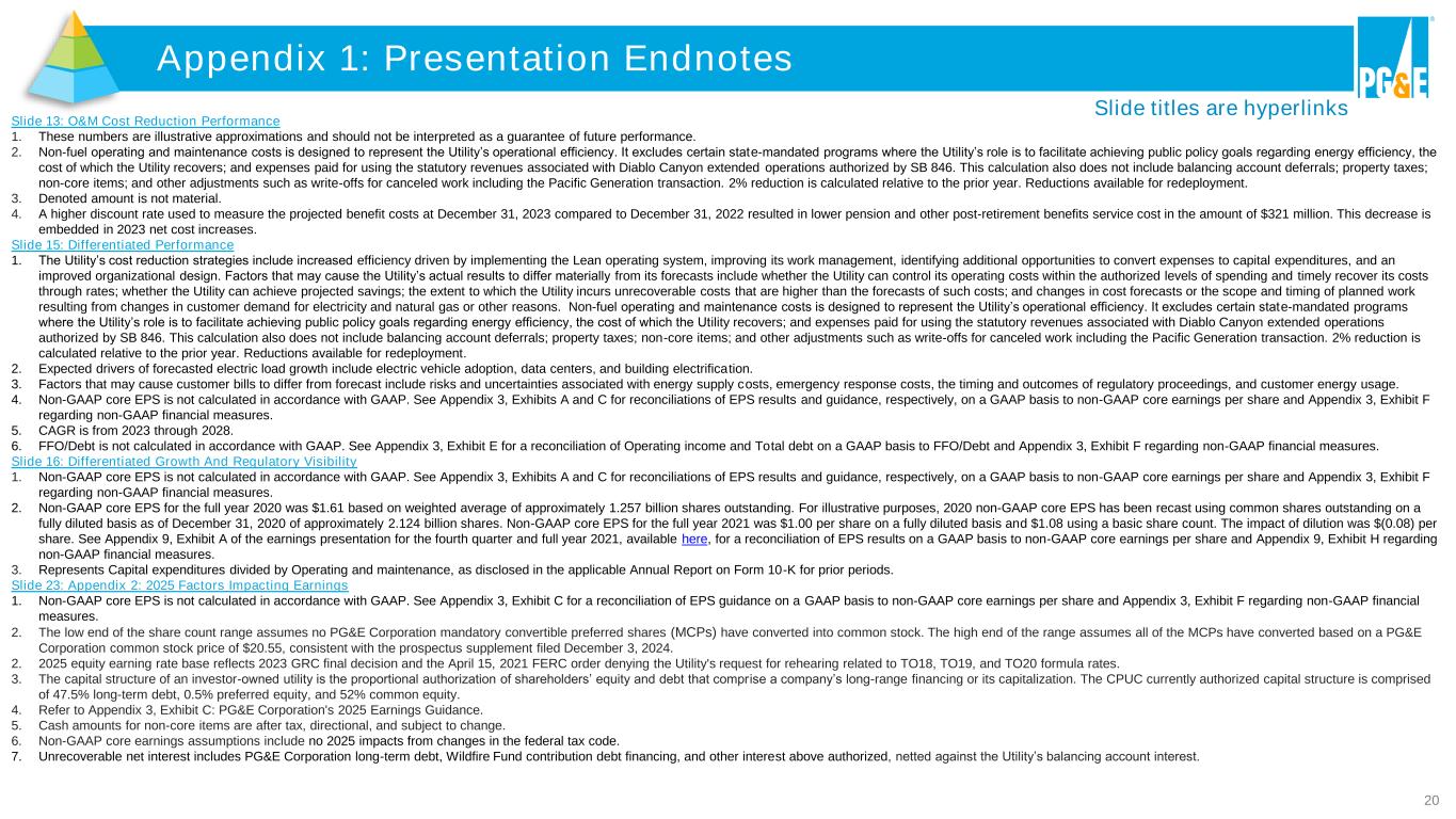 20 Appendix 1: Presentation Endnotes Slide titles are hyperlinks Slide 13: O&M Cost Reduction Performance 1. These numbers are illustrative approximations and should not be interpreted as a guarantee of future performance. 2. Non-fuel operating and maintenance costs is designed to represent the Utility’s operational efficiency. It excludes certain state-mandated programs where the Utility’s role is to facilitate achieving public policy goals regarding energy efficiency, the cost of which the Utility recovers; and expenses paid for using the statutory revenues associated with Diablo Canyon extended operations authorized by SB 846. This calculation also does not include balancing account deferrals; property taxes; non-core items; and other adjustments such as write-offs for canceled work including the Pacific Generation transaction. 2% reduction is calculated relative to the prior year. Reductions available for redeployment. 3. Denoted amount is not material. 4. A higher discount rate used to measure the projected benefit costs at December 31, 2023 compared to December 31, 2022 resulted in lower pension and other post-retirement benefits service cost in the amount of $321 million. This decrease is embedded in 2023 net cost increases. Slide 15: Differentiated Performance 1. The Utility’s cost reduction strategies include increased efficiency driven by implementing the Lean operating system, improving its work management, identifying additional opportunities to convert expenses to capital expenditures, and an improved organizational design. Factors that may cause the Utility’s actual results to differ materially from its forecasts include whether the Utility can control its operating costs within the authorized levels of spending and timely recover its costs through rates; whether the Utility can achieve projected savings; the extent to which the Utility incurs unrecoverable costs that are higher than the forecasts of such costs; and changes in cost forecasts or the scope and timing of planned work resulting from changes in customer demand for electricity and natural gas or other reasons. Non-fuel operating and maintenance costs is designed to represent the Utility’s operational efficiency. It excludes certain state-mandated programs where the Utility’s role is to facilitate achieving public policy goals regarding energy efficiency, the cost of which the Utility recovers; and expenses paid for using the statutory revenues associated with Diablo Canyon extended operations authorized by SB 846. This calculation also does not include balancing account deferrals; property taxes; non-core items; and other adjustments such as write-offs for canceled work including the Pacific Generation transaction. 2% reduction is calculated relative to the prior year. Reductions available for redeployment. 2. Expected drivers of forecasted electric load growth include electric vehicle adoption, data centers, and building electrification. 3. Factors that may cause customer bills to differ from forecast include risks and uncertainties associated with energy supply costs, emergency response costs, the timing and outcomes of regulatory proceedings, and customer energy usage. 4. Non-GAAP core EPS is not calculated in accordance with GAAP. See Appendix 3, Exhibits A and C for reconciliations of EPS results and guidance, respectively, on a GAAP basis to non-GAAP core earnings per share and Appendix 3, Exhibit F regarding non-GAAP financial measures. 5. CAGR is from 2023 through 2028. 6. FFO/Debt is not calculated in accordance with GAAP. See Appendix 3, Exhibit E for a reconciliation of Operating income and Total debt on a GAAP basis to FFO/Debt and Appendix 3, Exhibit F regarding non-GAAP financial measures. Slide 16: Differentiated Growth And Regulatory Visibility 1. Non-GAAP core EPS is not calculated in accordance with GAAP. See Appendix 3, Exhibits A and C for reconciliations of EPS results and guidance, respectively, on a GAAP basis to non-GAAP core earnings per share and Appendix 3, Exhibit F regarding non-GAAP financial measures. 2. Non-GAAP core EPS for the full year 2020 was $1.61 based on weighted average of approximately 1.257 billion shares outstanding. For illustrative purposes, 2020 non-GAAP core EPS has been recast using common shares outstanding on a fully diluted basis as of December 31, 2020 of approximately 2.124 billion shares. Non-GAAP core EPS for the full year 2021 was $1.00 per share on a fully diluted basis and $1.08 using a basic share count. The impact of dilution was $(0.08) per share. See Appendix 9, Exhibit A of the earnings presentation for the fourth quarter and full year 2021, available here, for a reconciliation of EPS results on a GAAP basis to non-GAAP core earnings per share and Appendix 9, Exhibit H regarding non-GAAP financial measures. 3. Represents Capital expenditures divided by Operating and maintenance, as disclosed in the applicable Annual Report on Form 10-K for prior periods. Slide 23: Appendix 2: 2025 Factors Impacting Earnings 1. Non-GAAP core EPS is not calculated in accordance with GAAP. See Appendix 3, Exhibit C for a reconciliation of EPS guidance on a GAAP basis to non-GAAP core earnings per share and Appendix 3, Exhibit F regarding non-GAAP financial measures. 2. The low end of the share count range assumes no PG&E Corporation mandatory convertible preferred shares (MCPs) have converted into common stock. The high end of the range assumes all of the MCPs have converted based on a PG&E Corporation common stock price of $20.55, consistent with the prospectus supplement filed December 3, 2024. 2. 2025 equity earning rate base reflects 2023 GRC final decision and the April 15, 2021 FERC order denying the Utility's request for rehearing related to TO18, TO19, and TO20 formula rates. 3. The capital structure of an investor-owned utility is the proportional authorization of shareholders’ equity and debt that comprise a company’s long-range financing or it
