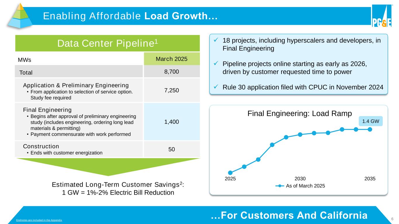 5…Supporting Customers And California’s Ambitions Simple, Affordable Model… Simple, Affordable Model 2027 – 2030 GRC Preview ▪ Investing in safety, reliability & beneficial load growth ▪ Passing along savings to customers ▪ Minimizing customer bill increases ▪ Filing due May 15, 2025 ▪ Additional customer savings opportunities outside GRC Subtotal Enablers O&M cost reduction (non-fuel)2 Electric load growth3 Other (including efficient financing)4 Customer Capital Investment Customer Bills: At or Below Assumed Inflation 2% 1% - 3% 2% ~9% 5% - 7% 2% - 4% PLAN1 2% - 3%2% - 4% 2% 9% - 10% 6% - 9%1% - 3% 2% - 3% 2% - 4% 2 9% - 10% 6% - 9% 1% - 3% OPPORTUNITY1 1% - Endnotes are included in the Appendix