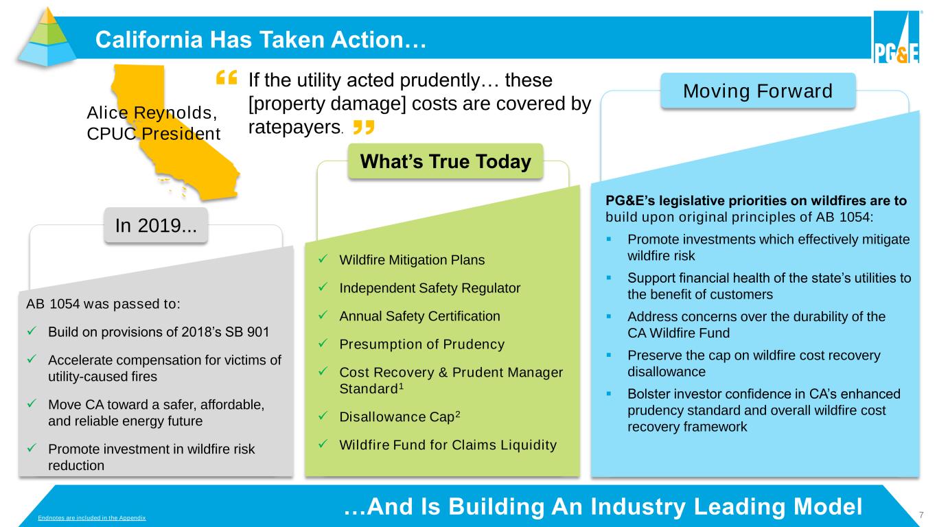 7 California Has Taken Action… …And Is Building An Industry Leading Model In 2019... What’s True Today Moving Forward AB 1054 was passed to: ✓ Build on provisions of 2018’s SB 901 ✓ Accelerate compensation for victims of utility-caused fires ✓ Move CA toward a safer, affordable, and reliable energy future ✓ Promote investment in wildfire risk reduction ✓ Wildfire Mitigation Plans ✓ Independent Safety Regulator ✓ Annual Safety Certification ✓ Presumption of Prudency ✓ Cost Recovery & Prudent Manager Standard1 ✓ Disallowance Cap2 ✓ Wildfire Fund for Claims Liquidity PG&E’s legislative priorities on wildfires are to build upon original principles of AB 1054: ▪ Promote investments which effectively mitigate wildfire risk ▪ Support financial health of the state’s utilities to the benefit of customers ▪ Address concerns over the durability of the CA Wildfire Fund ▪ Preserve the cap on wildfire cost recovery disallowance ▪ Bolster investor confidence in CA’s enhanced prudency standard and overall wildfire cost recovery framework Alice Reynolds, CPUC President If the utility acted prudently… these [property damage] costs are covered by ratepayers. Endnotes are included in the Appendix
