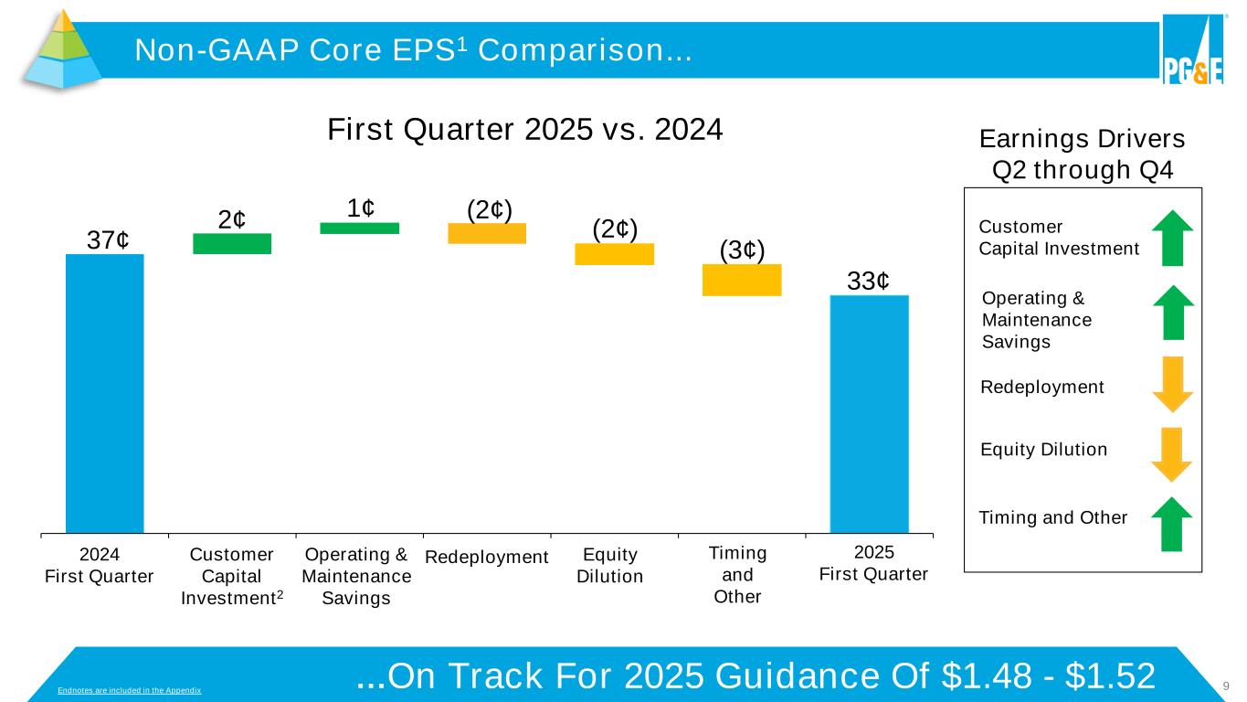 35 All amounts presented in the table above are tax adjusted at PG&E Corporation’s statutory tax rate of 27.98% for 2025 and 2024. Amounts may not sum due to rounding. (1) See Exhibit A for reconciliations of (i) earnings on a GAAP basis to non-GAAP core earnings and (ii) EPS on a GAAP basis to non-GAAP core EPS. (2) Represents operating and maintenance savings for various initiatives during the three months ended March 31, 2025. Examples include reduced contract spend through contract rationalization and process improvements. (3) Represents redeployment of operating and maintenance savings to fund various programs including those that support risk mitigation such as inspections, gas corrosion, and distribution system maintenance during the three months ended March 31, 2025. (4) The earnings impact represents the dividend payment for the mandatory convertible preferred (MCP) shares issued in 2024. The earnings per common share represents the impact of both the MCP dividend and dilution resulting from the common equity issued in December 2024 for the three months ended March 31, 2025. (5) Represents the impact to quarterly earnings for items considered timing such as taxes, capitalized overheads and other miscellaneous items such as depreciation and interest expense during the three months ended March 31, 2025. First Quarter 2025 vs. 2024 Earnings Earnings per Common Share 2024 Non-GAAP Core Earnings/EPS (1) $ 800 $ 0.37 Customer capital investment 40 0.02 Operating & maintenance savings (2) 19 0.01 Redeployment (3) (38) (0.02) Equity dilution (4) (24) (0.02) Timing and Other (5) (69) (0.03) 2025 Non-GAAP Core Earnings/EPS (1) $ 728 $ 0.33 (in millions, except per share amounts) Exhibit B: Key Drivers of PG&E Corporation's Non-GAAP Core Earnings per Common Share ("EPS") Exhibit B: Key Drivers of PG&E Corporation's Non-GAAP Core Earnings per Common Share ("EPS")