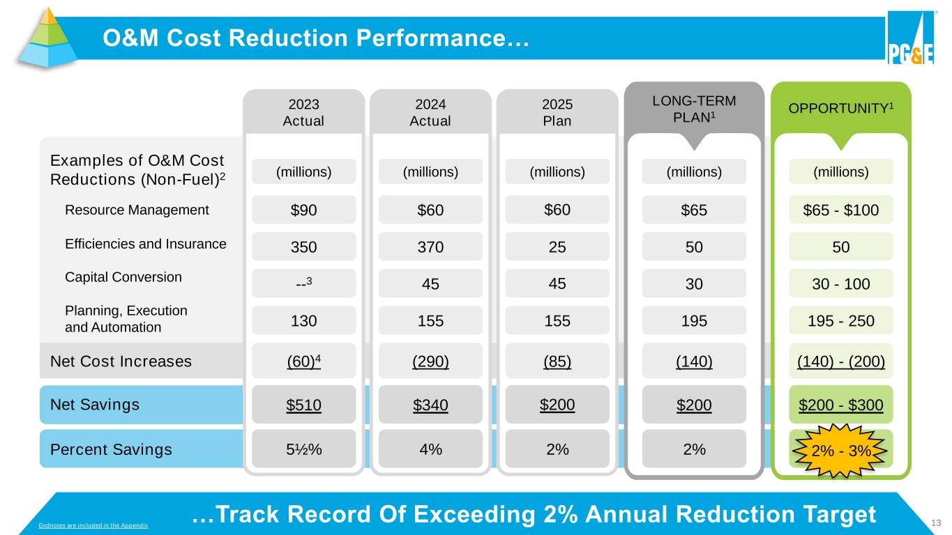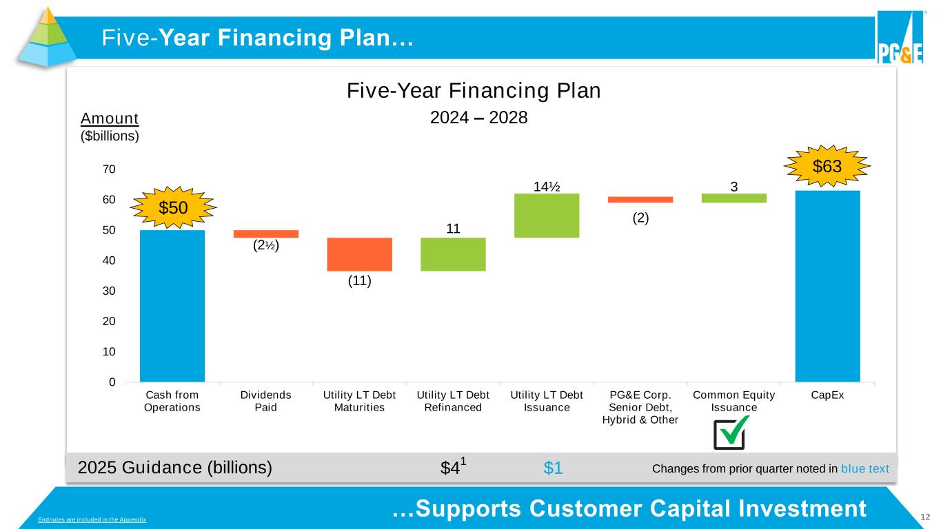 12…Supports Customer Capital Investment Five-Year Financing Plan… (2½) (11) 11 3 0 10 20 30 40 50 60 70 Cash from Operations Dividends Paid Utility LT Debt Maturities Utility LT Debt Refinanced Utility LT Debt Issuance PG&E Corp. Senior Debt, Hybrid & Other Common Equity Issuance CapEx $50 $63 Amount ($billions) 2024 – 2028 Five-Year Financing Plan 14½ (2) Endnotes are included in the Appendix $4 1 $12025 Guidance (billions) Changes from prior quarter noted in blue text