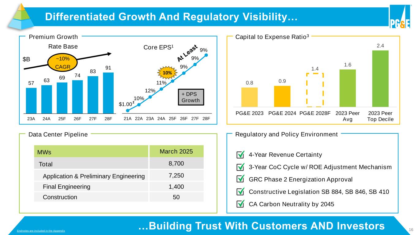 15…Benefits Customers AND Investors Differentiated Performance… 2023A 2024A 2025F Future Customer Investment Rate Base Growth 14.5% 10.5% 9.5% CA Regulatory Ranking (RRA) Average/1 Average/1 Average/1 Above Average Affordable Model Non-Fuel O&M Reduction1 5½% 4% 2% 2% Load Growth2 Customer Bills3 Credit Ratings BB- /Ba2 BB /Ba1 Mid-teens FFO/Debt6 Consistent Performance Non-GAAP Core EPS Growth4 12% 11% 10% At Least 9% 2026 - 2028 Operating Cashflow $4.7B $8.0B $9B $10B+ Risk Reduction Safety Certification Valid through 12/11/25 Financial Common Dividend / Fire Victim Trust Exit Equity Issuance / Dividend Guidance 1% - 3% 2% - 4% Stronger Valuation 2 ~10%5 Investment Grade 10 Endnotes are included in the Appendix