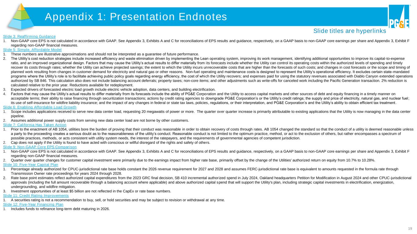 19 Appendix 1: Presentation Endnotes Slide 3: Reaffirming Guidance 1. Non-GAAP core EPS is not calculated in accordance with GAAP. See Appendix 3, Exhibits A and C for reconciliations of EPS results and guidance, respectively, on a GAAP basis to non-GAAP core earnings per share and Appendix 3, Exhibit F regarding non-GAAP financial measures. Slide 5: Simple, Affordable Model 1. These numbers are illustrative approximations and should not be interpreted as a guarantee of future performance. 2. The Utility’s cost reduction strategies include increased efficiency and waste elimination driven by implementing the Lean operating system, improving its work management, identifying additional opportunities to improve its capital-to-expense ratio, and an improved organizational design. Factors that may cause the Utility’s actual results to differ materially from i ts forecasts include whether the Utility can control its operating costs within the authorized levels of spending and timely recover its costs through rates; whether the Utility can achieve projected savings; the extent to which the Utility incurs unrecoverable costs that are higher than the forecasts of such costs; and changes in cost forecasts or the scope and timing of planned work resulting from changes in customer demand for electricity and natural gas or other reasons. Non-fuel operating and maintenance costs is designed to represent the Utility’s operational efficiency. It excludes certain state-mandated programs where the Utility’s role is to facilitate achieving public policy goals regarding energy efficiency, the cost of which the Utility recovers; and expenses paid for using the statutory revenues associated with Diablo Canyon extended operations authorized by SB 846. This calculation also does not include balancing account deferrals; property taxes; non-core items; and other adjustments such as write-offs for canceled work including the Pacific Generation transaction. 2% reduction is calculated relative to the prior year. Reductions available for redeployment. 3. Expected drivers of forecasted electric load growth include electric vehicle adoption, data centers, and building electrification. 4. Factors that may cause the Utility’s actual results to differ materially from its forecasts include the ability of PG&E Corporation and the Utility to access capital markets and other sources of debt and equity financing in a timely manner on acceptable terms; their ability to raise financing through securitization transactions; actions by credit rating agencies to downgrade PG&E Corporation’s or the Utility’s credit ratings; the supply and price of electricity, natural gas, and nuclear fuel ; its use of self-insurance for wildfire liability insurance; and the impact of any changes in federal or state tax laws, policies , regulations, or their interpretation, and PG&E Corporation’s and the Utility’s ability to obtain efficient tax treatment. Slide 6: Enabling Affordable Load Growth 1. Scope includes applications received to serve new data center load, requesting 20 megawatts of power or more. The quarter over quarter increase is primarily attributable to existing applications that the Utility is now managing in the data center pipeline. 2. Assumes additional power supply costs from serving new data center load are not borne by other customers. Slide 7: California Has Taken Action 1. Prior to the enactment of AB 1054, utilities bore the burden of proving that their conduct was reasonable in order to obtain recovery of costs through rates. AB 1054 changed the standard so that the conduct of a utility is deemed reasonable unless a party to the proceeding creates a serious doubt as to the reasonableness of the utility’s conduct. Reasonable conduct is not limited to the optimum practice, method, or act to the exclusion of others, but rather encompasses a spectrum of possible practices, methods, or acts consistent with utility system needs, the interest of the ratepayers, and the requirements of governmental agencies of competent jurisdiction. 2. Cap does not apply if the Utility is found to have acted with conscious or willful disregard of the rights and safety of others. Slide 9: Non-GAAP Core EPS Comparison 1. Non-GAAP core EPS is not calculated in accordance with GAAP. See Appendix 3, Exhibits A and C for reconciliations of EPS results and guidance, respectively, on a GAAP basis to non-GAAP core earnings per share and Appendix 3, Exhibit F regarding non-GAAP financial measures. 2. Quarter over quarter changes for customer capital investment were primarily due to the earnings impact from higher rate base, primarily offset by the change of the Utilities' authorized return on equity from 10.7% to 10.28%. Slide 10: Five-Year Capital Plan 1. Percentage already authorized for CPUC-jurisdictional rate base holds constant the 2026 revenue requirement for 2027 and 2028 and assumes FERC-jurisdictional rate base is equivalent to amounts requested in the formula rate through Transmission Owner rate proceedings for years 2024 through 2028. 2. Rate base point estimates reflect authorized capital expenditures from the 2023 GRC final decision, SB 410 incremental authorized spend in July 2024, Oakland headquarters Petition for Modification in August 2024 and other CPUC-jurisdictional approvals (including the full amount recoverable through a balancing account where applicable) and above authorized capital spend that will support the Utility's plan, including strategic capital investments in electrification, energization, undergrounding, and wildfire mitigation. 3. Investment opportunities of at least $5 billion are not reflected in the CapEx or rate base numbers. Slide 11: Credit Rating Improvements 1. A securities rating is not a recommendation to buy, sell, or hold securities and may be subject to revision or withdrawal at any time. Slide 12: Five-Year Financing Plan 1. Includes funds to refinance long-term debt maturing in 2026. Sl