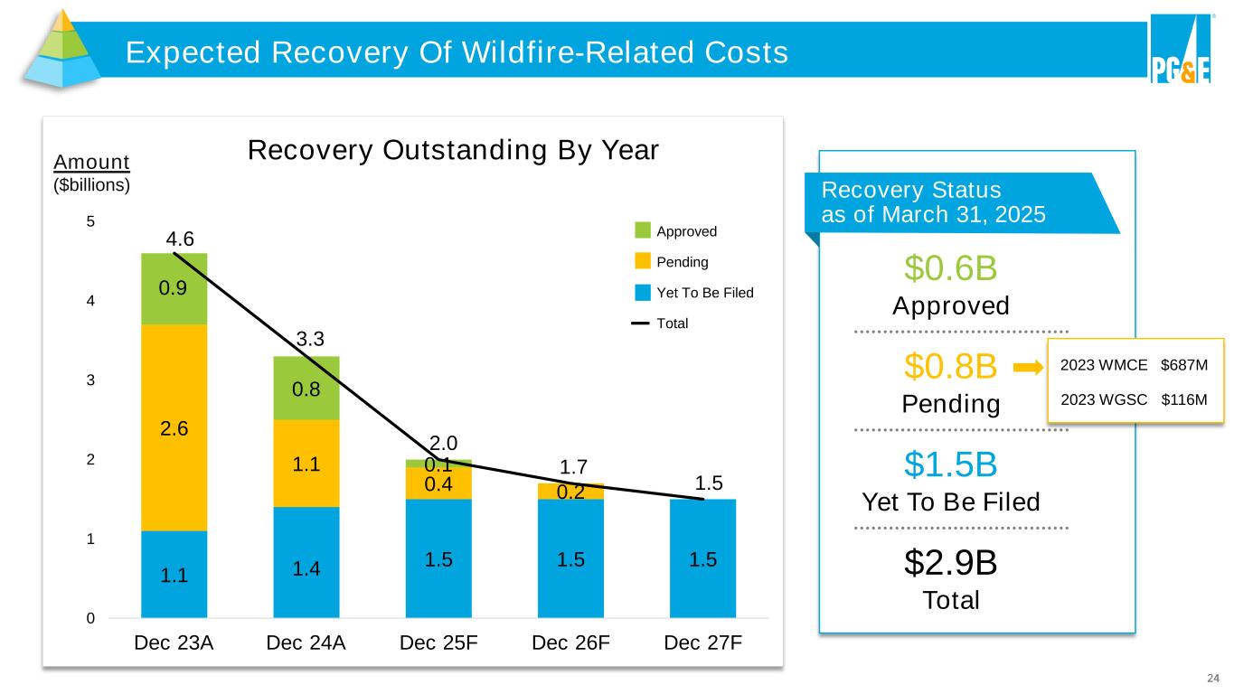24 Expected Recovery Of Wildfire-Related Costs Recovery Outstanding By Year 1.1 1.4 1.5 1.5 1.5 2.6 1.1 0.4 0.2 0.9 0.8 0.1 4.6 3.3 2.0 1.7 1.5 0 1 2 3 4 5 Dec 23A Dec 24A Dec 25F Dec 26F Dec 27F Approved Pending Yet To Be Filed Total Amount ($billions) $0.6B Approved Recovery Status as of March 31, 2025 $0.8B Pending $1.5B Yet To Be Filed $2.9B Total 2023 WMCE $687M 2023 WGSC $116M