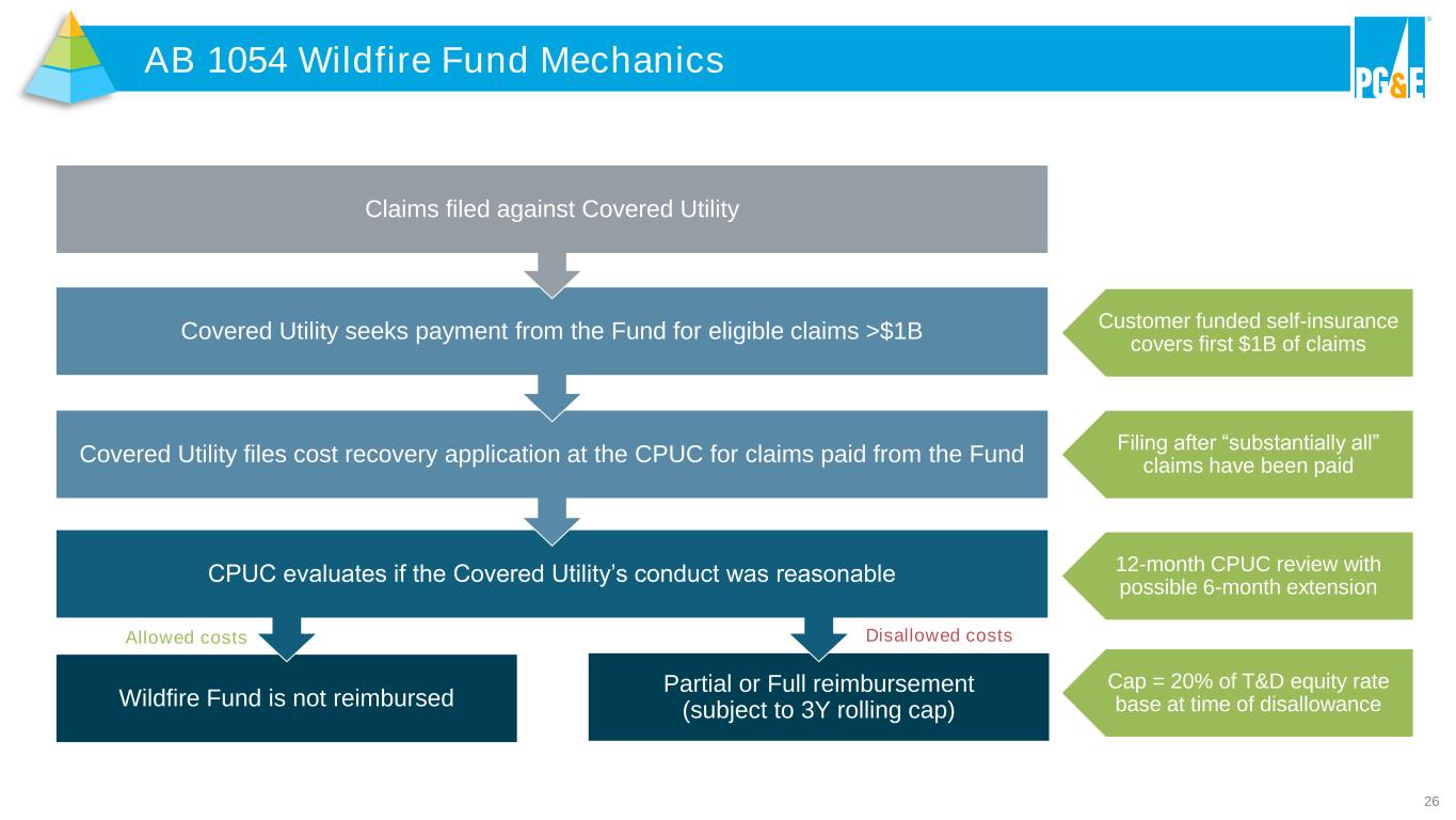 Public 26 AB 1054 Wildfire Fund Mechanics Wildfire Fund is not reimbursed Partial or Full reimbursement (subject to 3Y rolling cap) CPUC evaluates if the Covered Utility’s conduct was reasonable Covered Utility files cost recovery application at the CPUC for claims paid from the Fund Covered Utility seeks payment from the Fund for eligible claims >$1B Disallowed costsAllowed costs Claims filed against Covered Utility Filing after “substantially all” claims have been paid 12-month CPUC review with possible 6-month extension Customer funded self-insurance covers first $1B of claims Cap = 20% of T&D equity rate base at time of disallowance