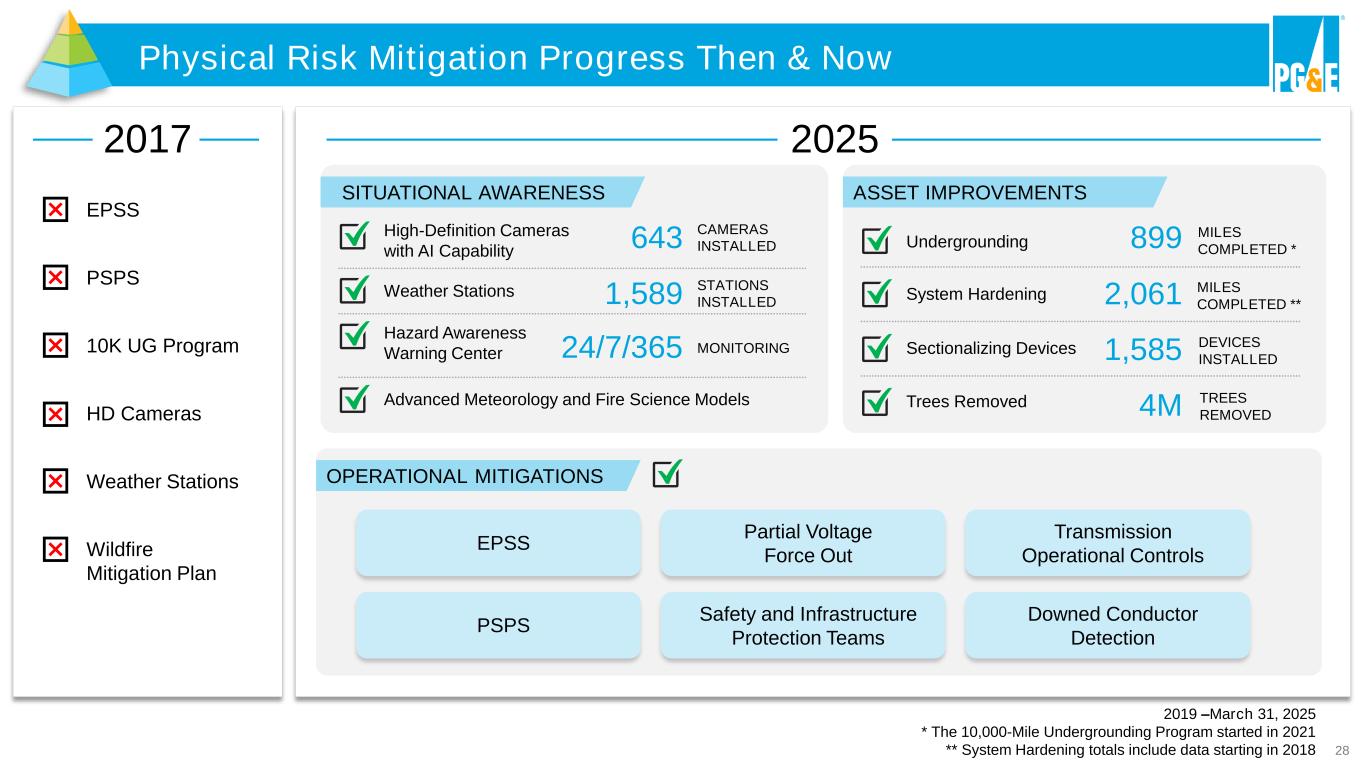 28 Physical Risk Mitigation Progress Then & Now 2017 EPSS PSPS 10K UG Program HD Cameras Weather Stations Wildfire Mitigation Plan SITUATIONAL AWARENESS High-Definition Cameras with AI Capability Weather Stations Hazard Awareness Warning Center Advanced Meteorology and Fire Science Models 643 CAMERAS INSTALLED 1,589 STATIONS INSTALLED 24/7/365 MONITORING ASSET IMPROVEMENTS Undergrounding System Hardening Sectionalizing Devices Trees Removed 899 MILES COMPLETED * 2,061 MILES COMPLETED ** 1,585 DEVICES INSTALLED 4M TREES REMOVED OPERATIONAL MITIGATIONS EPSS PSPS Partial Voltage Force Out Safety and Infrastructure Protection Teams Transmission Operational Controls Downed Conductor Detection 2019 –March 31, 2025 * The 10,000-Mile Undergrounding Program started in 2021 ** System Hardening totals include data starting in 2018 2025