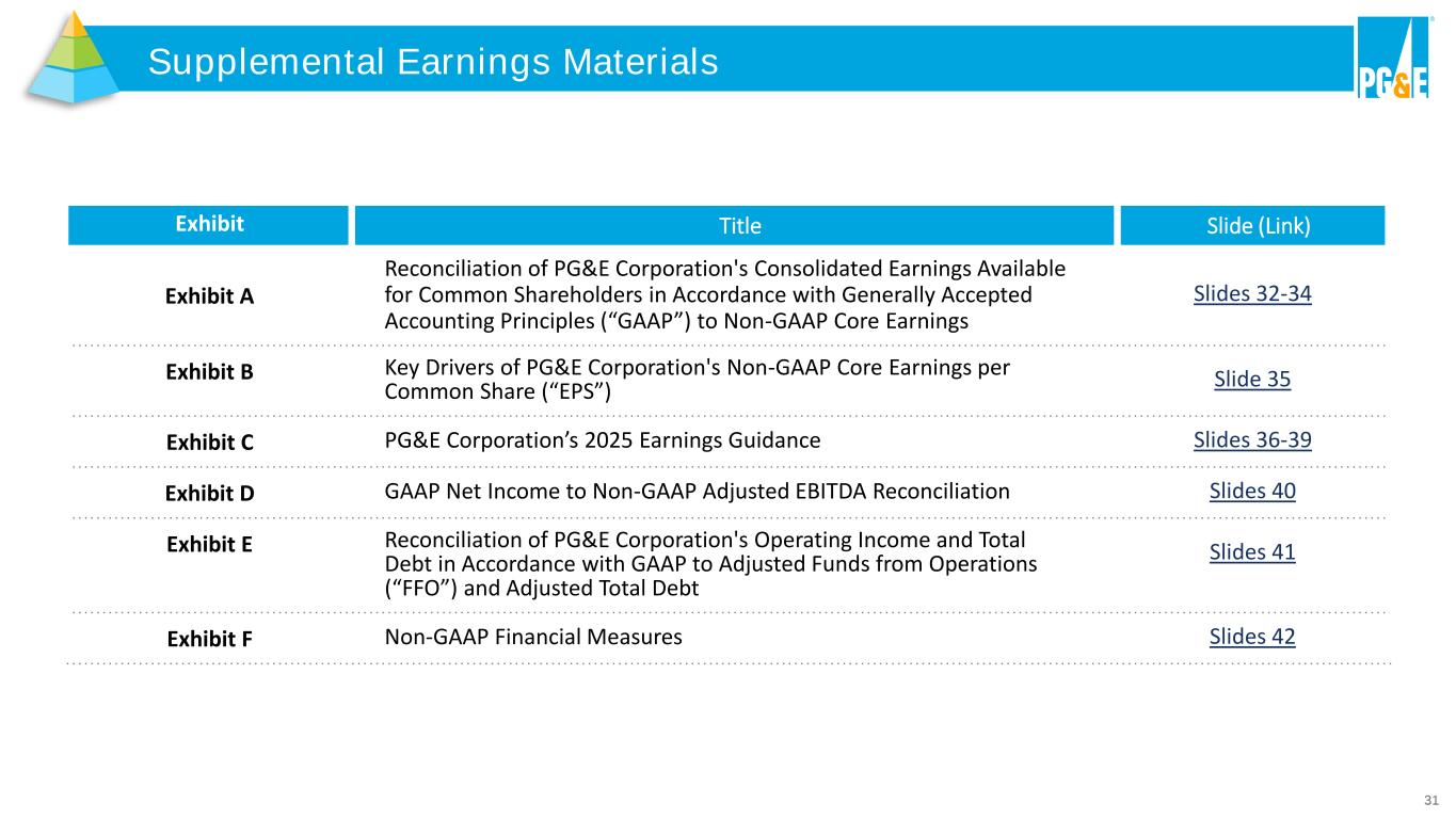 31 Supplemental Earnings Materials Exhibit Title Slide (Link) Exhibit A Reconciliation of PG&E Corporation's Consolidated Earnings Available for Common Shareholders in Accordance with Generally Accepted Accounting Principles (“GAAP”) to Non-GAAP Core Earnings Slides 32-34 Exhibit B Key Drivers of PG&E Corporation's Non-GAAP Core Earnings per Common Share (“EPS”) Slide 35 Exhibit C PG&E Corporation’s 2025 Earnings Guidance Slides 36-39 Exhibit D GAAP Net Income to Non-GAAP Adjusted EBITDA Reconciliation Slides 40 Exhibit E Reconciliation of PG&E Corporation's Operating Income and Total Debt in Accordance with GAAP to Adjusted Funds from Operations (“FFO”) and Adjusted Total Debt Slides 41 Exhibit F Non-GAAP Financial Measures Slides 42