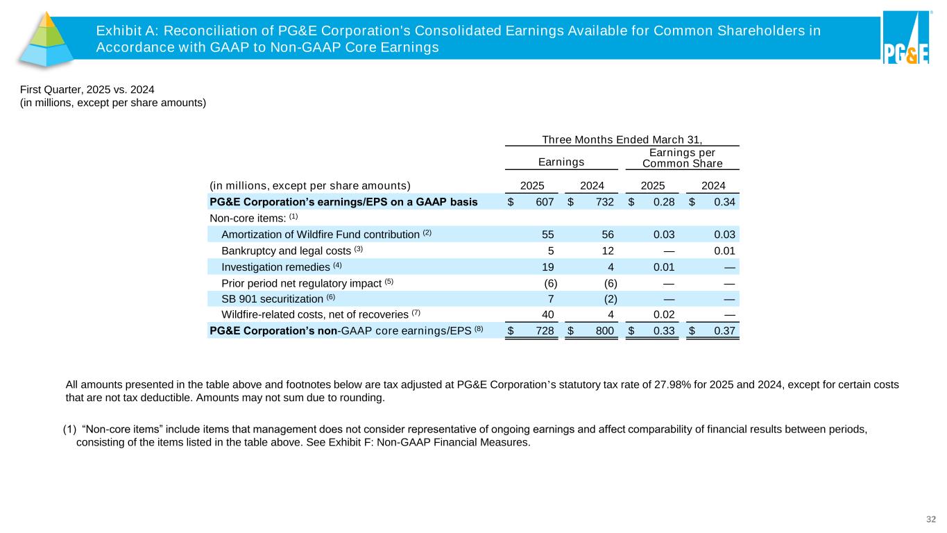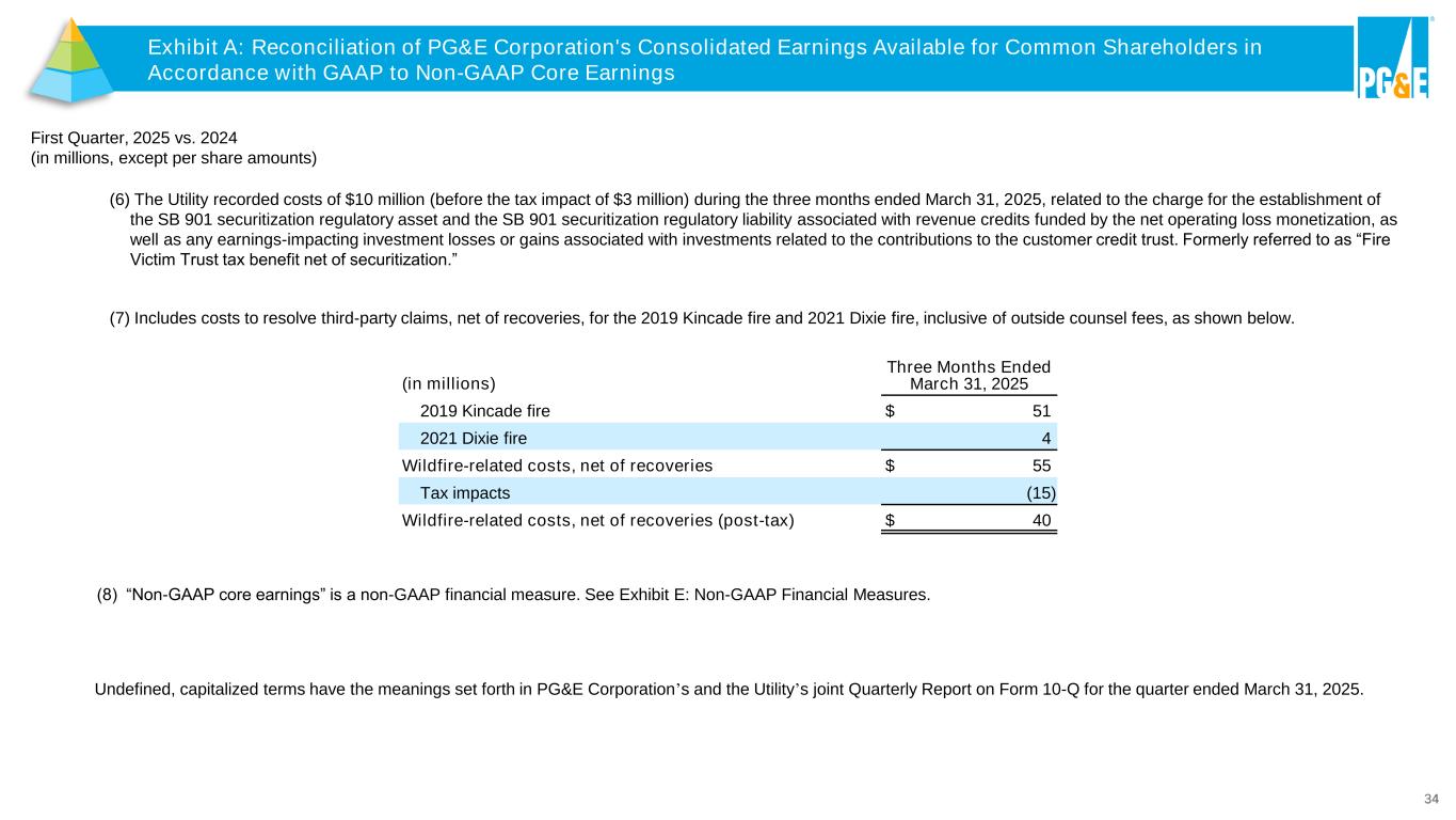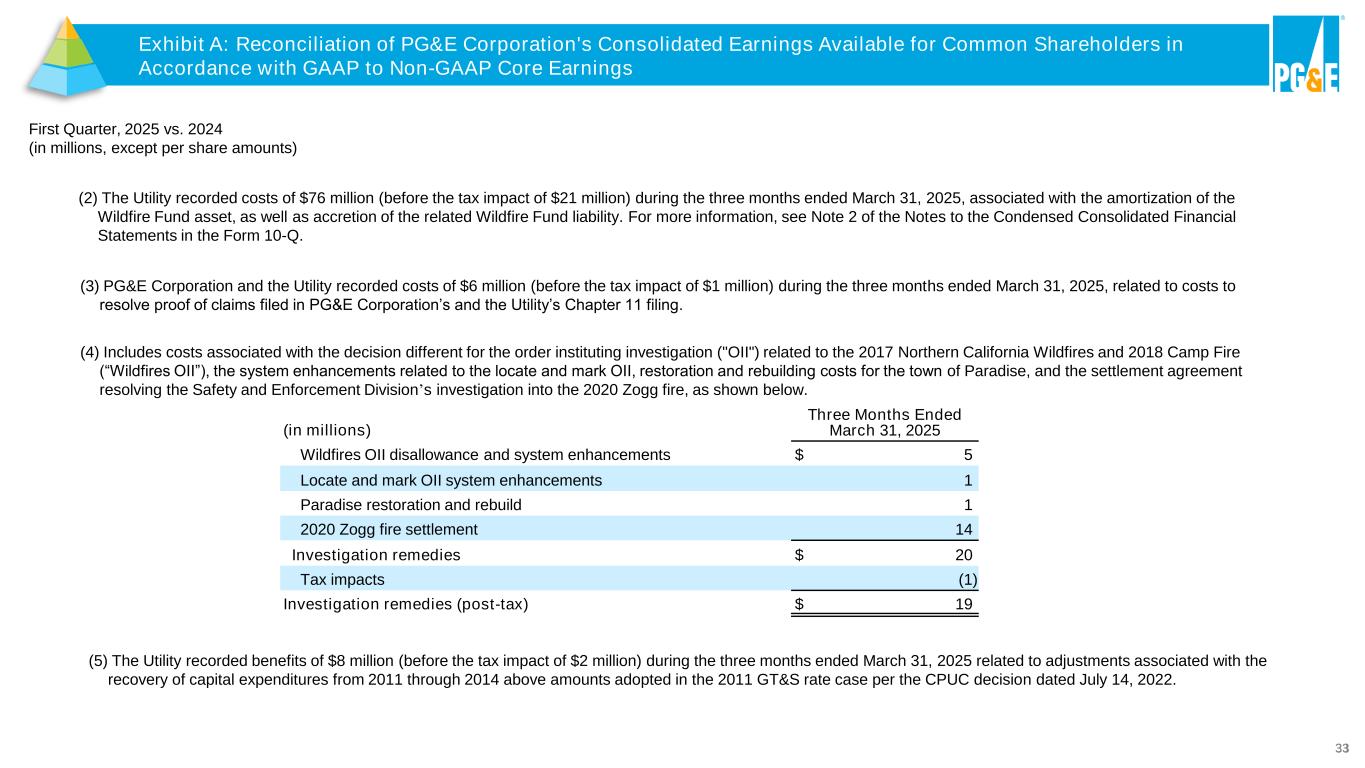 33 First Quarter, 2025 vs. 2024 (in millions, except per share amounts) (3) PG&E Corporation and the Utility recorded costs of $6 million (before the tax impact of $1 million) during the three months ended March 31, 2025, related to costs to resolve proof of claims filed in PG&E Corporation’s and the Utility’s Chapter 11 filing. (2) The Utility recorded costs of $76 million (before the tax impact of $21 million) during the three months ended March 31, 2025, associated with the amortization of the Wildfire Fund asset, as well as accretion of the related Wildfire Fund liability. For more information, see Note 2 of the Notes to the Condensed Consolidated Financial Statements in the Form 10-Q. Exhibit A: Reconciliation of PG&E Corporation's Consolidated Earnings Available for Common Shareholders in Accordance with Generally Accepted Accounting Principles ("GAAP") to Non-GAAP Core Earnings Exhibit A: Reconciliation of PG&E Corporation's Consolidated Earnings Available for Common Shareholders in Accordance with GAAP to Non-GAAP Core Earnings (4) Includes costs associated with the decision different for the order instituting investigation ("OII") related to the 2017 Northern California Wildfires and 2018 Camp Fire (“Wildfires OII”), the system enhancements related to the locate and mark OII, restoration and rebuilding costs for the town of Paradise, and the settlement agreement resolving the Safety and Enforcement Division’s investigation into the 2020 Zogg fire, as shown below. (in millions) Three Months Ended March 31, 2025 Wildfires OII disallowance and system enhancements $ 5 Locate and mark OII system enhancements 1 Paradise restoration and rebuild 1 2020 Zogg fire settlement 14 Investigation remedies $ 20 Tax impacts (1) Investigation remedies (post-tax) $ 19 (5) The Utility recorded benefits of $8 million (before the tax impact of $2 million) during the three months ended March 31, 2025 related to adjustments associated with the recovery of capital expenditures from 2011 through 2014 above amounts adopted in the 2011 GT&S rate case per the CPUC decision dated July 14, 2022.