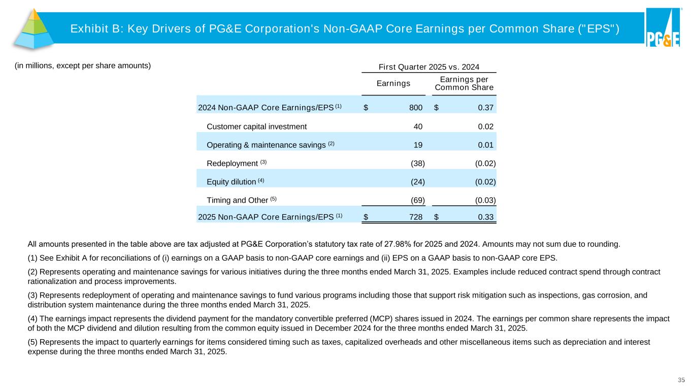34 First Quarter, 2025 vs. 2024 (in millions, except per share amounts) (8) “Non-GAAP core earnings” is a non-GAAP financial measure. See Exhibit E: Non-GAAP Financial Measures. Undefined, capitalized terms have the meanings set forth in PG&E Corporation’s and the Utility’s joint Quarterly Report on Form 10-Q for the quarter ended March 31, 2025. (7) Includes costs to resolve third-party claims, net of recoveries, for the 2019 Kincade fire and 2021 Dixie fire, inclusive of outside counsel fees, as shown below. (in millions) Three Months Ended March 31, 2025 2019 Kincade fire $ 51 2021 Dixie fire 4 Wildfire-related costs, net of recoveries $ 55 Tax impacts (15) Wildfire-related costs, net of recoveries (post-tax) $ 40 Exhibit A: Reconciliation of PG&E Corporation's Consolidated Earnings Available for Common Shareholders in Accordance with Generally Accepted Accounting Principles ("GAAP") to Non-GAAP Core Earnings Exhibit A: Reconciliation of PG&E Corporation's Consolidated Earnings Available for Common Shareholders in Accordance with GAAP to Non-GAAP Core Earnings (6) The Utility recorded costs of $10 million (before the tax impact of $3 million) during the three months ended March 31, 2025, related to the charge for the establishment of the SB 901 securitization regulatory asset and the SB 901 securitization regulatory liability associated with revenue credits funded by the net operating loss monetization, as well as any earnings-impacting investment losses or gains associated with investments related to the contributions to the customer credit trust. Formerly referred to as “Fire Victim Trust tax benefit net of securitization.”
