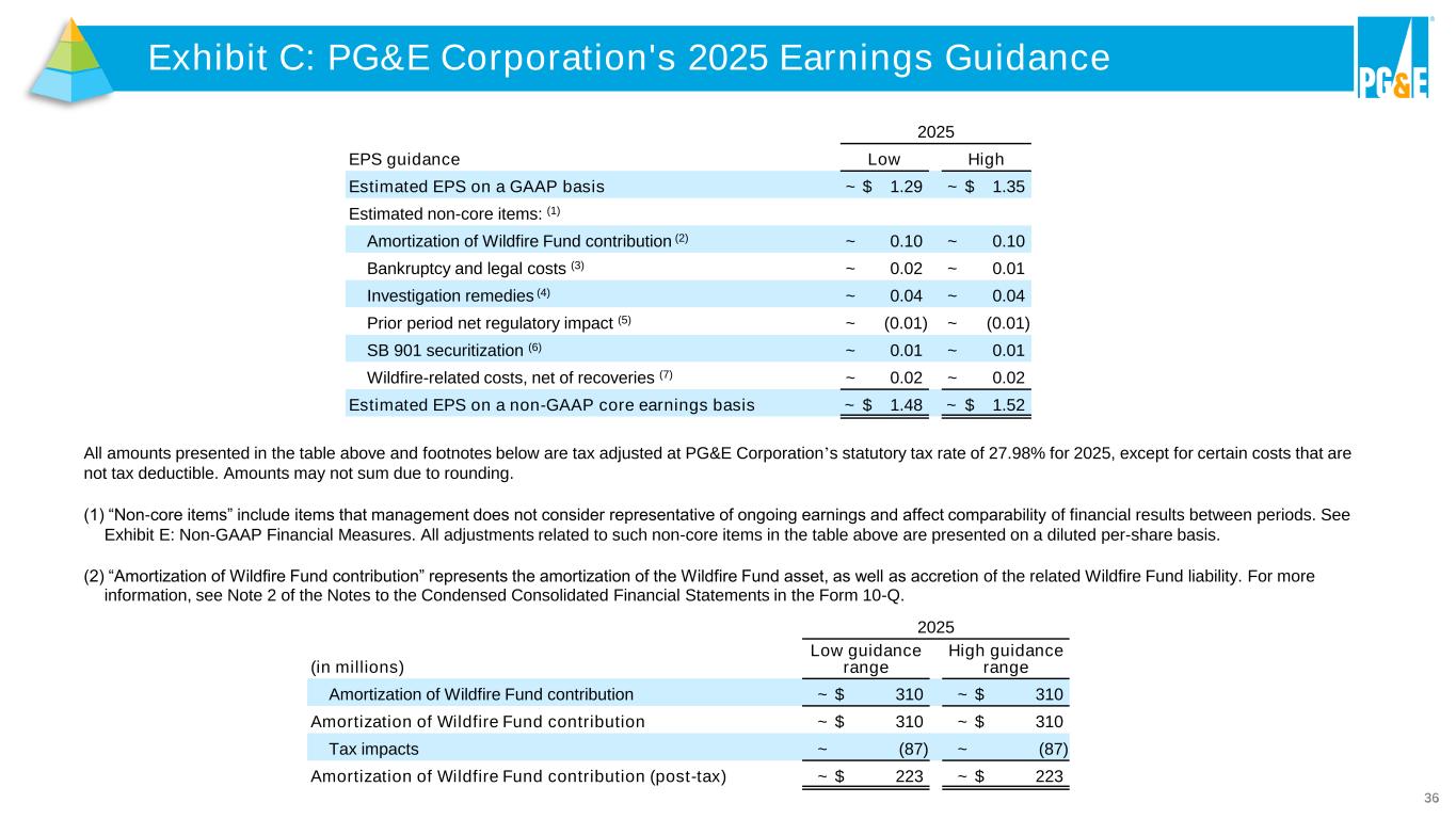 36 2025 EPS guidance Low High Estimated EPS on a GAAP basis ~ $ 1.29 ~ $ 1.35 Estimated non-core items: (1) Amortization of Wildfire Fund contribution (2) ~ 0.10 ~ 0.10 Bankruptcy and legal costs (3) ~ 0.02 ~ 0.01 Investigation remedies (4) ~ 0.04 ~ 0.04 Prior period net regulatory impact (5) ~ (0.01) ~ (0.01) SB 901 securitization (6) ~ 0.01 ~ 0.01 Wildfire-related costs, net of recoveries (7) ~ 0.02 ~ 0.02 Estimated EPS on a non-GAAP core earnings basis ~ $ 1.48 ~ $ 1.52 All amounts presented in the table above and footnotes below are tax adjusted at PG&E Corporation’s statutory tax rate of 27.98% for 2025, except for certain costs that are not tax deductible. Amounts may not sum due to rounding. (1) “Non-core items” include items that management does not consider representative of ongoing earnings and affect comparability of financial results between periods. See Exhibit E: Non-GAAP Financial Measures. All adjustments related to such non-core items in the table above are presented on a diluted per-share basis. 2025 (in millions) Low guidance range High guidance range Amortization of Wildfire Fund contribution ~ $ 310 ~ $ 310 Amortization of Wildfire Fund contribution ~ $ 310 ~ $ 310 Tax impacts ~ (87) ~ (87) Amortization of Wildfire Fund contribution (post-tax) ~ $ 223 ~ $ 223 (2) “Amortization of Wildfire Fund contribution” represents the amortization of the Wildfire Fund asset, as well as accretion of the related Wildfire Fund liability. For more information, see Note 2 of the Notes to the Condensed Consolidated Financial Statements in the Form 10-Q. Exhibit C: PG&E Corporation's 2024 Earnings GuidanceExhibit C: PG&E Corpor tion's 20 5 Earnings Guidance