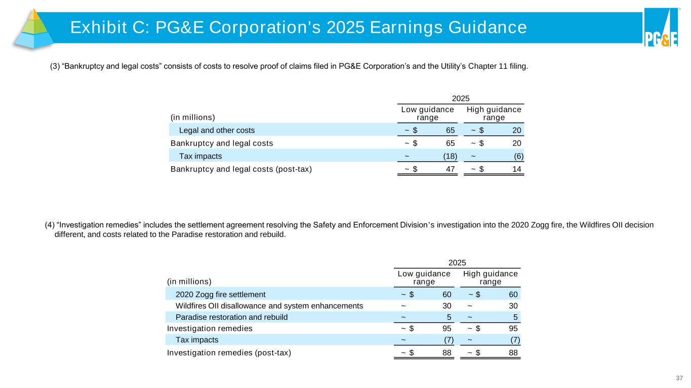 37 Exhibit E: PG&E Corporation's 2020 and 2021 Earnings Guidance(3) “Bankruptcy and legal costs” consists of costs to resolve proof of claims filed in PG&E Corporation’s and the Utility’s Chapter 11 filing. 2025 (in millions) Low guidance range High guidance range Legal and other costs ~ $ 65 ~ $ 20 Bankruptcy and legal costs ~ $ 65 ~ $ 20 Tax impacts ~ (18) ~ (6) Bankruptcy and legal costs (post-tax) ~ $ 47 ~ $ 14 Exhibit C: PG&E Corporation's 2024 Earnings GuidanceExhibit C: PG&E Corpor tion's 20 5 Earnings Guidance (4) “Investigation remedies” includes the settlement agreement resolving the Safety and Enforcement Division’s investigation into the 2020 Zogg fire, the Wildfires OII decision different, and costs related to the Paradise restoration and rebuild. 2025 (in millions) Low guidance range High guidance range 2020 Zogg fire settlement ~ $ 60 ~ $ 60 Wildfires OII disallowance and system enhancements ~ 30 ~ 30 Paradise restoration and rebuild ~ 5 ~ 5 Investigation remedies ~ $ 95 ~ $ 95 Tax impacts ~ (7) ~ (7) Investigation remedies (post-tax) ~ $ 88 ~ $ 88