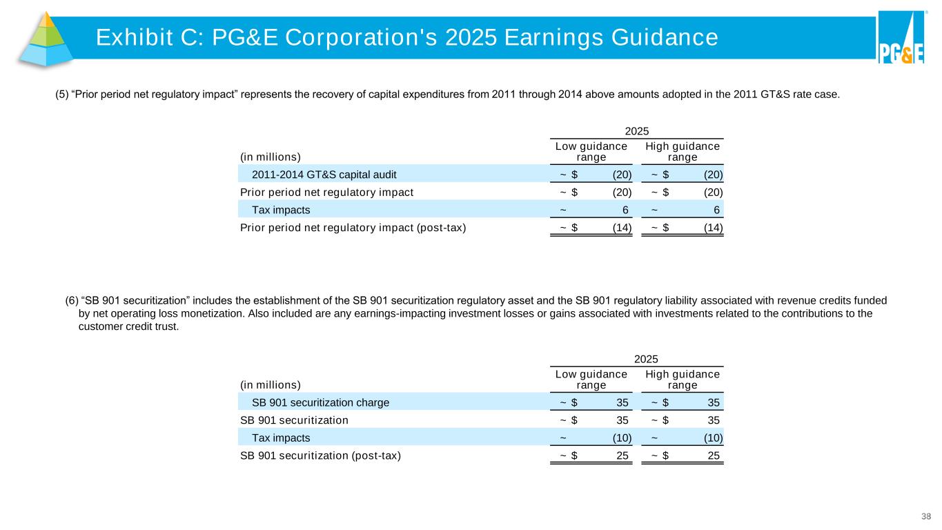 38 (5) “Prior period net regulatory impact” represents the recovery of capital expenditures from 2011 through 2014 above amounts adopted in the 2011 GT&S rate case. 2025 (in millions) Low guidance range High guidance range 2011-2014 GT&S capital audit ~ $ (20) ~ $ (20) Prior period net regulatory impact ~ $ (20) ~ $ (20) Tax impacts ~ 6 ~ 6 Prior period net regulatory impact (post-tax) ~ $ (14) ~ $ (14) Exhibit C: PG&E Corporation's 2024 Earnings GuidanceExhibit C: PG&E Corpor tion's 20 5 Earnings Guidance (6) “SB 901 securitization” includes the establishment of the SB 901 securitization regulatory asset and the SB 901 regulatory liability associated with revenue credits funded by net operating loss monetization. Also included are any earnings-impacting investment losses or gains associated with investments related to the contributions to the customer credit trust. 2025 (in millions) Low guidance range High guidance range SB 901 securitization charge ~ $ 35 ~ $ 35 SB 901 securitization ~ $ 35 ~ $ 35 Tax impacts ~ (10) ~ (10) SB 901 securitization (post-tax) ~ $ 25 ~ $ 25