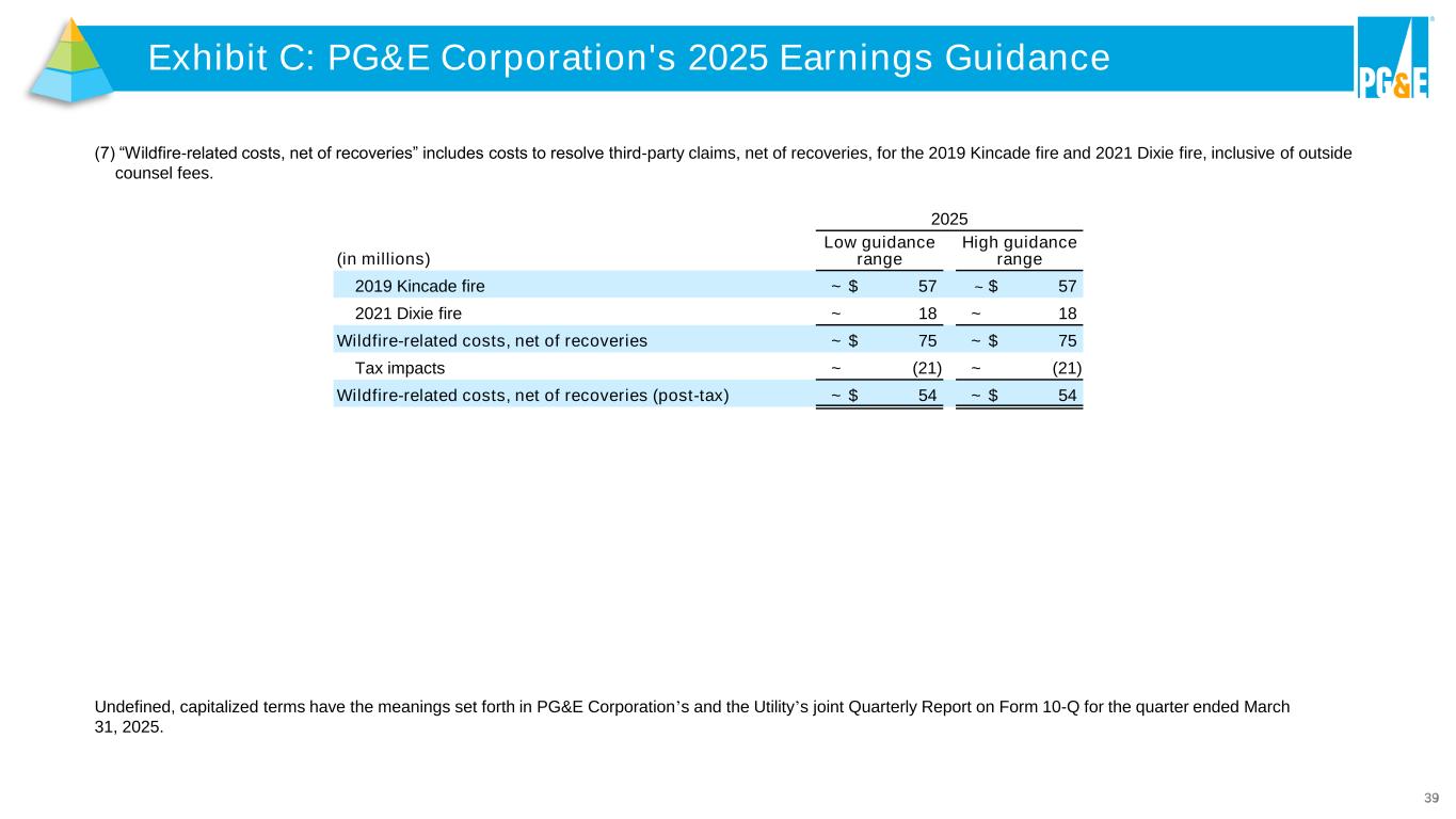 39 Undefined, capitalized terms have the meanings set forth in PG&E Corporation’s and the Utility’s joint Quarterly Report on Form 10-Q for the quarter ended March 31, 2025. (7) “Wildfire-related costs, net of recoveries” includes costs to resolve third-party claims, net of recoveries, for the 2019 Kincade fire and 2021 Dixie fire, inclusive of outside counsel fees. 2025 (in millions) Low guidance range High guidance range 2019 Kincade fire ~ $ 57 ~ $ 57 2021 Dixie fire ~ 18 ~ 18 Wildfire-related costs, net of recoveries ~ $ 75 ~ $ 75 Tax impacts ~ (21) ~ (21) Wildfire-related costs, net of recoveries (post-tax) ~ $ 54 ~ $ 54 Exhibit C: PG&E Corporation's 2024 Earnings GuidanceExhibit C: PG&E Corpor tion's 20 5 Earnings Guidance