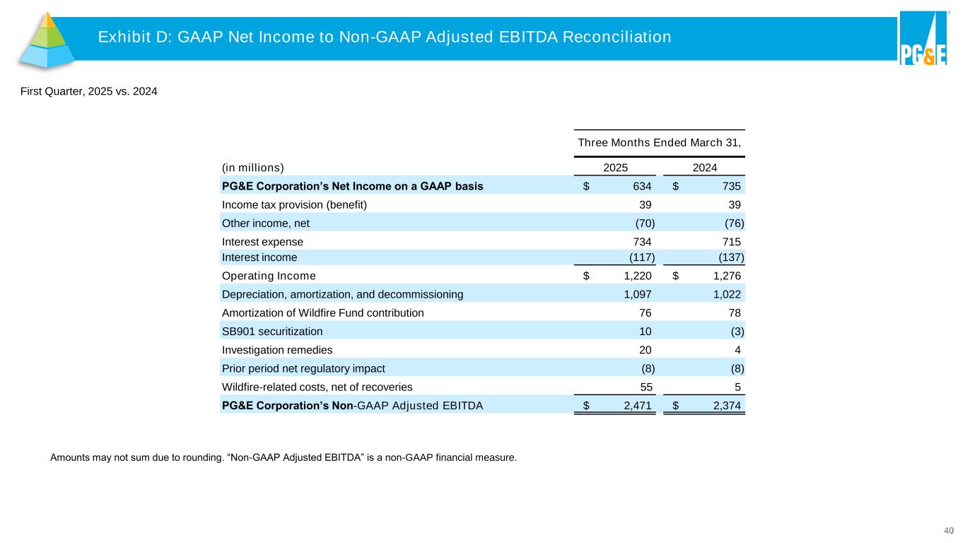 40 Three Months Ended March 31, (in millions) 2025 2024 PG&E Corporation’s Net Income on a GAAP basis $ 634 $ 735 Income tax provision (benefit) 39 39 Other income, net (70) (76) Interest expense 734 715 Interest income (117) (137) Operating Income $ 1,220 $ 1,276 Depreciation, amortization, and decommissioning 1,097 1,022 Amortization of Wildfire Fund contribution 76 78 SB901 securitization 10 (3) Investigation remedies 20 4 Prior period net regulatory impact (8) (8) Wildfire-related costs, net of recoveries 55 5 PG&E Corporation’s Non-GAAP Adjusted EBITDA $ 2,471 $ 2,374 First Quarter, 2025 vs. 2024 Amounts may not sum due to rounding. “Non-GAAP Adjusted EBITDA” is a non-GAAP financial measure. Exhibit D: GAAP Net Income to Non-GAAP Adjusted EBITDA Reconciliation PG&E CorporationExhibit D: GAAP Net Income to Non-GAAP Adjusted EBITDA Reconciliation