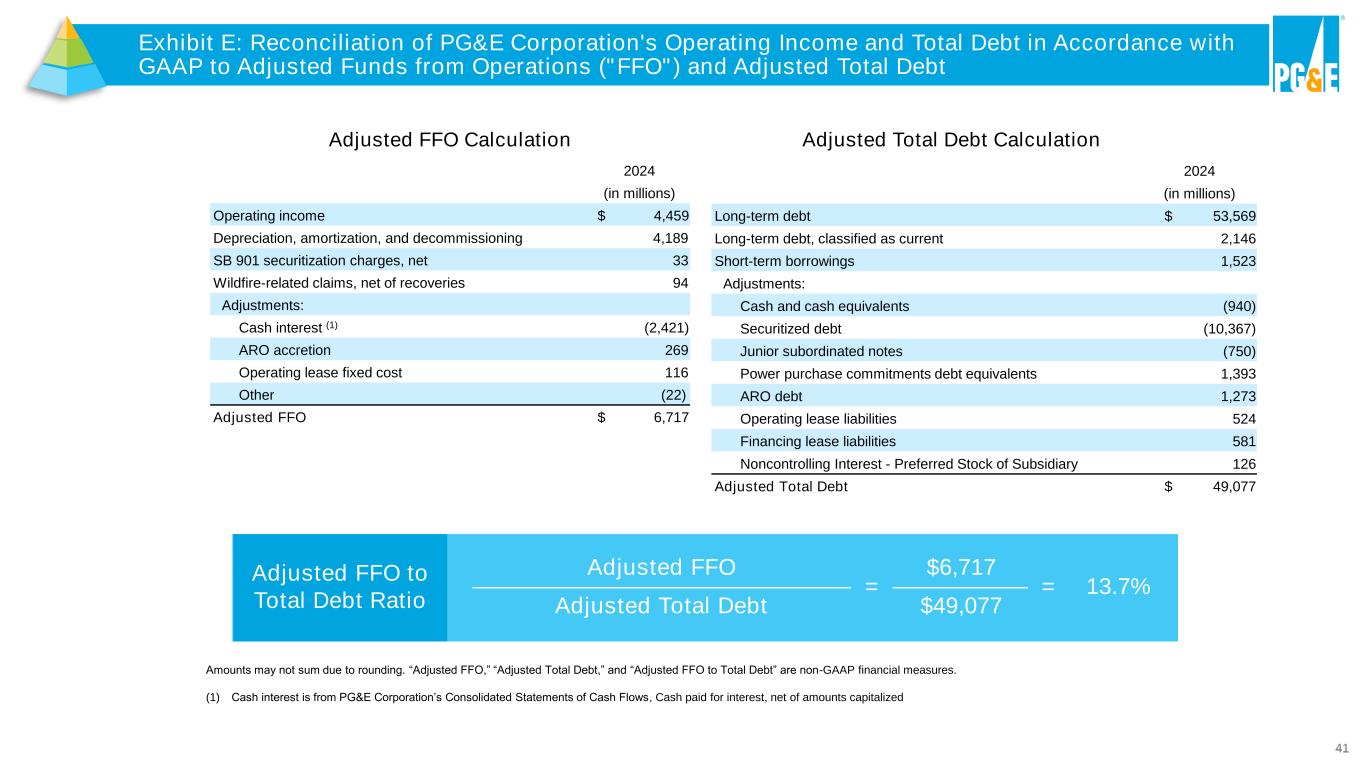 41 Exhibit C: PG&E Corporation's 2024 Earnings GuidanceExhibit E: Reconciliation of PG&E Corporation's Operating Income and Total Debt in Accordance with GAAP to Adjusted Funds from Operations ("FFO") and Adjusted Total Debt 2024 (in millions) Operating income $ 4,459 Depreciation, amortization, and decommissioning 4,189 SB 901 securitization charges, net 33 Wildfire-related claims, net of recoveries 94 Adjustments: Cash interest (1) (2,421) ARO accretion 269 Operating lease fixed cost 116 Other (22) Adjusted FFO $ 6,717 2024 (in millions) Long-term debt $ 53,569 Long-term debt, classified as current 2,146 Short-term borrowings 1,523 Adjustments: Cash and cash equivalents (940) Securitized debt (10,367) Junior subordinated notes (750) Power purchase commitments debt equivalents 1,393 ARO debt 1,273 Operating lease liabilities 524 Financing lease liabilities 581 Noncontrolling Interest - Preferred Stock of Subsidiary 126 Adjusted Total Debt $ 49,077 Adjusted FFO Calculation Adjusted Total Debt Calculation Adjusted FFO = $6,717 = 13.7% Adjusted Total Debt $49,077 Adjusted FFO to Total Debt Ratio Amounts may not sum due to rounding. “Adjusted FFO,” “Adjusted Total Debt,” and “Adjusted FFO to Total Debt” are non-GAAP financial measures. (1) Cash interest is from PG&E Corporation’s Consolidated Statements of Cash Flows, Cash paid for interest, net of amounts capitalized