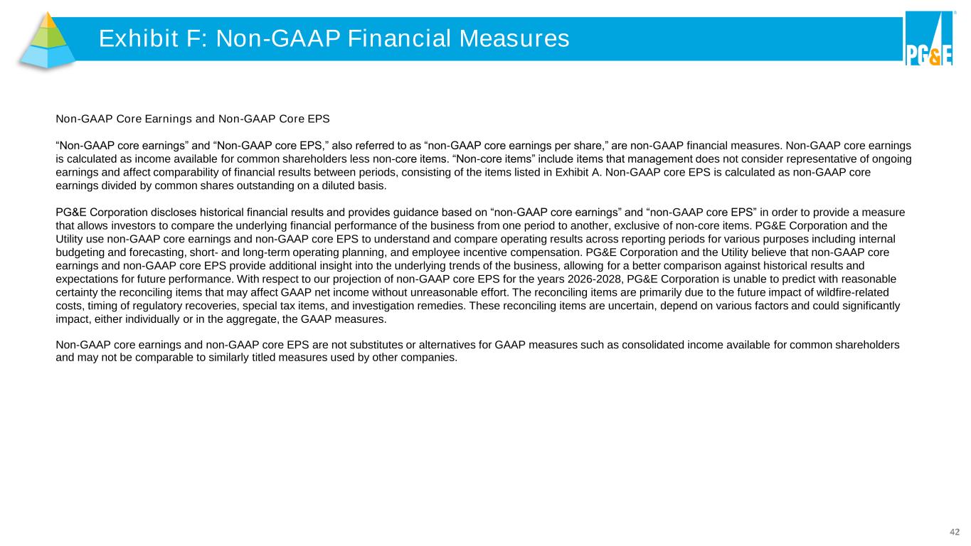 42 Non-GAAP Core Earnings and Non-GAAP Core EPS “Non-GAAP core earnings” and “Non-GAAP core EPS,” also referred to as “non-GAAP core earnings per share,” are non-GAAP financial measures. Non-GAAP core earnings is calculated as income available for common shareholders less non-core items. “Non-core items” include items that management does not consider representative of ongoing earnings and affect comparability of financial results between periods, consisting of the items listed in Exhibit A. Non-GAAP core EPS is calculated as non-GAAP core earnings divided by common shares outstanding on a diluted basis. PG&E Corporation discloses historical financial results and provides guidance based on “non-GAAP core earnings” and “non-GAAP core EPS” in order to provide a measure that allows investors to compare the underlying financial performance of the business from one period to another, exclusive of non-core items. PG&E Corporation and the Utility use non-GAAP core earnings and non-GAAP core EPS to understand and compare operating results across reporting periods for various purposes including internal budgeting and forecasting, short- and long-term operating planning, and employee incentive compensation. PG&E Corporation and the Utility believe that non-GAAP core earnings and non-GAAP core EPS provide additional insight into the underlying trends of the business, allowing for a better comparison against historical results and expectations for future performance. With respect to our projection of non-GAAP core EPS for the years 2026-2028, PG&E Corporation is unable to predict with reasonable certainty the reconciling items that may affect GAAP net income without unreasonable effort. The reconciling items are primarily due to the future impact of wildfire-related costs, timing of regulatory recoveries, special tax items, and investigation remedies. These reconciling items are uncertain, depend on various factors and could significantly impact, either individually or in the aggregate, the GAAP measures. Non-GAAP core earnings and non-GAAP core EPS are not substitutes or alternatives for GAAP measures such as consolidated income available for common shareholders and may not be comparable to similarly titled measures used by other companies. Exhibit F: Non-GAAP Financial Measures Exhibit E: PG&E Corporation's 2020 and 2021 Earnings Guidance
