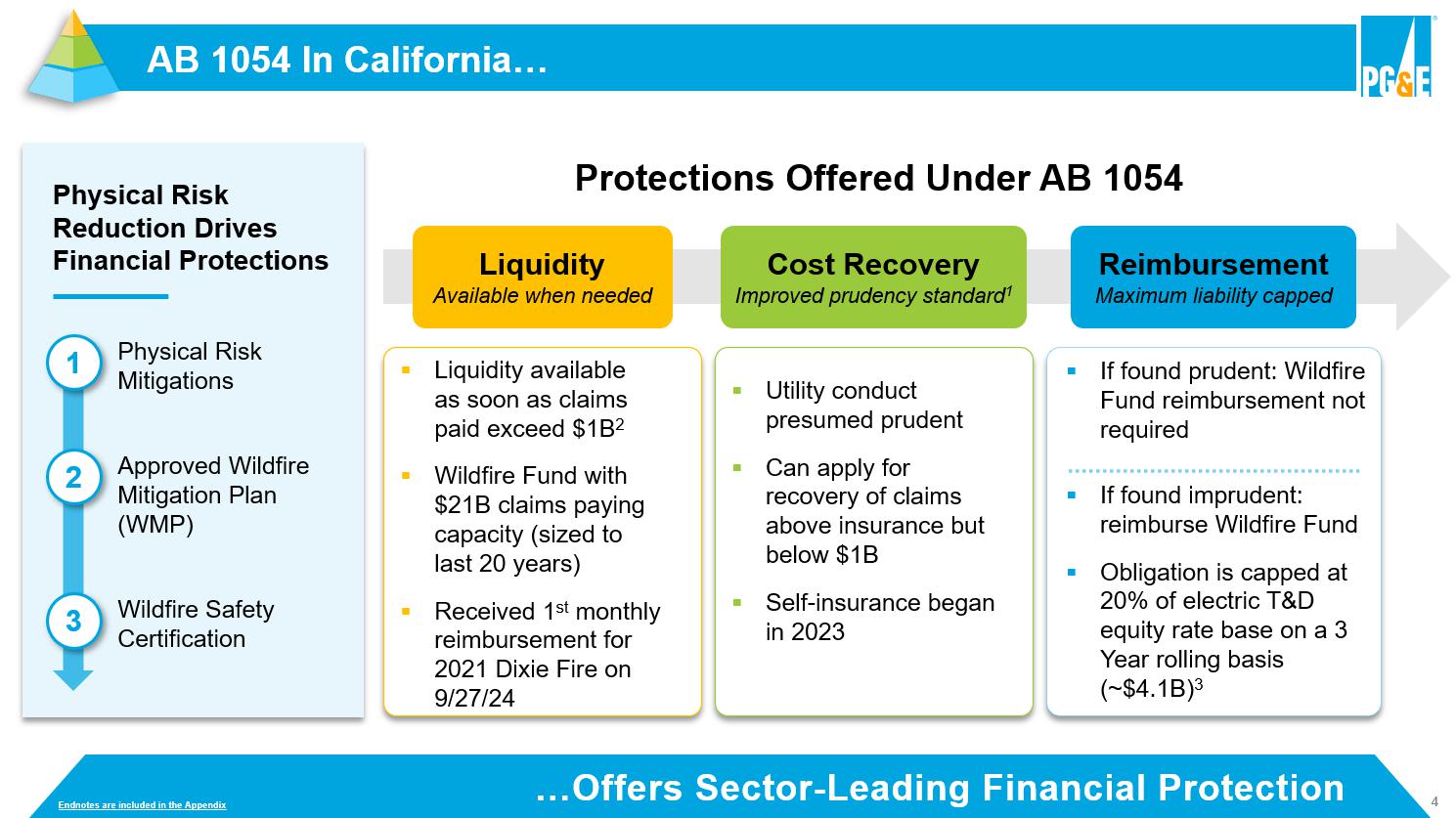2 This presentation contains statements regarding PG&E Corporation’s and Pacific Gas and Electric Company’s (the “Utility”) fut ure performance, including expectations, objectives, and forecasts about rate base growth, capital expenditures, cost savings, and customer bills. These statements and other statements that are not purely historical constitute forward - lookin g statements that are necessarily subject to various risks and uncertainties. Actual results may differ materially from those described in forward - loo king statements. PG&E Corporation and the Utility are not able to predict all the factors that may affect future results. Factors that could cause actual results to differ materially include, but are no t limited to, risks and uncertainties associated with: • wildfires that have occurred or may occur in the Utility’s service area , including the extent of the Utility’s liability in connection with the 2019 Kincade fire, the 2021 Dixie fire, the 2022 Mosquito fire, and future wildfires; • the Utility’s ability to recover wildfire - related costs, including costs for the 2021 Dixie fire, from the Wildfire Fund (includ ing the Utility’s maintenance of a valid safety certificate and whether the Wildfire Fund has sufficient remaining funds) and through the WEMA and FERC TO rate cases; • the Utility’s implementation of its wildfire mitigation programs, including PSPS, EPSS, situational awareness and response, t he undergrounding initiative, and the programs’ effectiveness; • the Utility’s ability to safely and reliably operate, maintain, construct, and decommission its facilities; • changes in the electric power and natural gas industries driven by technological advancements and a decarbonized economy; • a cyber incident, cybersecurity breach, or physical attack; • severe weather events, extended drought, and climate change, particularly their impact on the likelihood and severity of wild fir es; • the impact of legislative and regulatory developments, including those regarding wildfires, the environment, California’s cle an energy goals, the nuclear industry, extended operations at Diablo Canyon nuclear power plant, regulation of utilities’ transactions with their affiliates, municipalization, privacy, and taxes ; • the timing and outcome of FERC and CPUC proceedings, including regarding ratemaking, cost recovery , and other matters; • the outcome of self - reports, agency compliance reports, investigations, or other enforcement actions; • PG&E Corporation and the Utility’s substantial indebtedness, which may adversely affect their financial health and limit thei r o perating flexibility; • the timing and outcome of PG&E Corporation’s and the Utility’s litigation, including securities class action claims, and wild fir e - related litigation; • the Utility’s ability to manage its costs effectively, timely recover costs through rates, and achieve projected savings and the extent of excess unrecoverable costs; • the tax treatment of certain assets and liabilities, including whether PG&E Corporation or the Utility undergoes an “ownershi p c hange” that limits certain tax attributes; • the impact of growing distributed and renewable generation resources, and changing customer demand for its natural gas and el ect ric services; and • the other factors disclosed in PG&E Corporation’s and the Utility’s joint Annual Report on Form 10 - K for the year ended December 31, 2023, their joint Quarterly Report on Form 10 - Q for the quarter ended June 30, 2024 (the “Form 10 - Q”), and other reports filed with the SEC, which are available on PG&E Corporation’s w ebsite at www.pgecorp.com and on the SEC’s website at www.sec.gov. Undefined, capitalized terms have the meanings set forth in the Form 10 - Q. Unless otherwise indicated, the statements in this pr esentation are made as of October 1, 2024. PG&E Corporation and the Utility undertake no obligation to update information contained herein. This presentation was attached to PG&E Corporation’s and the Utility’s joint Current Report on Form 8 - K that was furnished to the SEC on October 1, 2024, and is also available on PG&E Corporation’s website at www.pgecorp.com. Forward - Looking Statements