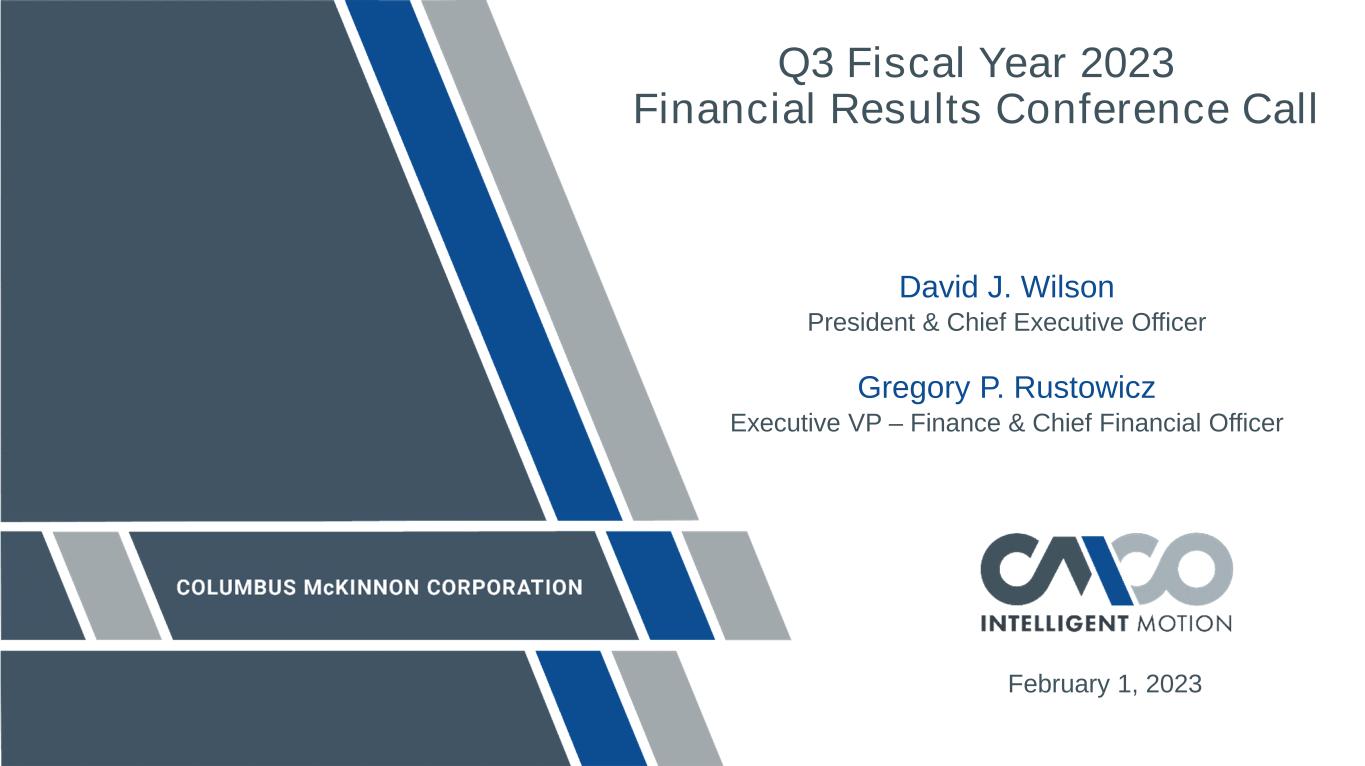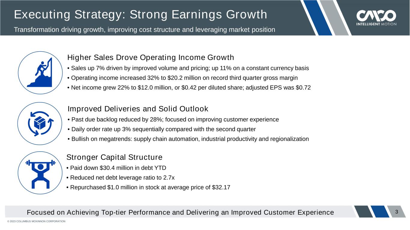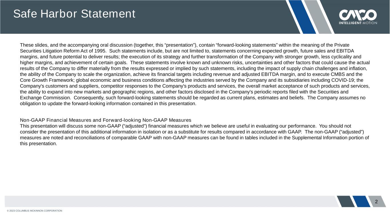 © 2023 COLUMBUS MCKINNON CORPORATION These slides, and the accompanying oral discussion (together, this “presentation”), contain “forward-looking statements” within the meaning of the Private Securities Litigation Reform Act of 1995. Such statements include, but are not limited to, statements concerning expected growth, future sales and EBITDA margins, and future potential to deliver results; the execution of its strategy and further transformation of the Company with stronger growth, less cyclicality and higher margins, and achievement of certain goals. These statements involve known and unknown risks, uncertainties and other factors that could cause the actual results of the Company to differ materially from the results expressed or implied by such statements, including the impact of supply chain challenges and inflation, the ability of the Company to scale the organization, achieve its financial targets including revenue and adjusted EBITDA margin, and to execute CMBS and the Core Growth Framework; global economic and business conditions affecting the industries served by the Company and its subsidiaries including COVID-19; the Company's customers and suppliers, competitor responses to the Company's products and services, the overall market acceptance of such products and services, the ability to expand into new markets and geographic regions, and other factors disclosed in the Company's periodic reports filed with the Securities and Exchange Commission. Consequently, such forward-looking statements should be regarded as current plans, estimates and beliefs. The Company assumes no obligation to update the forward-looking information contained in this presentation. Non-GAAP Financial Measures and Forward-looking Non-GAAP Measures This presentation will discuss some non-GAAP (“adjusted”) financial measures which we believe are useful in evaluating our performance. You should not consider the presentation of this additional information in isolation or as a substitute for results compared in accordance with GAAP. The non-GAAP (“adjusted”) measures are noted and reconciliations of comparable GAAP with non-GAAP measures can be found in tables included in the Supplemental Information portion of this presentation. Safe Harbor Statement 2