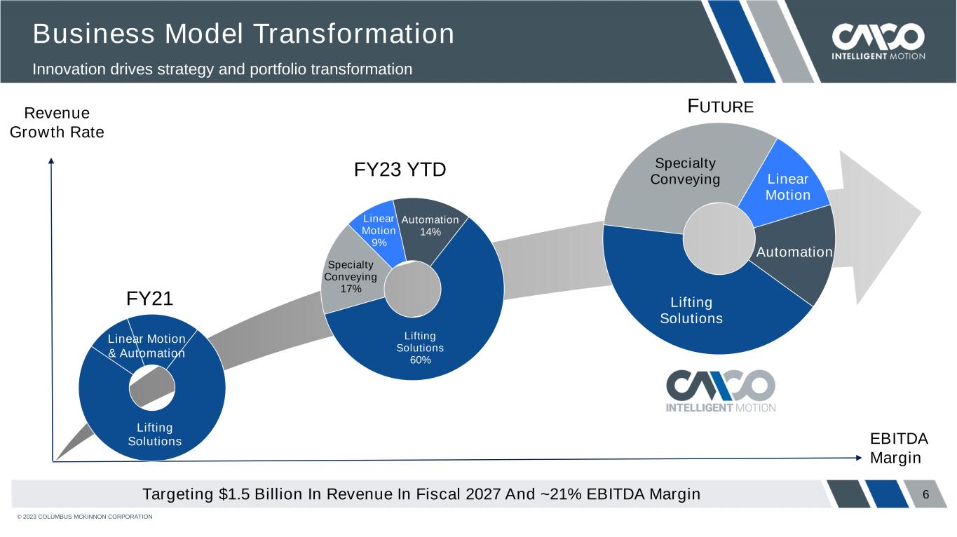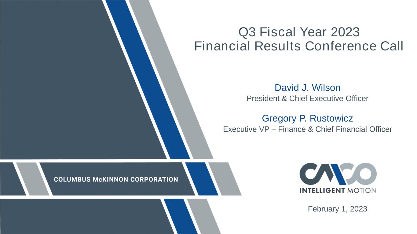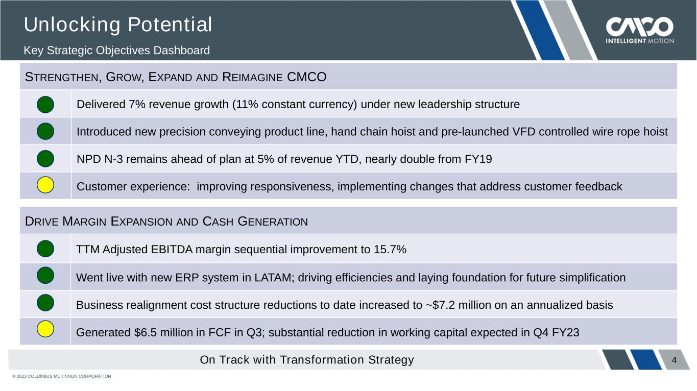 © 2023 COLUMBUS MCKINNON CORPORATION These slides, and the accompanying oral discussion (together, this “presentation”), contain “forward-looking statements” within the meaning of the Private Securities Litigation Reform Act of 1995. Such statements include, but are not limited to, statements concerning expected growth, future sales and EBITDA margins, and future potential to deliver results; the execution of its strategy and further transformation of the Company with stronger growth, less cyclicality and higher margins, and achievement of certain goals. These statements involve known and unknown risks, uncertainties and other factors that could cause the actual results of the Company to differ materially from the results expressed or implied by such statements, including the impact of supply chain challenges and inflation, the ability of the Company to scale the organization, achieve its financial targets including revenue and adjusted EBITDA margin, and to execute CMBS and the Core Growth Framework; global economic and business conditions affecting the industries served by the Company and its subsidiaries including COVID-19; the Company's customers and suppliers, competitor responses to the Company's products and services, the overall market acceptance of such products and services, the ability to expand into new markets and geographic regions, and other factors disclosed in the Company's periodic reports filed with the Securities and Exchange Commission. Consequently, such forward-looking statements should be regarded as current plans, estimates and beliefs. The Company assumes no obligation to update the forward-looking information contained in this presentation. Non-GAAP Financial Measures and Forward-looking Non-GAAP Measures This presentation will discuss some non-GAAP (“adjusted”) financial measures which we believe are useful in evaluating our performance. You should not consider the presentation of this additional information in isolation or as a substitute for results compared in accordance with GAAP. The non-GAAP (“adjusted”) measures are noted and reconciliations of comparable GAAP with non-GAAP measures can be found in tables included in the Supplemental Information portion of this presentation. Safe Harbor Statement 2