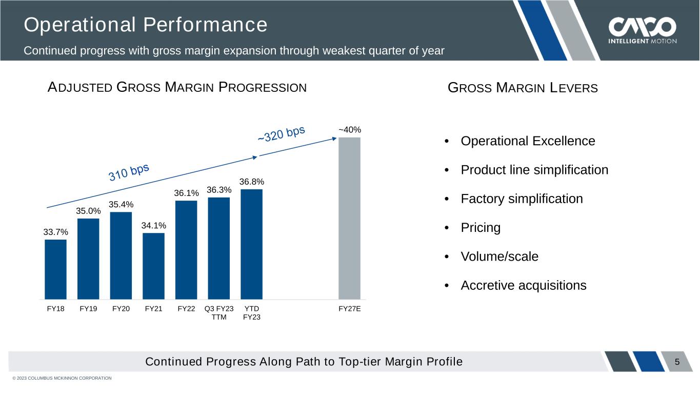 © 2023 COLUMBUS MCKINNON CORPORATION 4 Unlocking Potential Key Strategic Objectives Dashboard On Track with Transformation Strategy STRENGTHEN, GROW, EXPAND AND REIMAGINE CMCO Delivered 7% revenue growth (11% constant currency) under new leadership structure Introduced new precision conveying product line, hand chain hoist and pre-launched VFD controlled wire rope hoist NPD N-3 remains ahead of plan at 5% of revenue YTD, nearly double from FY19 Customer experience: improving responsiveness, implementing changes that address customer feedback DRIVE MARGIN EXPANSION AND CASH GENERATION TTM Adjusted EBITDA margin sequential improvement to 15.7% Went live with new ERP system in LATAM; driving efficiencies and laying foundation for future simplification Business realignment cost structure reductions to date increased to ~$7.2 million on an annualized basis Generated $6.5 million in FCF in Q3; substantial reduction in working capital expected in Q4 FY23