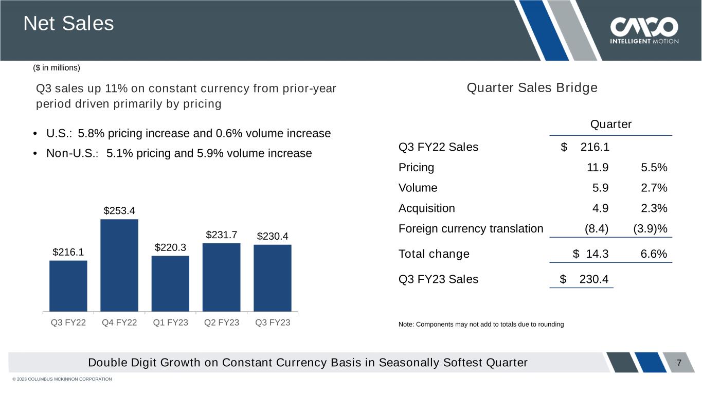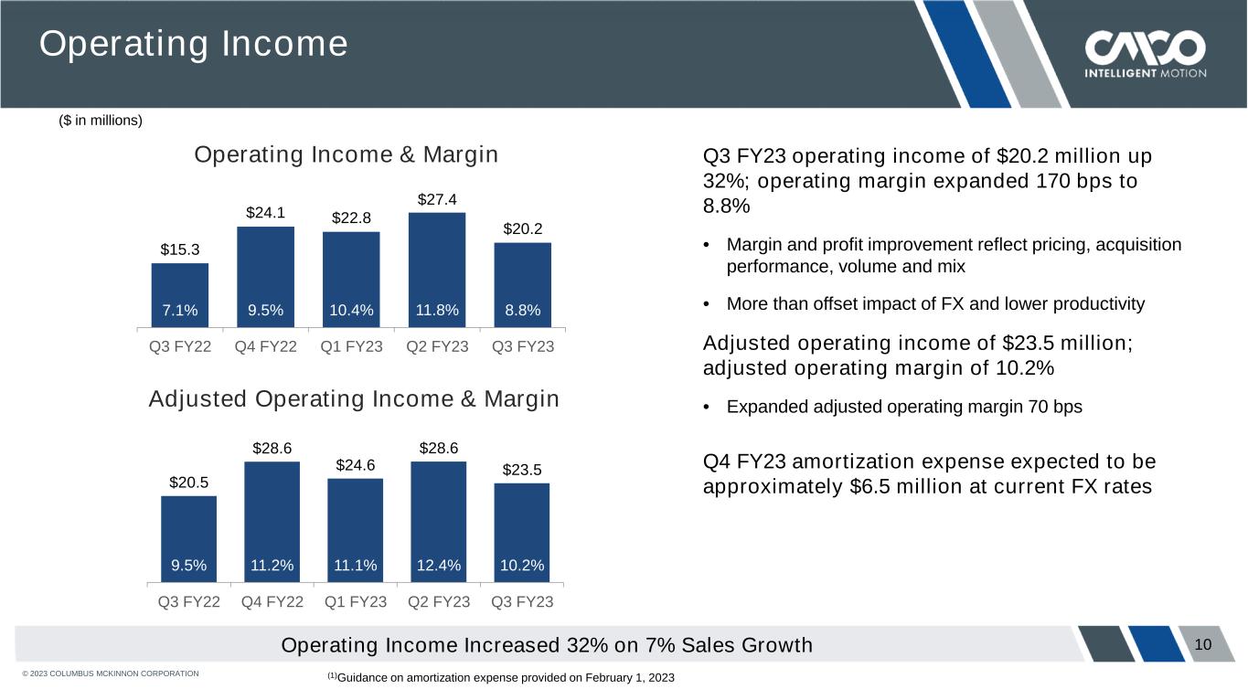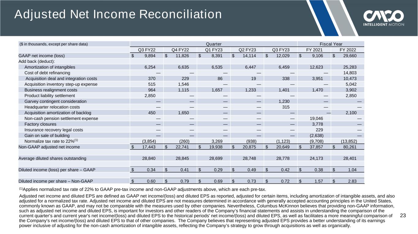 © 2023 COLUMBUS MCKINNON CORPORATION 22 Adjusted Income from Operations Reconciliation Adjusted income from operations is defined as income from operations as reported, adjusted for certain items. Adjusted income from operations is not a measure determined in accordance with generally accepted accounting principles in the United States, commonly known as GAAP, and may not be comparable with the measures as used by other companies. Nevertheless, Columbus McKinnon believes that providing non-GAAP information, such as adjusted income from operations, is important for investors and other readers of the Company’s financial statements and assists in understanding the comparison of the current quarter’s and current year's income from operations to the historical periods' income from operations, as well as facilitates a more meaningful comparison of the Company’s income from operations to that of other companies. ($ in thousands) Quarter Fiscal Year Q3 FY22 Q4 FY22 Q1 FY23 Q2 FY23 Q3 FY23 2021 2022 GAAP income from operations $ 15,316 $ 24,059 $ 22,817 $ 27,372 $ 20,179 $ 42,255 $ 73,781 Add back (deduct): Acquisition deal and integration costs 370 229 86 19 338 3,951 10,473 Acquisition inventory step-up expense 515 1,546 — — — — 5,042 Business realignment costs 964 1,115 1,657 1,233 1,401 1,470 3,902 Garvey contingent consideration — — — — 1,230 — — Product liability settlement 2,850 — — — — — 2,850 Headquarter relocation costs — — — — 315 — — Acquisition amortization of backlog 450 1,650 — — — — 2,100 Factory closures — — — — — 3,778 — Insurance recovery legal costs — — — — — 229 — Gain on sale of building — — — — — (2,638) — Non-GAAP adjusted income from operations $ 20,465 $ 28,599 $ 24,560 $ 28,624 $ 23,463 $ 49,045 $ 98,148 Sales $ 216,088 $ 253,368 $ 220,287 $ 231,740 $ 230,370 $ 649,642 $ 906,555 Add back: Acquisition amortization of backlog 450 1,650 — — — — 2,100 Non-GAAP sales $ 216,538 $ 255,018 $ 220,287 $ 231,740 $ 230,370 $ 649,642 $ 908,655 Operating margin – GAAP 7.1% 9.5% 10.4% 11.8% 8.8% 6.5% 8.1% Adjusted operating margin – Non-GAAP 9.5% 11.2% 11.1% 12.4% 10.2% 7.5% 10.8%