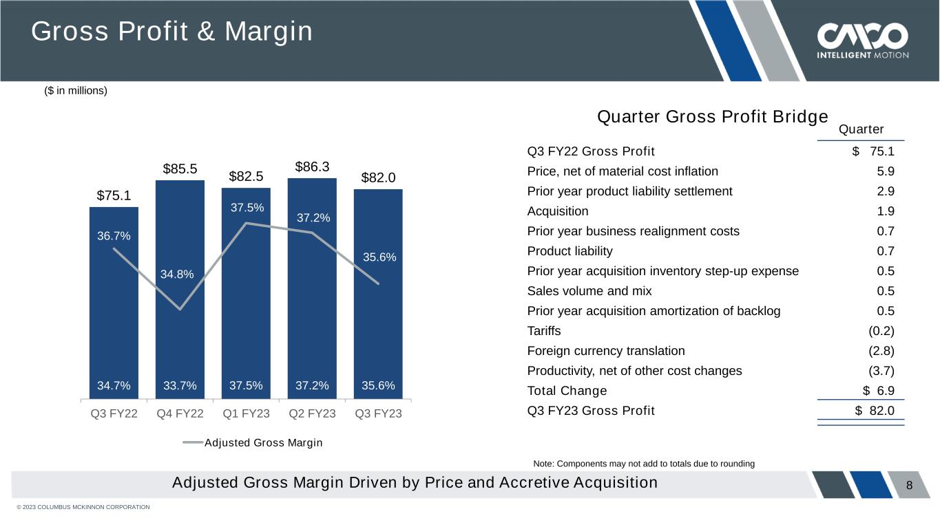 © 2023 COLUMBUS MCKINNON CORPORATION Net Sales Double Digit Growth on Constant Currency Basis in Seasonally Softest Quarter Quarter Sales Bridge • U.S.: 5.8% pricing increase and 0.6% volume increase • Non-U.S.: 5.1% pricing and 5.9% volume increase 7 Quarter Q3 FY22 Sales $ 216.1 Pricing 11.9 5.5% Volume 5.9 2.7% Acquisition 4.9 2.3% Foreign currency translation (8.4) (3.9)% Total change $ 14.3 6.6% Q3 FY23 Sales $ 230.4 Q3 sales up 11% on constant currency from prior-year period driven primarily by pricing $216.1 $253.4 $220.3 $231.7 $230.4 Q3 FY22 Q4 FY22 Q1 FY23 Q2 FY23 Q3 FY23 ($ in millions) Note: Components may not add to totals due to rounding