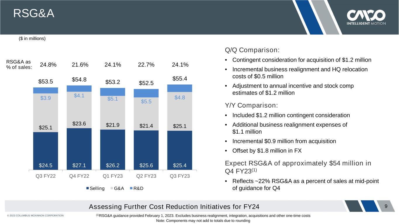 © 2023 COLUMBUS MCKINNON CORPORATION 8 Gross Profit & Margin Quarter Gross Profit Bridge Quarter Q3 FY22 Gross Profit $ 75.1 Price, net of material cost inflation 5.9 Prior year product liability settlement 2.9 Acquisition 1.9 Prior year business realignment costs 0.7 Product liability 0.7 Prior year acquisition inventory step-up expense 0.5 Sales volume and mix 0.5 Prior year acquisition amortization of backlog 0.5 Tariffs (0.2) Foreign currency translation (2.8) Productivity, net of other cost changes (3.7) Total Change $ 6.9 Q3 FY23 Gross Profit $ 82.0 Adjusted Gross Margin Driven by Price and Accretive Acquisition $75.1 $85.5 $82.5 $86.3 $82.0 34.7% 33.7% 37.5% 37.2% 35.6% 36.7% 34.8% 37.5% 37.2% 35.6% Q3 FY22 Q4 FY22 Q1 FY23 Q2 FY23 Q3 FY23 Adjusted Gross Margin ($ in millions) Note: Components may not add to totals due to rounding