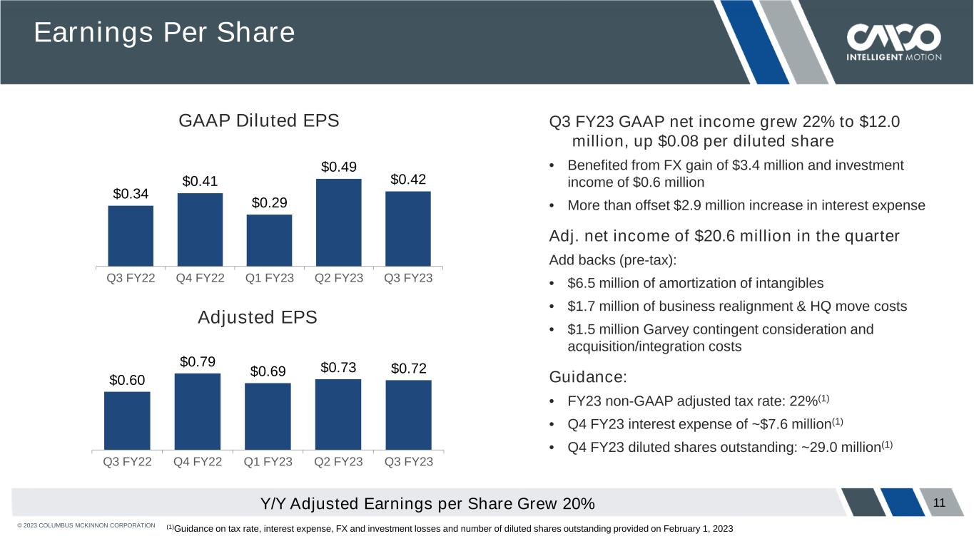© 2023 COLUMBUS MCKINNON CORPORATION 10 Operating Income Q3 FY23 operating income of $20.2 million up 32%; operating margin expanded 170 bps to 8.8% • Margin and profit improvement reflect pricing, acquisition performance, volume and mix • More than offset impact of FX and lower productivity Adjusted operating income of $23.5 million; adjusted operating margin of 10.2% • Expanded adjusted operating margin 70 bps Q4 FY23 amortization expense expected to be approximately $6.5 million at current FX rates Operating Income Increased 32% on 7% Sales Growth Operating Income & Margin Adjusted Operating Income & Margin $20.5 $28.6 $24.6 $28.6 $23.5 9.5% 11.2% 11.1% 12.4% 10.2% Q3 FY22 Q4 FY22 Q1 FY23 Q2 FY23 Q3 FY23 $15.3 $24.1 $22.8 $27.4 $20.2 7.1% 9.5% 10.4% 11.8% 8.8% Q3 FY22 Q4 FY22 Q1 FY23 Q2 FY23 Q3 FY23 ($ in millions) (1)Guidance on amortization expense provided on February 1, 2023