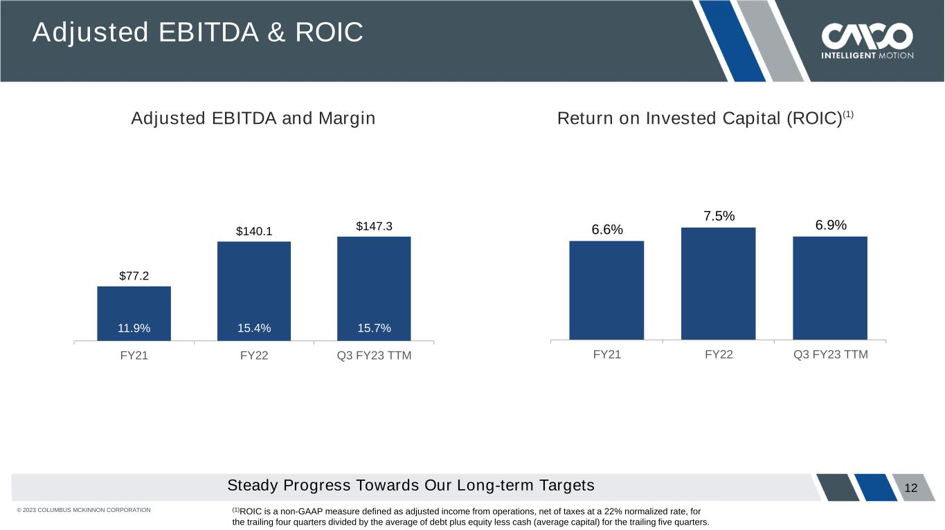 © 2023 COLUMBUS MCKINNON CORPORATION $0.34 $0.41 $0.29 $0.49 $0.42 Q3 FY22 Q4 FY22 Q1 FY23 Q2 FY23 Q3 FY23 11 Earnings Per Share Adjusted EPS GAAP Diluted EPS $0.60 $0.79 $0.69 $0.73 $0.72 Q3 FY22 Q4 FY22 Q1 FY23 Q2 FY23 Q3 FY23 Q3 FY23 GAAP net income grew 22% to $12.0 million, up $0.08 per diluted share • Benefited from FX gain of $3.4 million and investment income of $0.6 million • More than offset $2.9 million increase in interest expense Adj. net income of $20.6 million in the quarter Add backs (pre-tax): • $6.5 million of amortization of intangibles • $1.7 million of business realignment & HQ move costs • $1.5 million Garvey contingent consideration and acquisition/integration costs Guidance: • FY23 non-GAAP adjusted tax rate: 22%(1) • Q4 FY23 interest expense of ~$7.6 million(1) • Q4 FY23 diluted shares outstanding: ~29.0 million(1) (1)Guidance on tax rate, interest expense, FX and investment losses and number of diluted shares outstanding provided on February 1, 2023 Y/Y Adjusted Earnings per Share Grew 20%